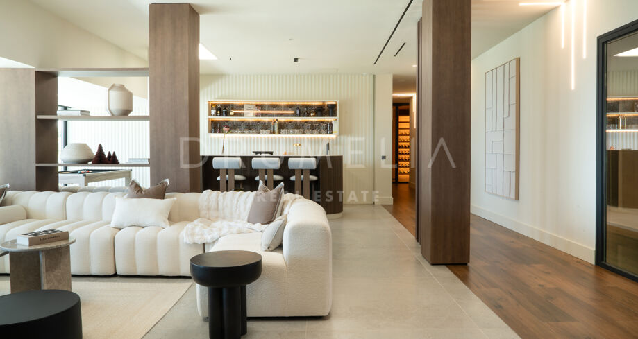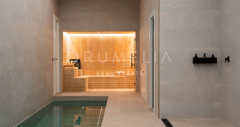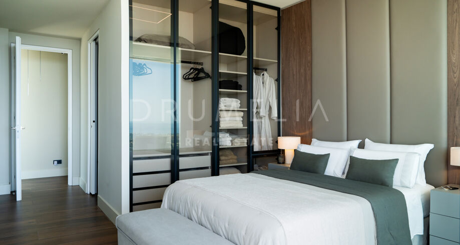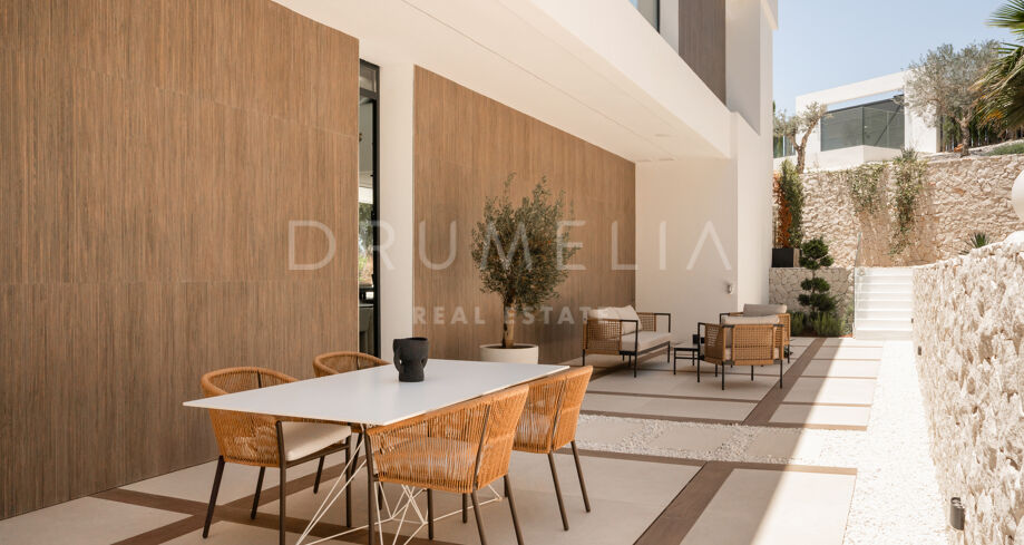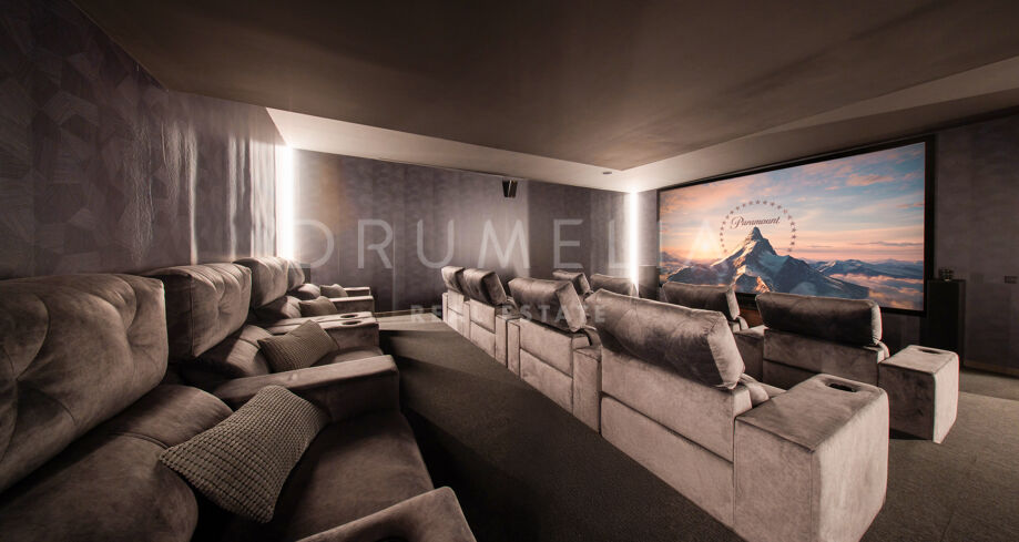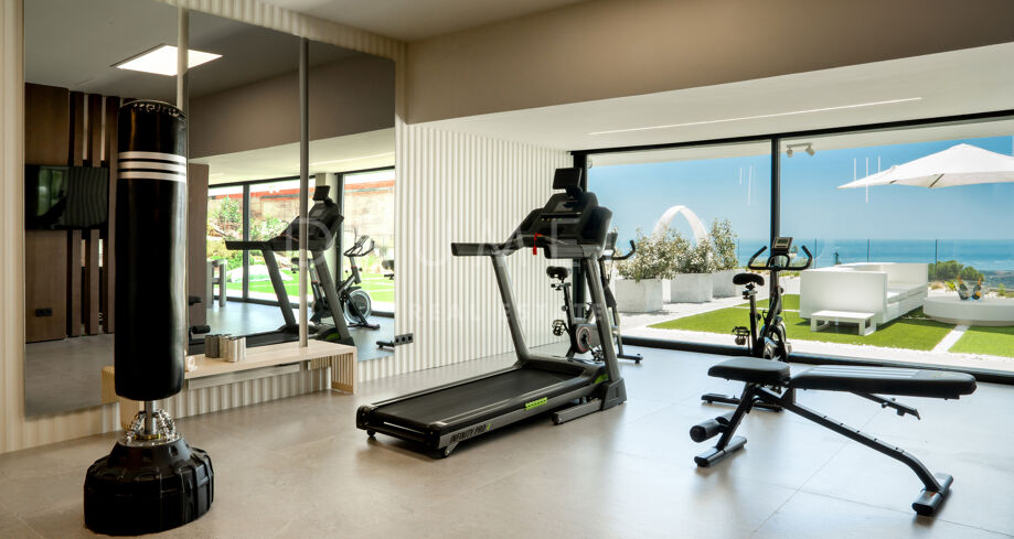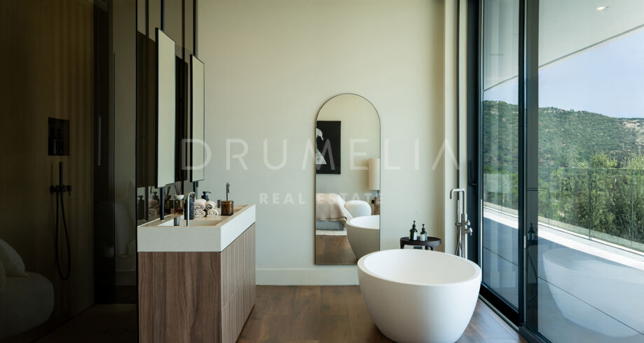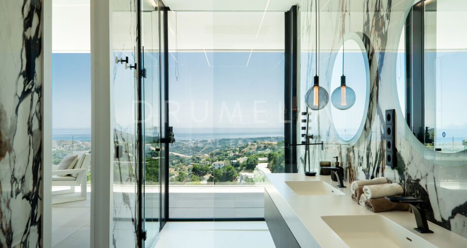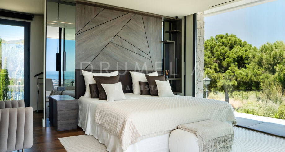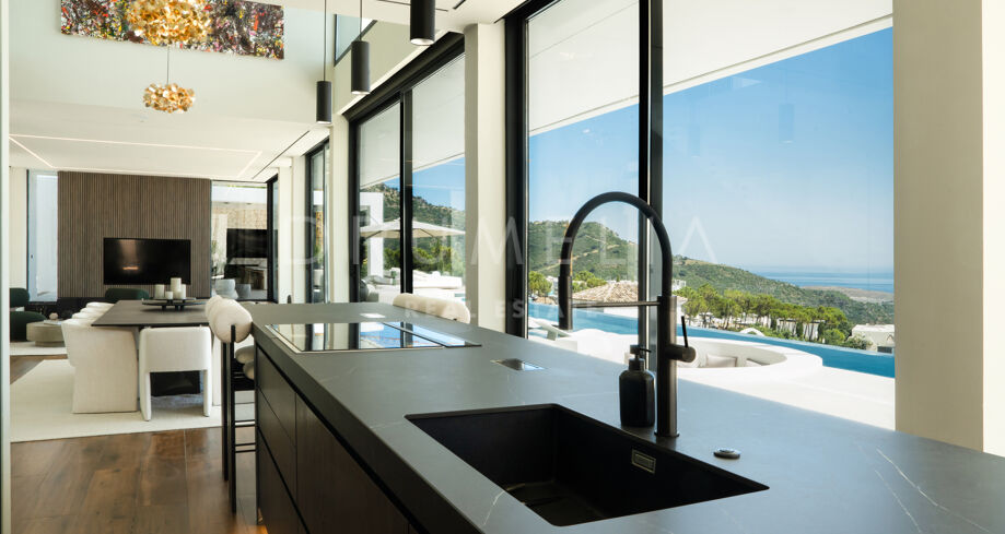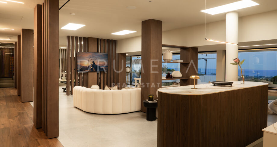 На участке площадью 2.068 м² расположено 872 м² жилой площади, спроектированной для максимального комфорта, приватности и естественного освещения. Главный этаж включает просторные помещения открытой планировки с панорамными окнами от пола до потолка, которые открывают захватывающий вид на Средиземное море и горы. Заниженная гостиная и столовая с двойной высотой потолков подчеркивают современный характер виллы, а система “умный дом” обеспечивает полный контроль над освещением, климатом и безопасностью.