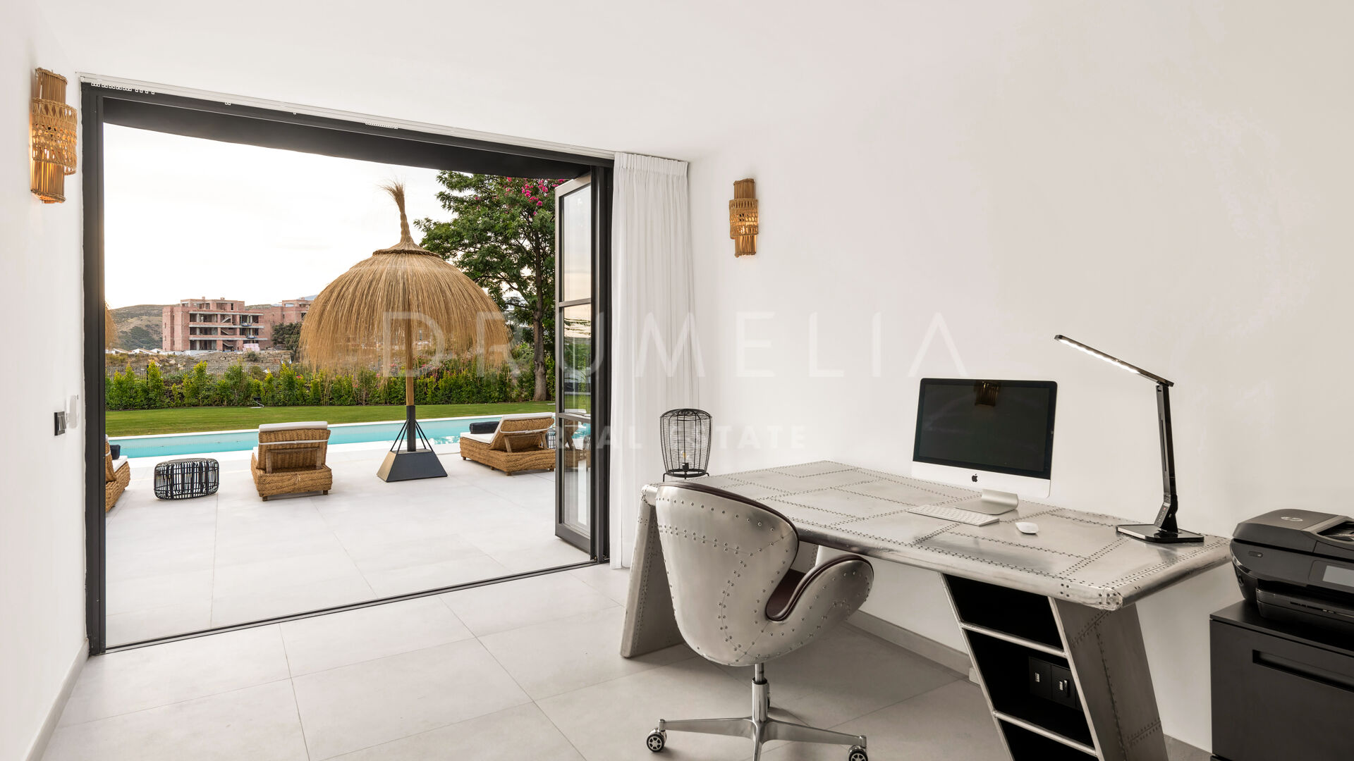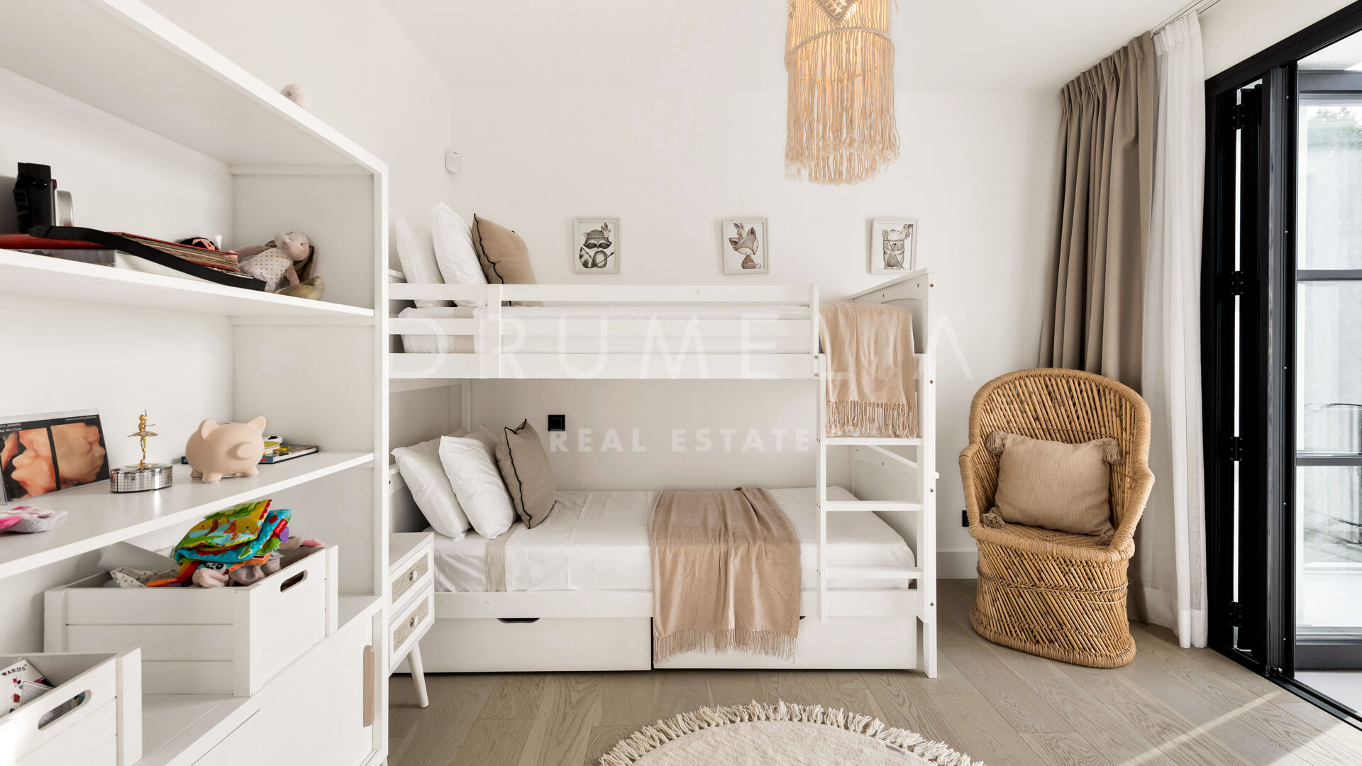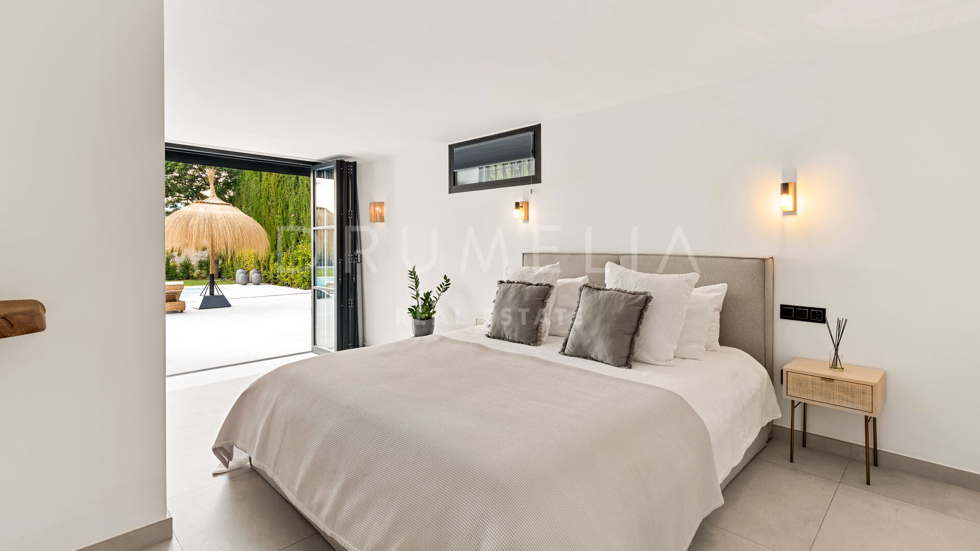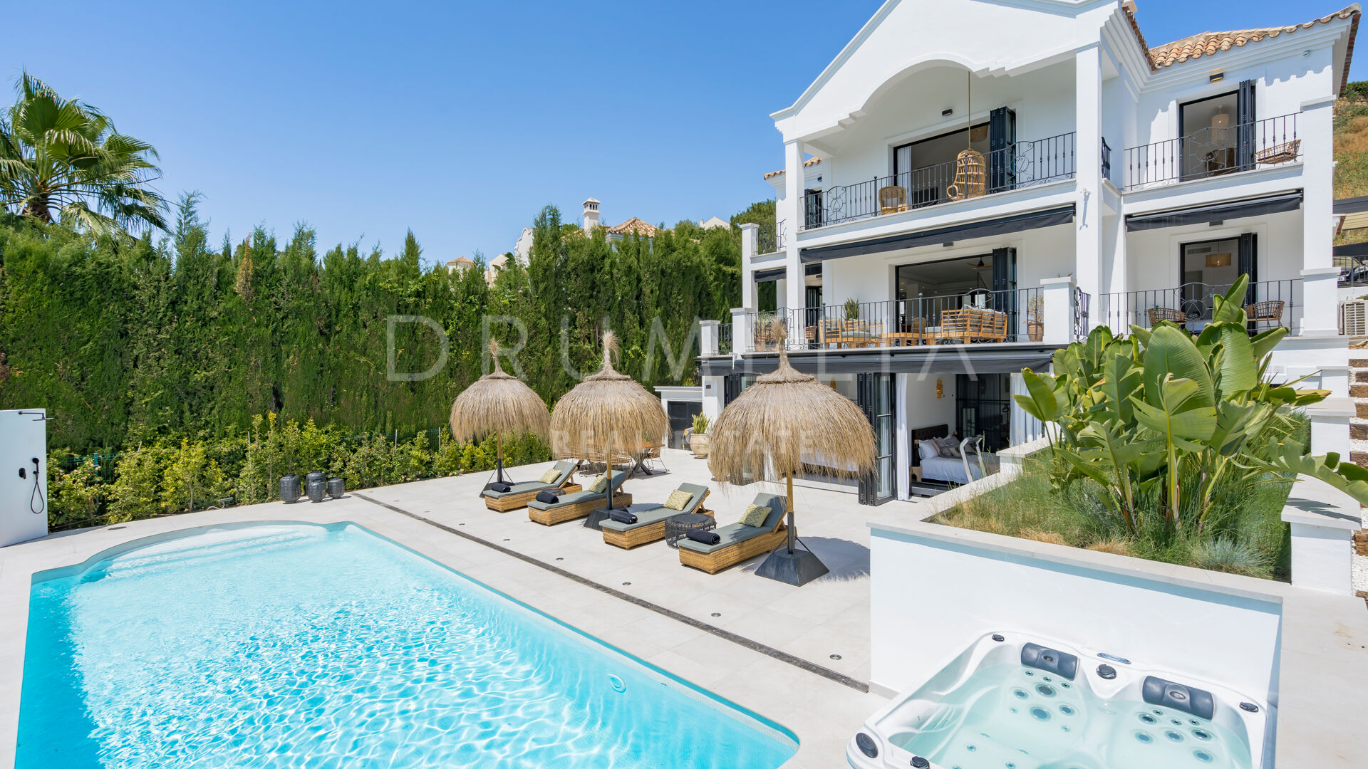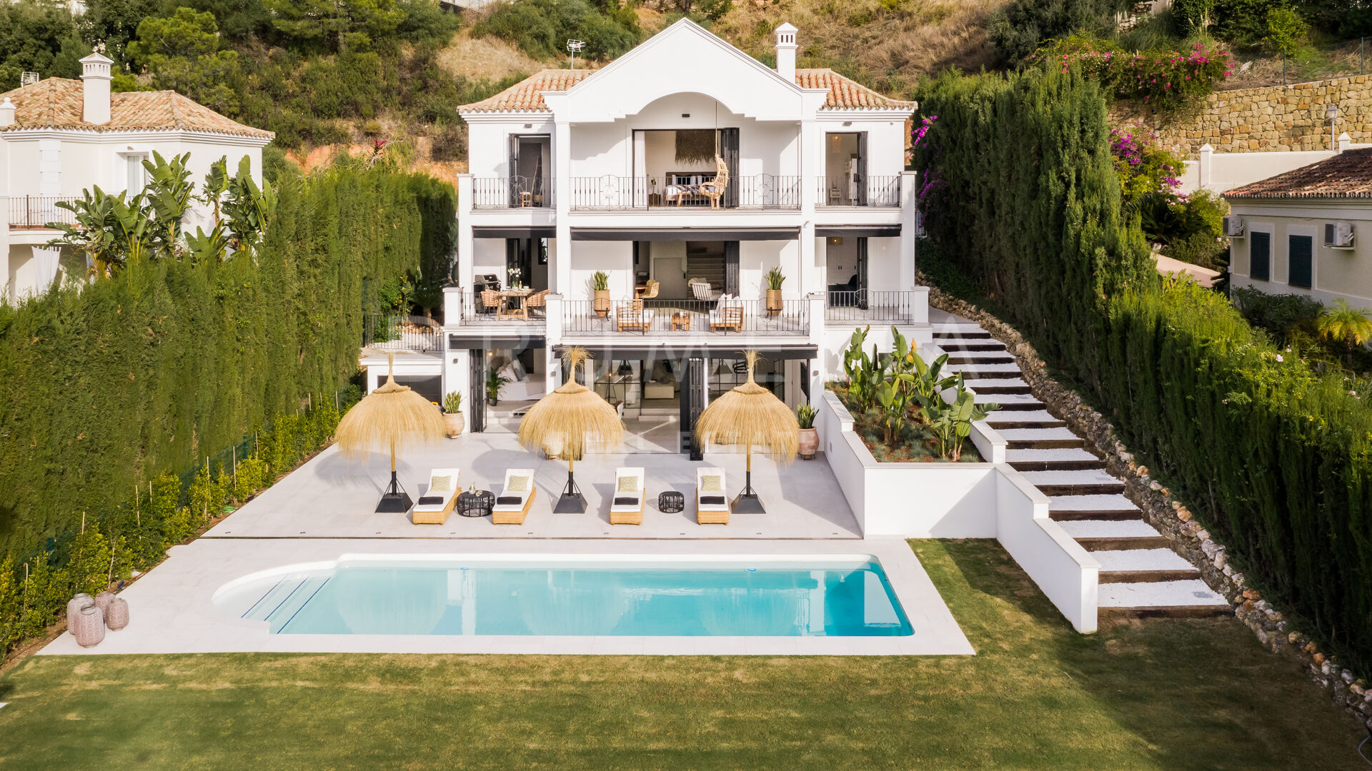 Окруженный гольф-полями, красивой природой и элитными объектами недвижимости Бенахависа, элегантный дом с 6 спальнями площадью 420 м² с участком 941 м² сочетает скандинавскую функциональность, шик современных элементов и шарм средиземноморских и этнических черт, украшающих как его архитектуру, так и интерьер. Эта потрясающая вилла была недавно полностью отремонтирована в соответствии с самыми высокими стандартами роскоши. Она предлагает просторные, светлые и открытые помещения гостиной и столовой, которые соединяются с внешней территорией участка и террасами. Совершенно новая современная кухня выполнена в модном стиле минимализм; новыми также являются шкафы, двери и тренажерный зал, полностью обновлены 6 современных ванных комнат. 6 безмятежных и уютных спален выполнены в стиле Нордик и могут похвастаться стильной мебелью и красивыми постельными принадлежностями нейтральной палитры.