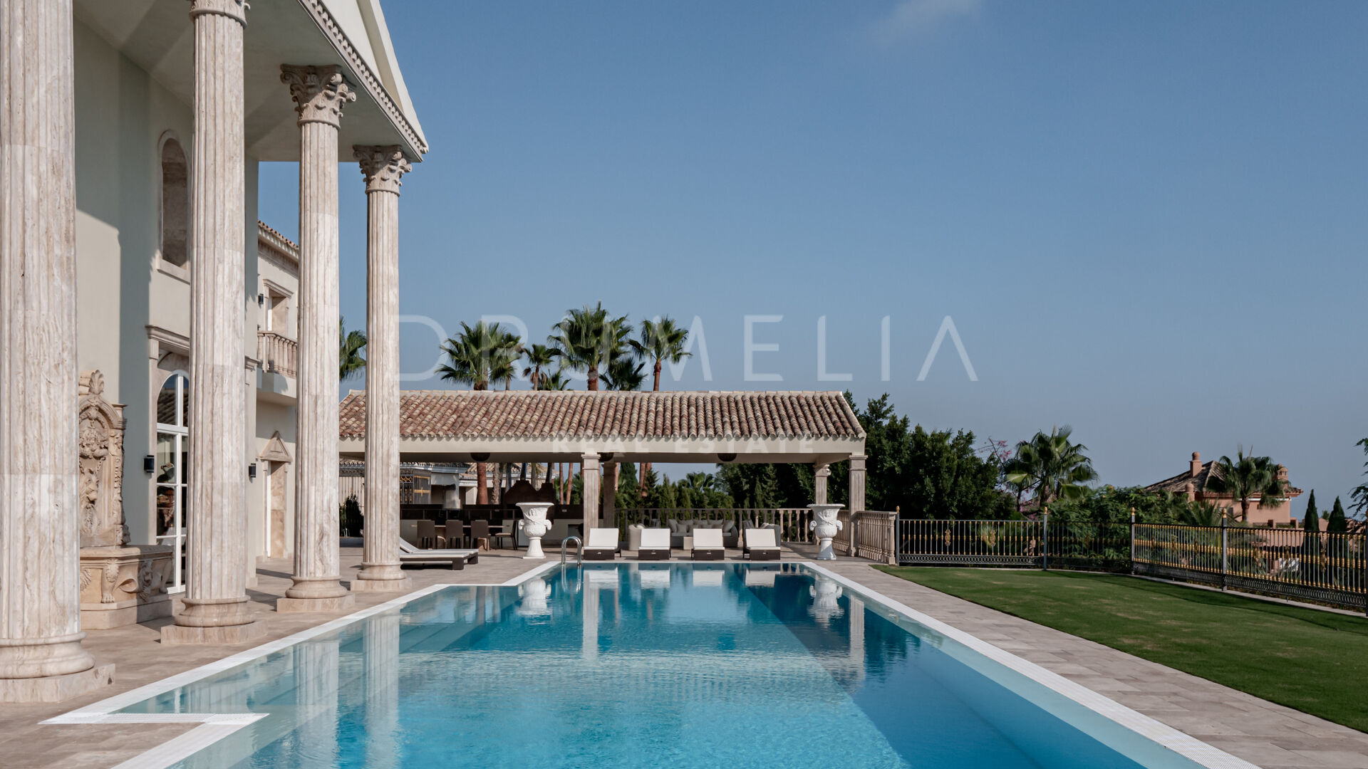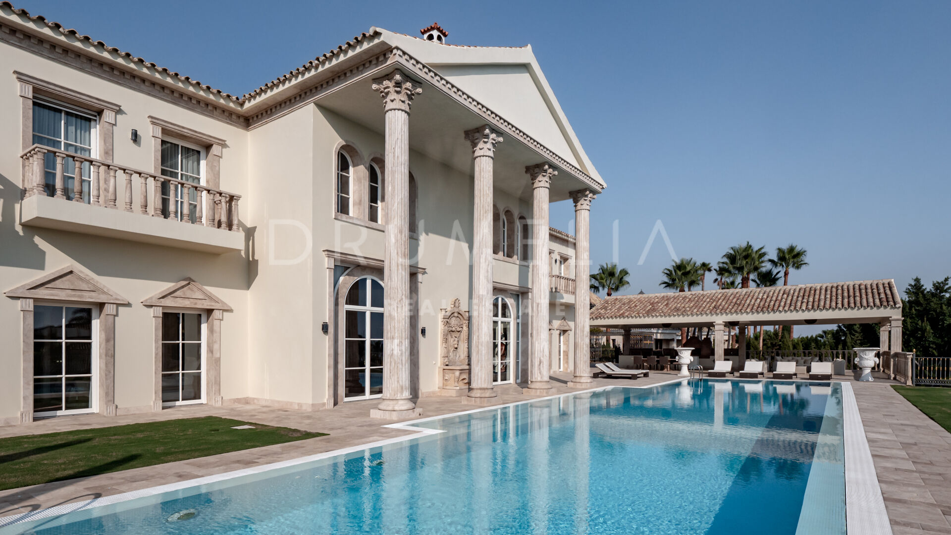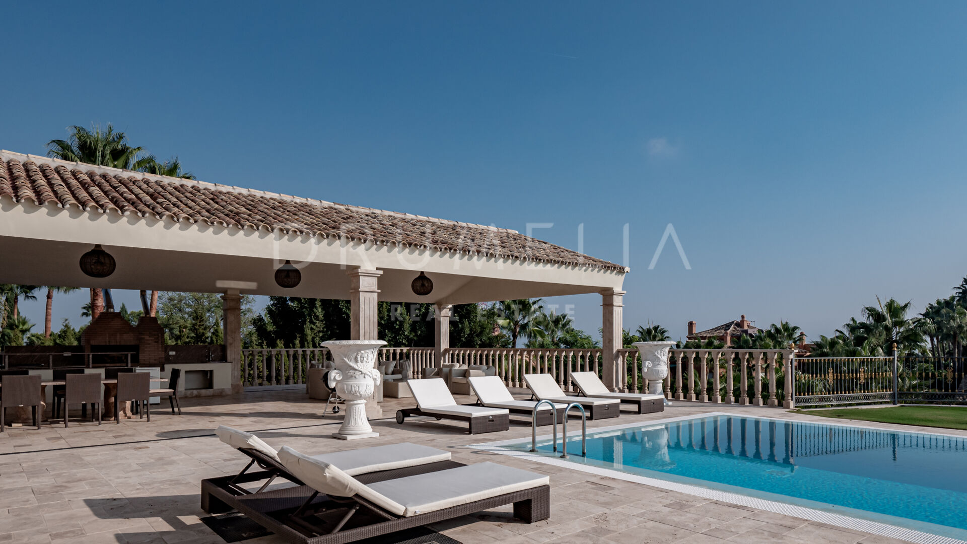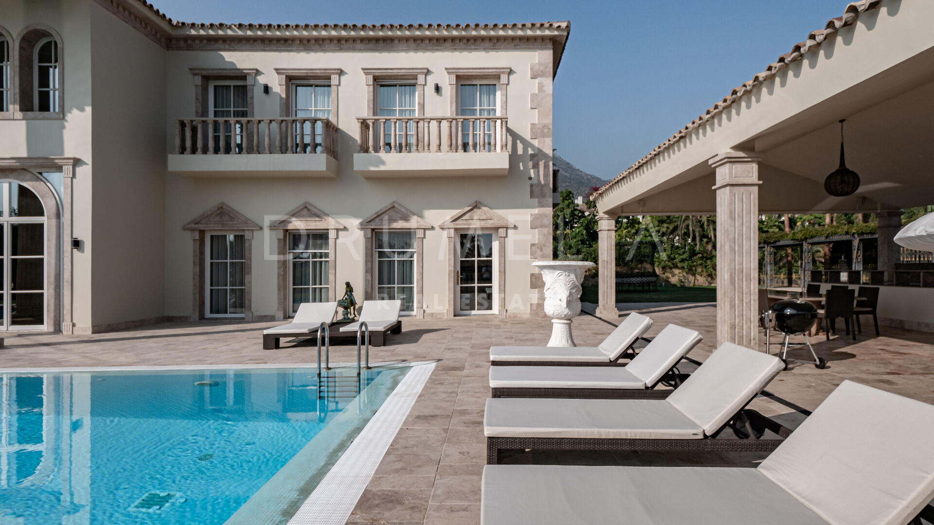 Роскошь и средиземноморский образ жизни ждут резидентов и за пределами дома, на територии. На участке расположен олимпийский бассейн, окруженный красивой мраморной палубой, которая идеально сочетается с внешней архитектурой. Экзотический сад окружает бассейн и подчеркивает стиль этой недвижимости.