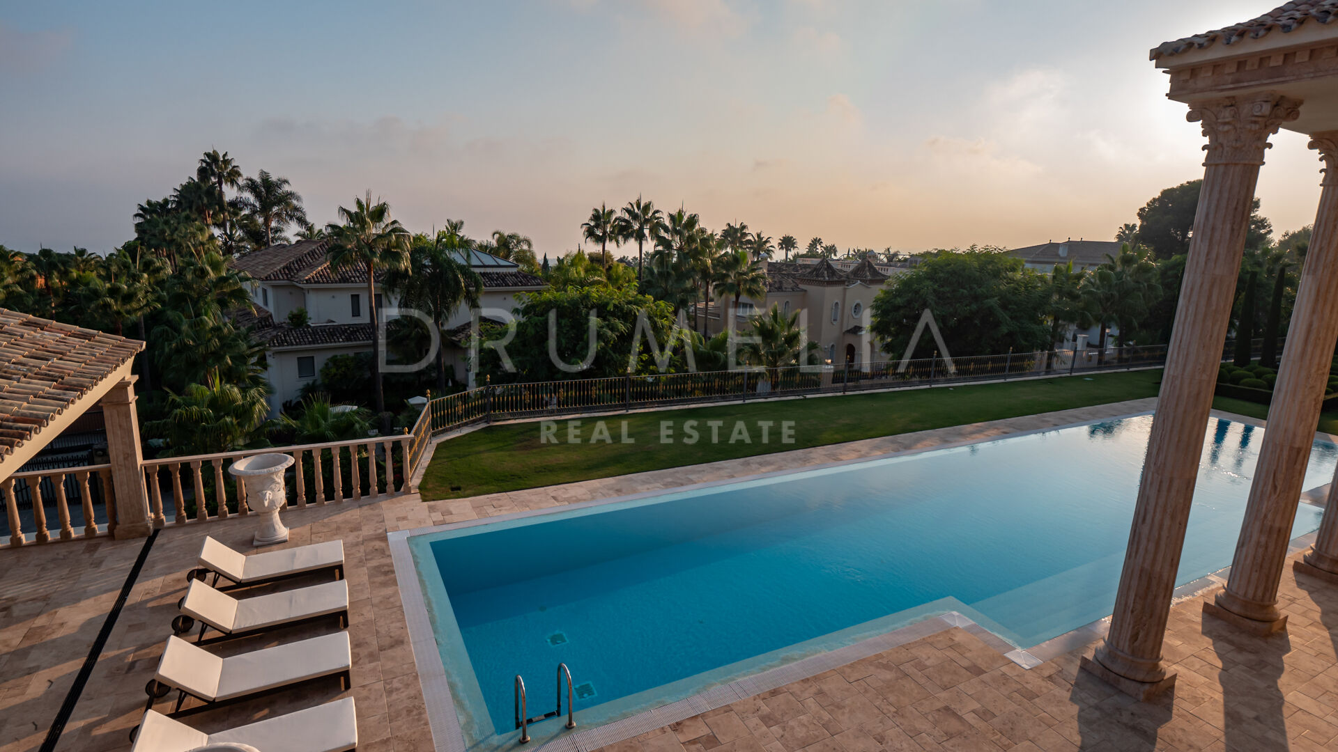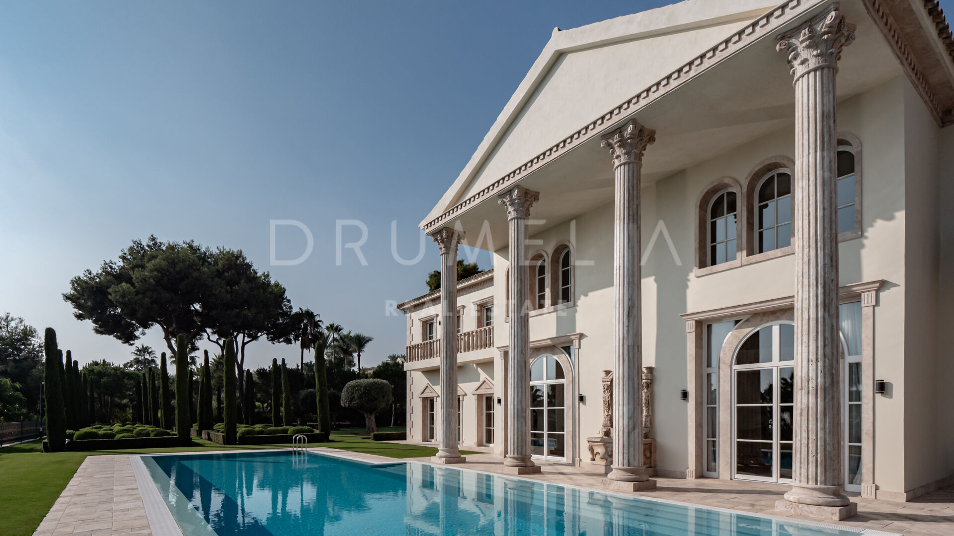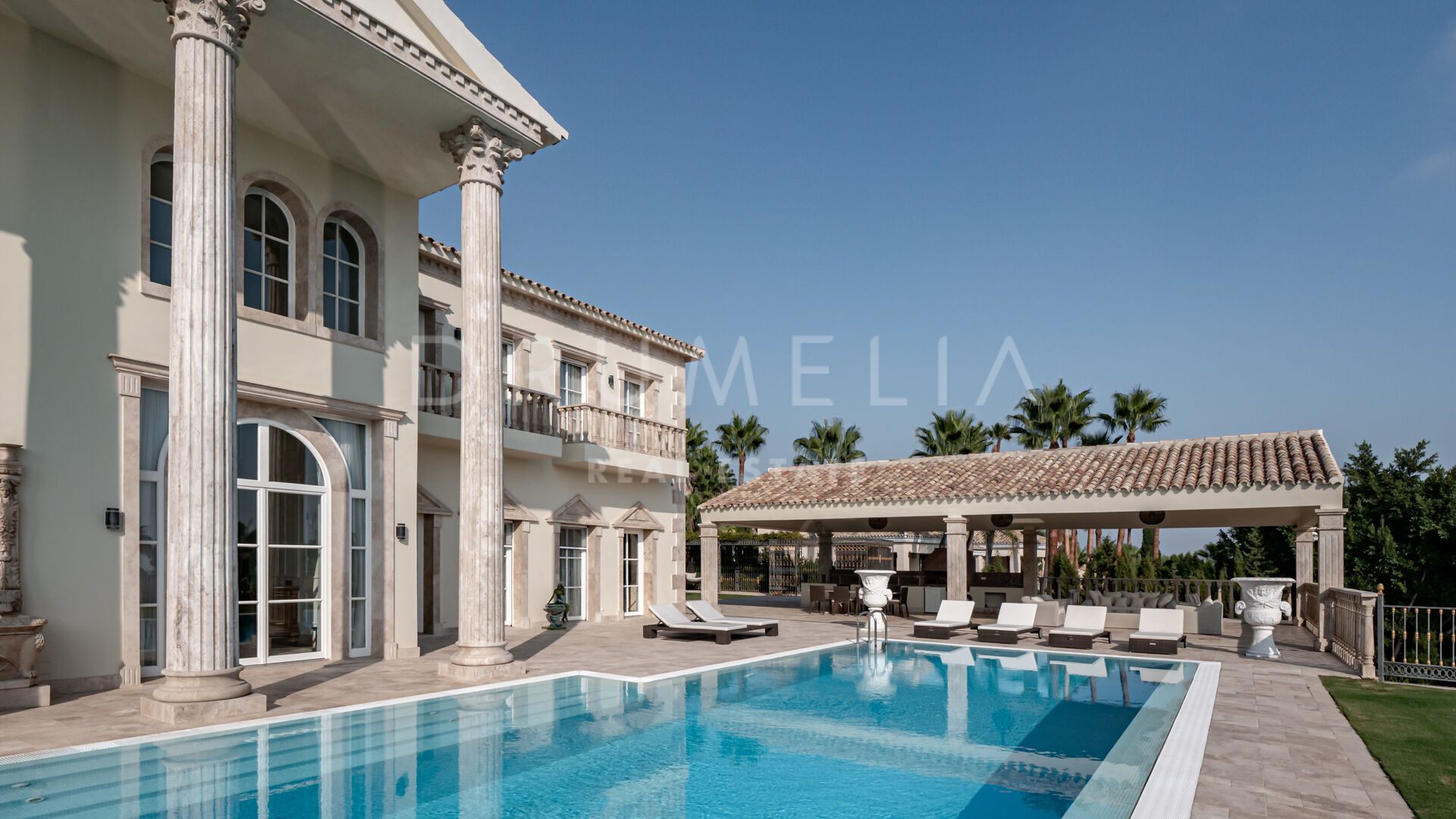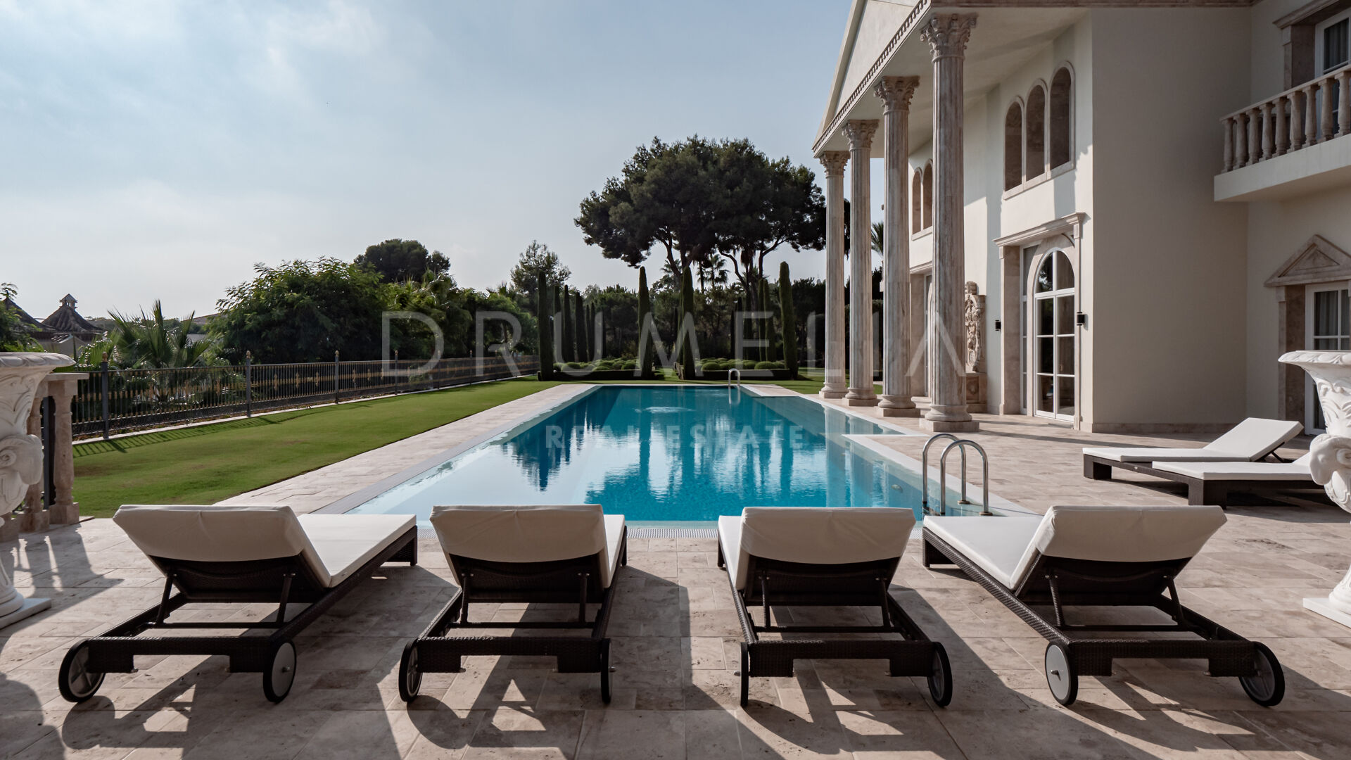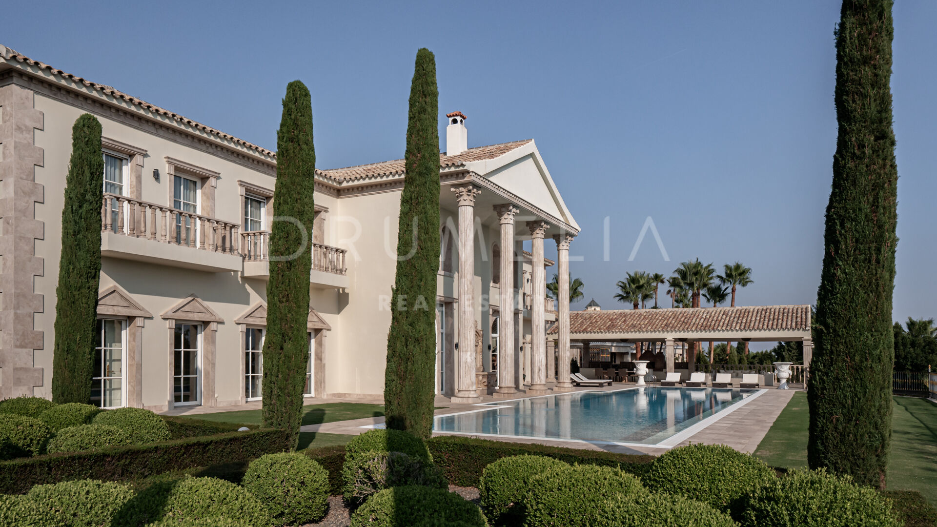 Роскошь и средиземноморский образ жизни ждут резидентов и за пределами дома, на територии. На участке расположен олимпийский бассейн, окруженный красивой мраморной палубой, которая идеально сочетается с внешней архитектурой. Экзотический сад окружает бассейн и подчеркивает стиль этой недвижимости.