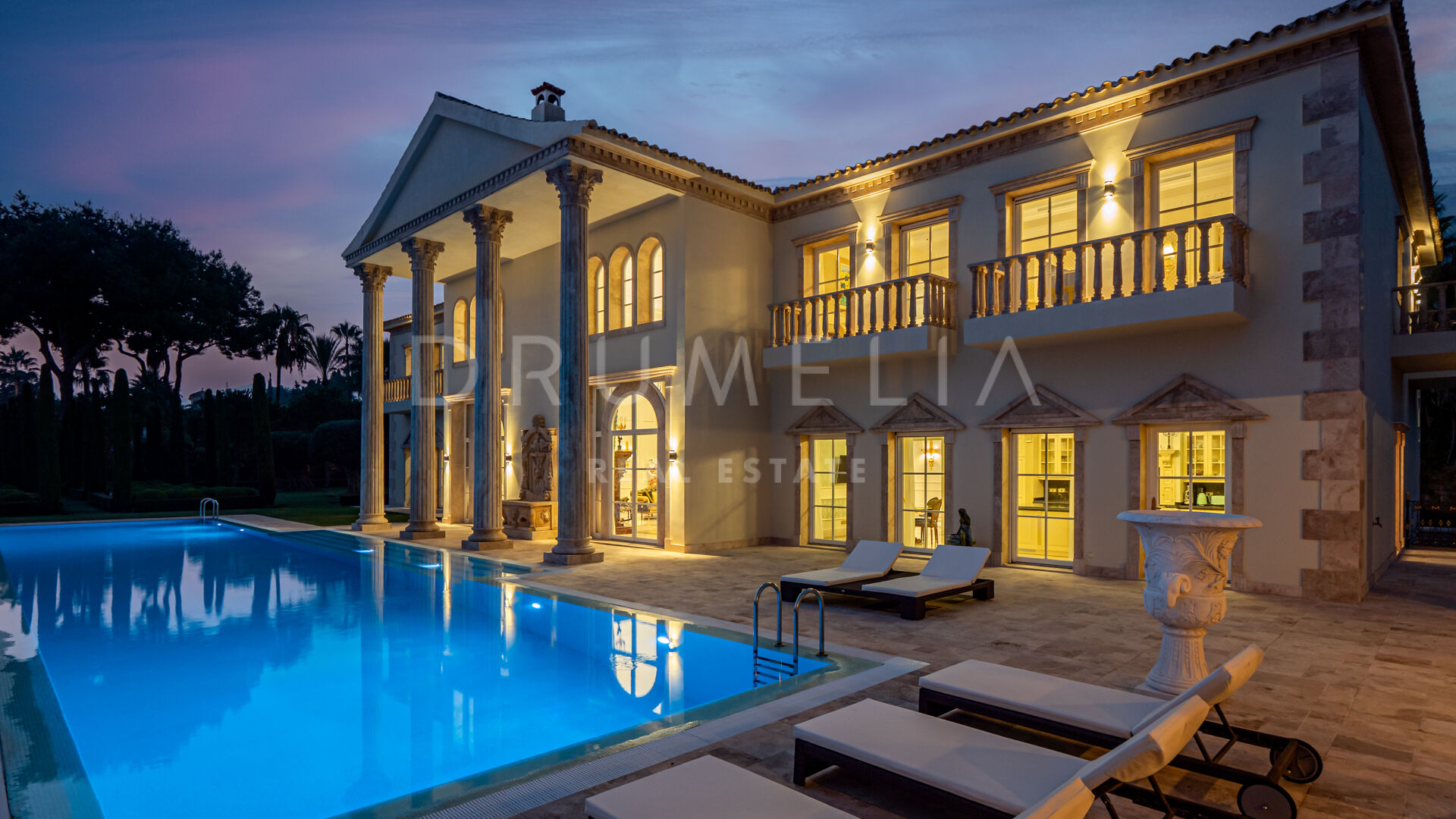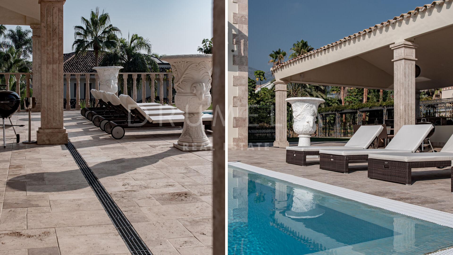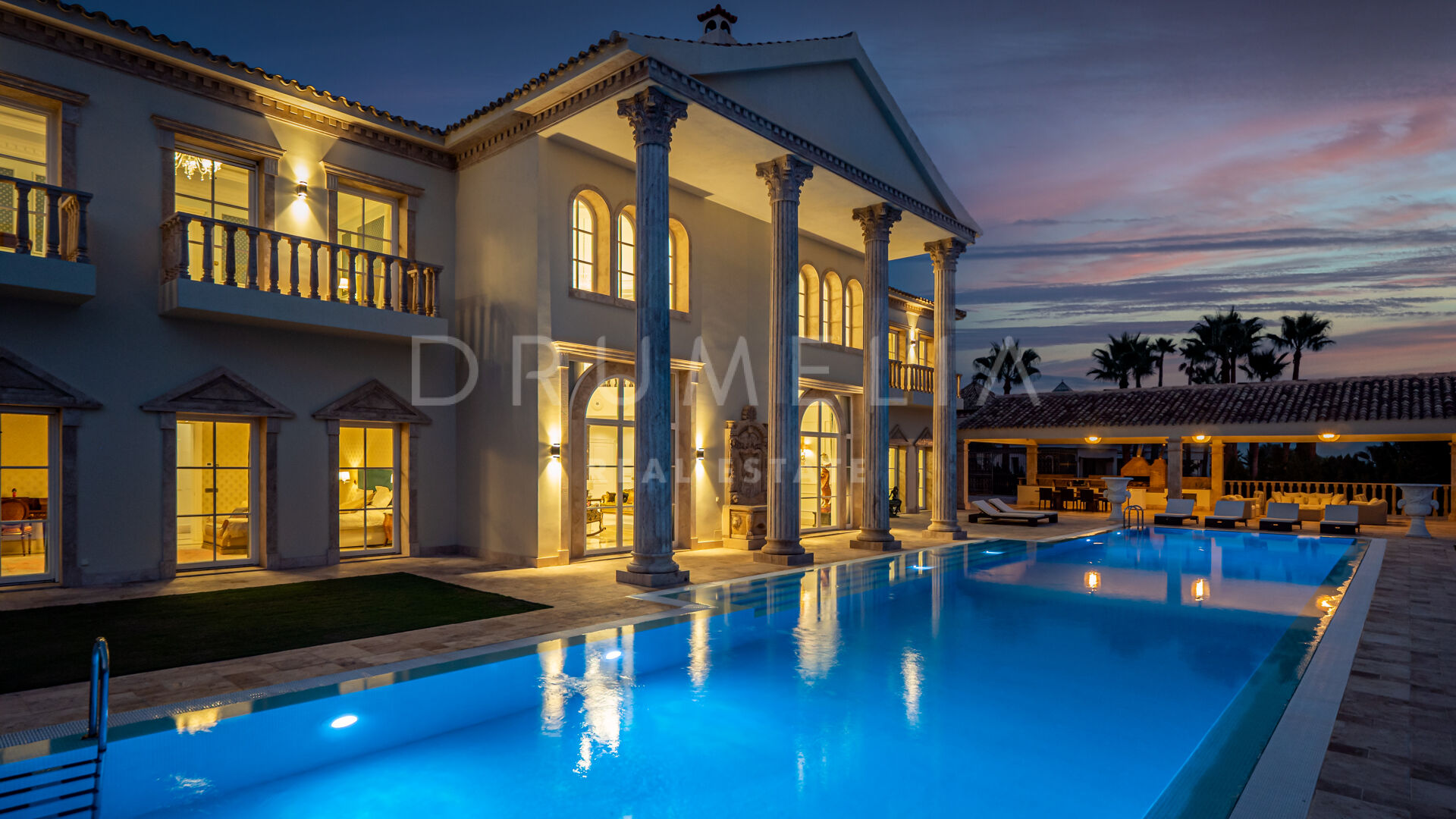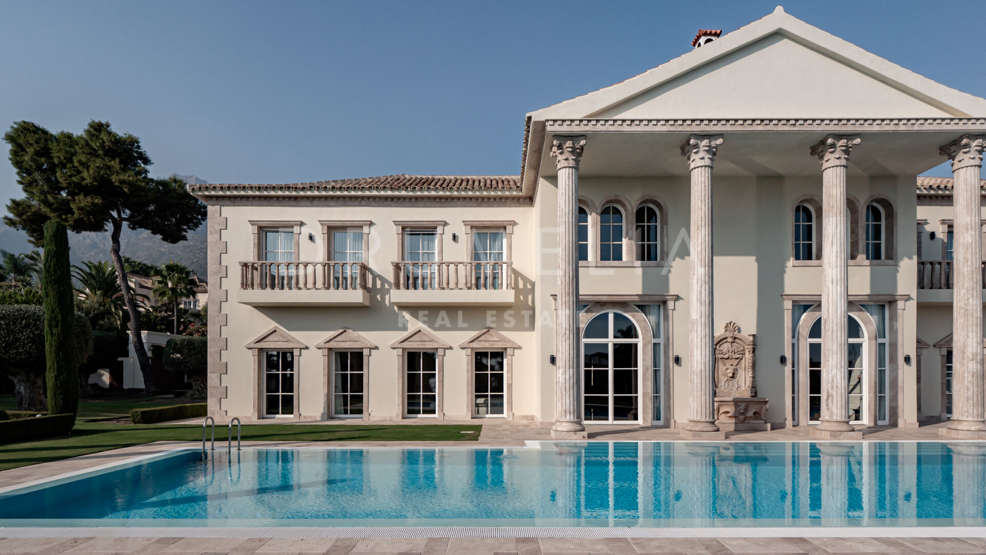 Роскошь и средиземноморский образ жизни ждут резидентов и за пределами дома, на територии. На участке расположен олимпийский бассейн, окруженный красивой мраморной палубой, которая идеально сочетается с внешней архитектурой. Экзотический сад окружает бассейн и подчеркивает стиль этой недвижимости.