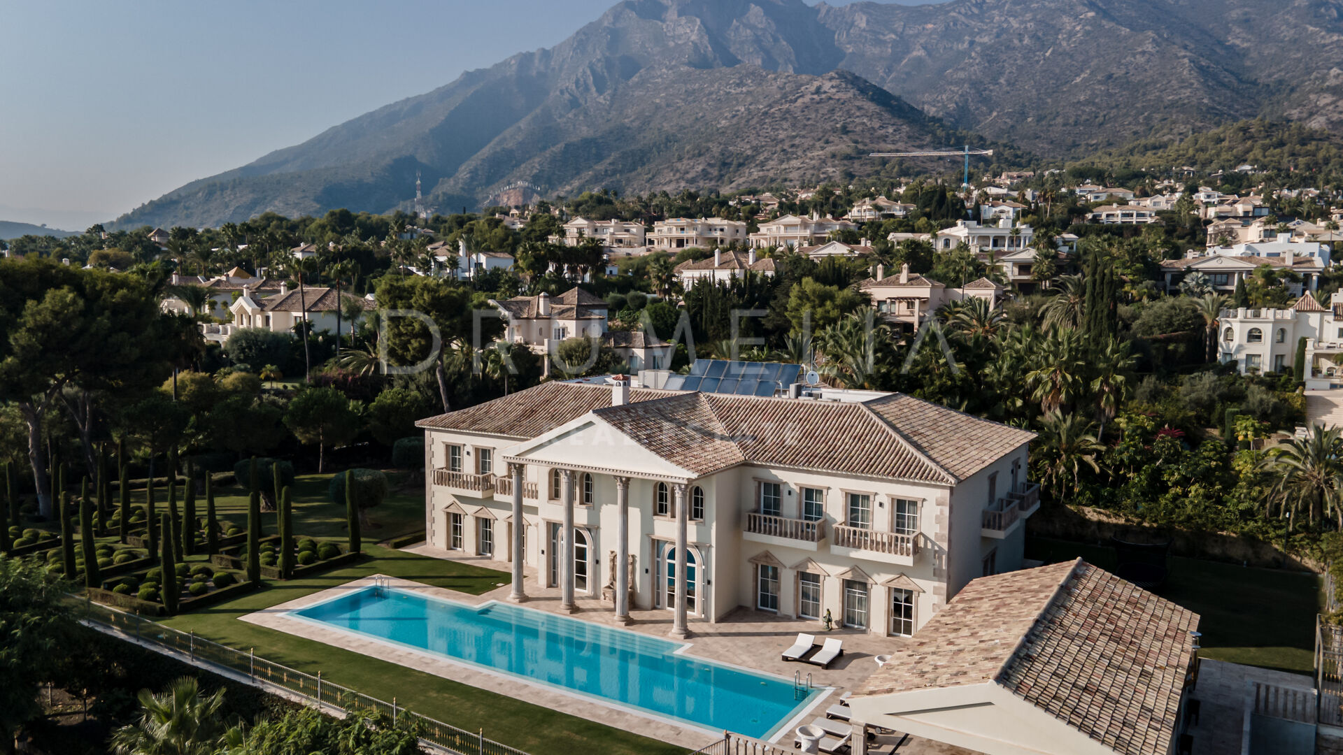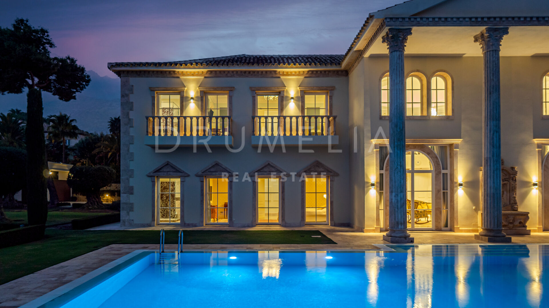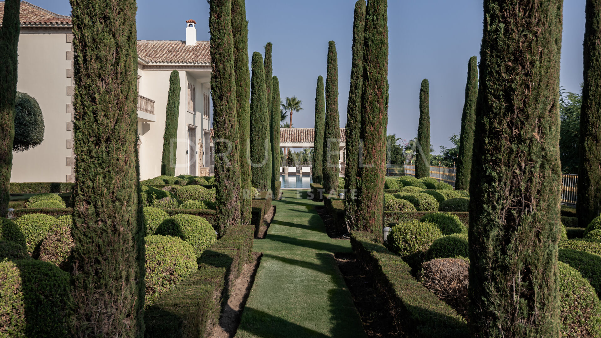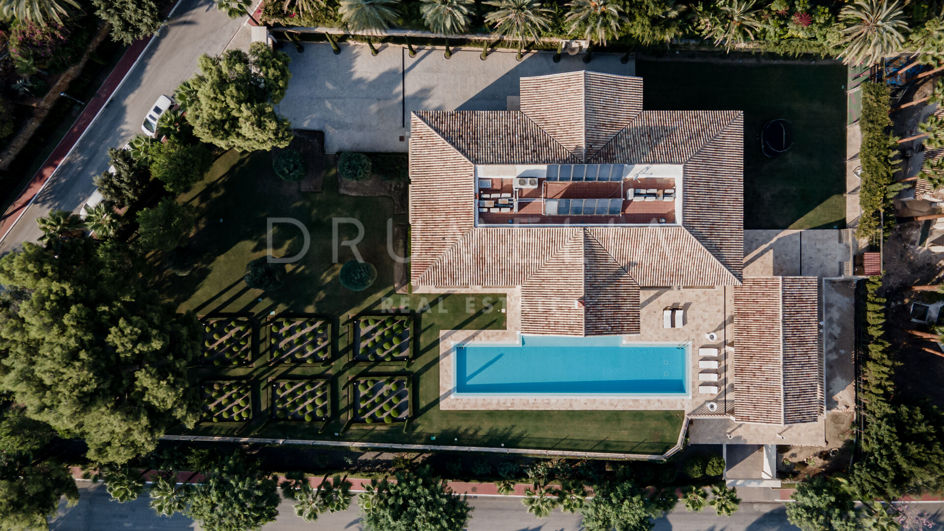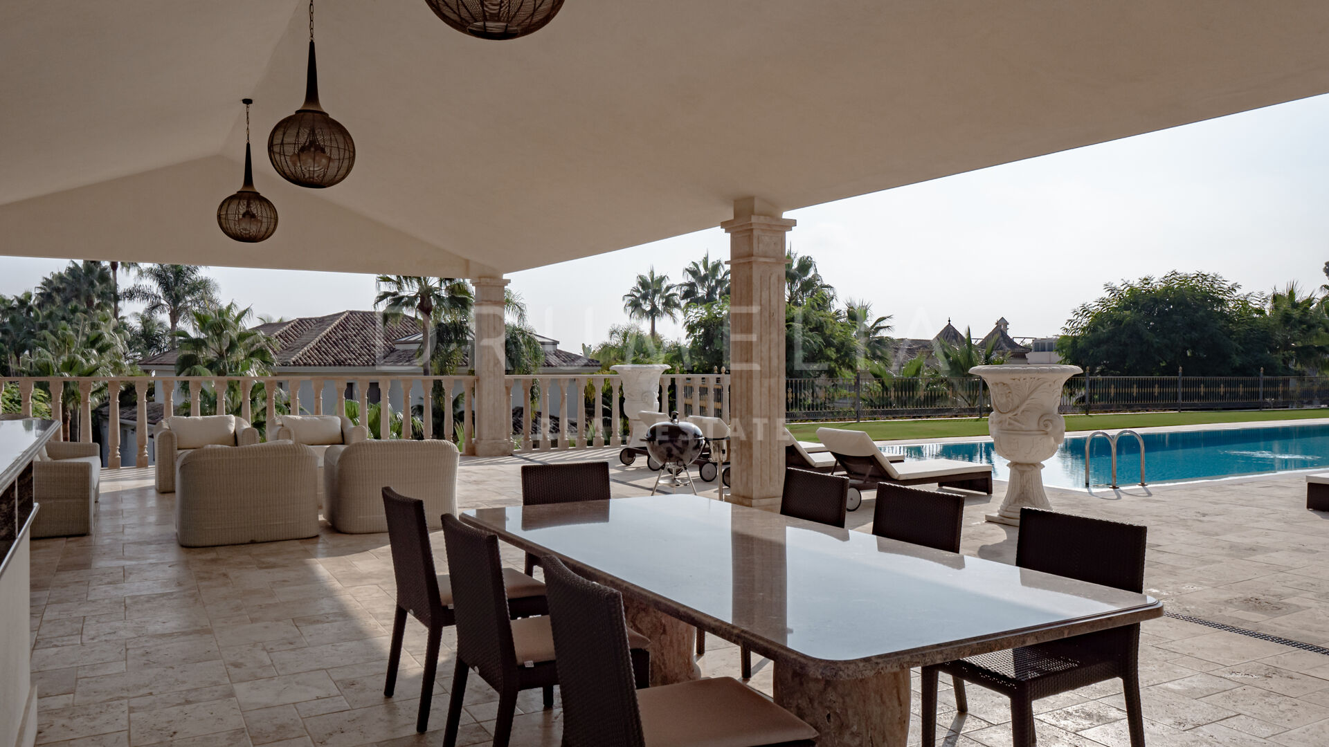 Роскошь и средиземноморский образ жизни ждут резидентов и за пределами дома, на територии. На участке расположен олимпийский бассейн, окруженный красивой мраморной палубой, которая идеально сочетается с внешней архитектурой. Экзотический сад окружает бассейн и подчеркивает стиль этой недвижимости.