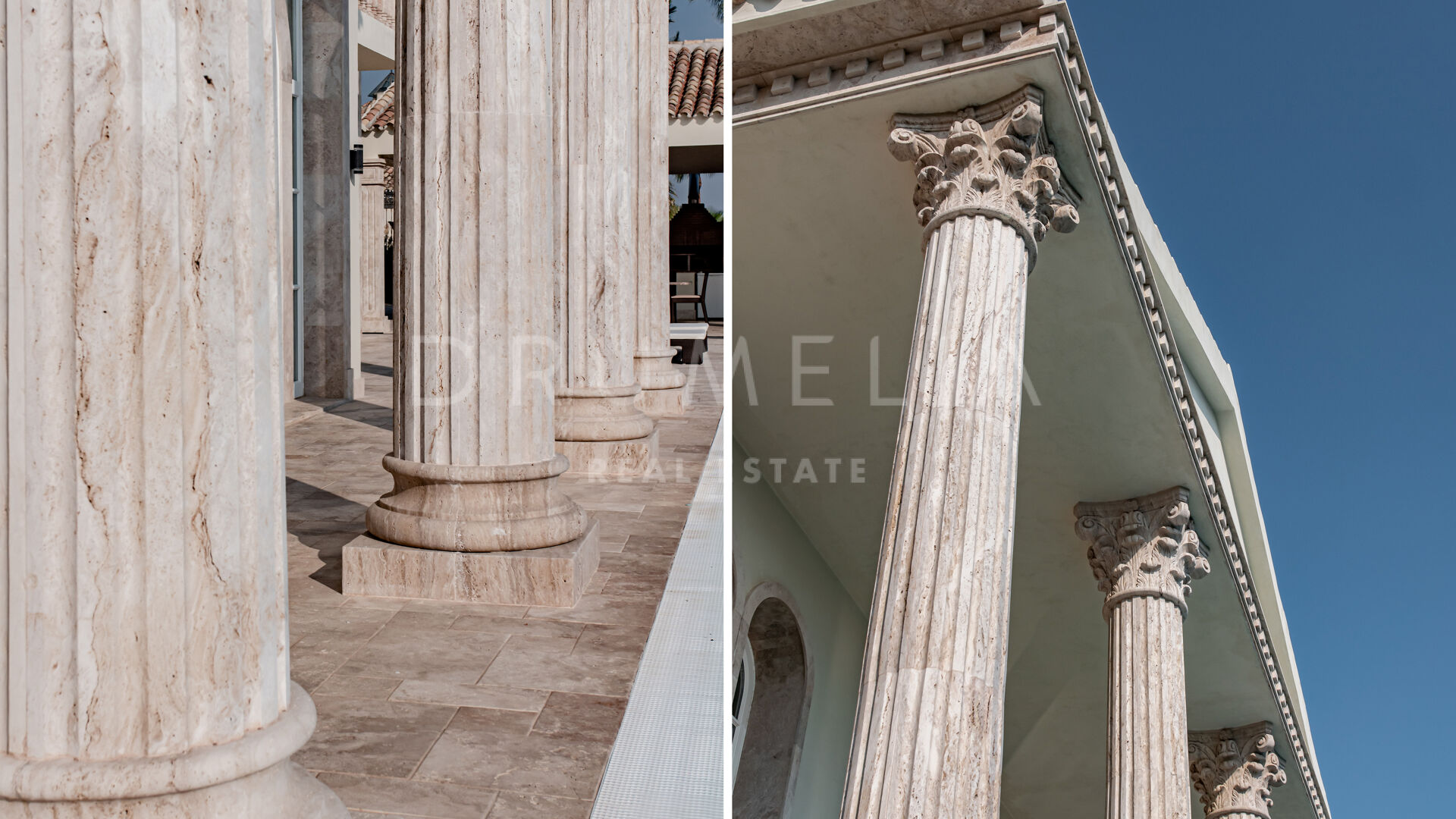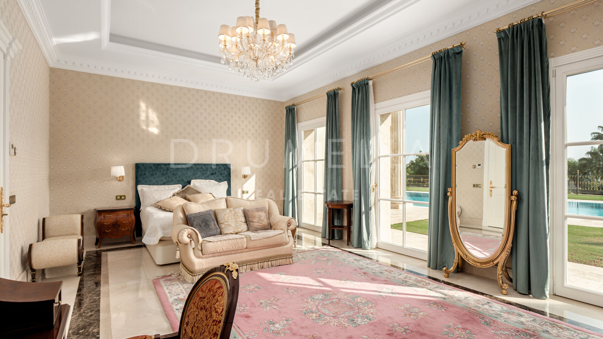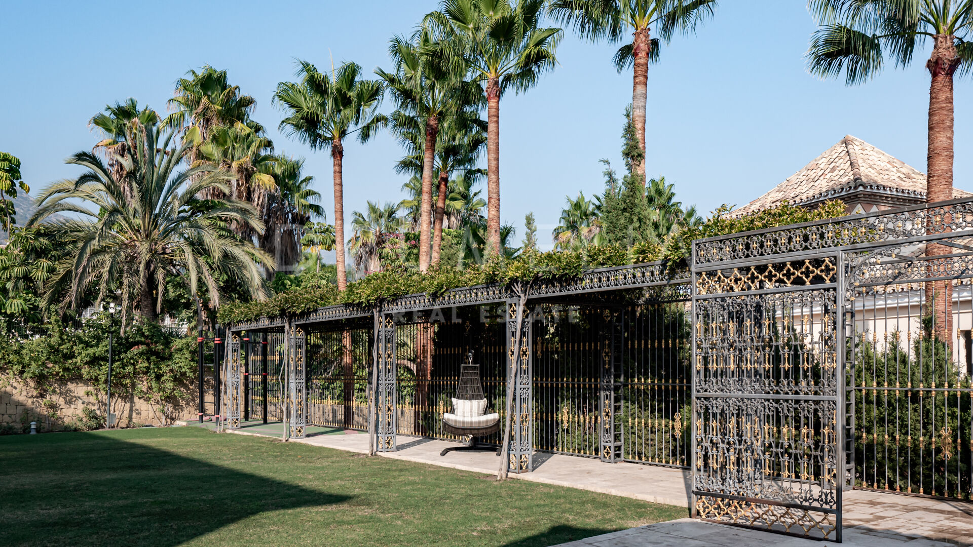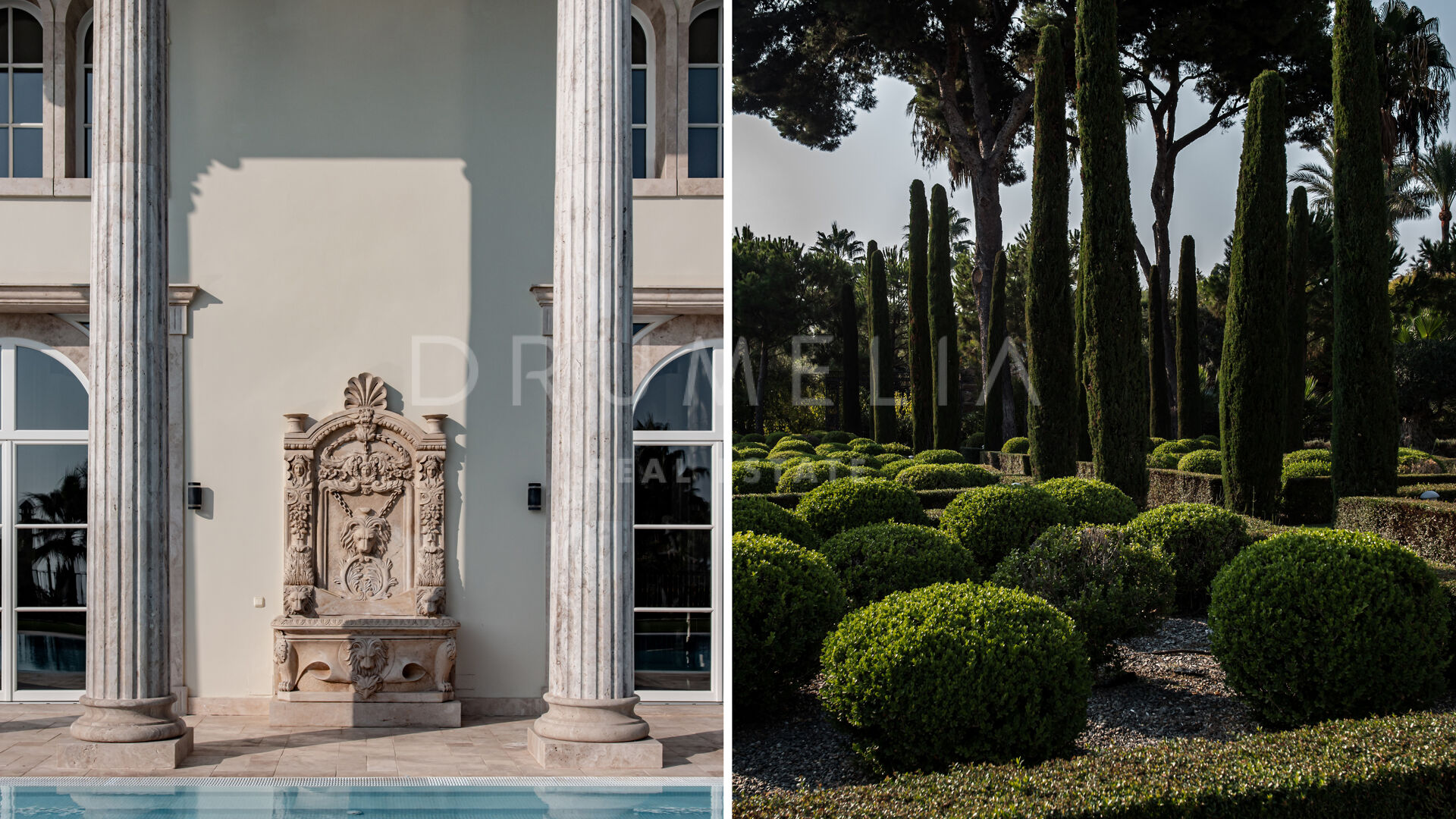 Роскошь и средиземноморский образ жизни ждут резидентов и за пределами дома, на територии. На участке расположен олимпийский бассейн, окруженный красивой мраморной палубой, которая идеально сочетается с внешней архитектурой. Экзотический сад окружает бассейн и подчеркивает стиль этой недвижимости.