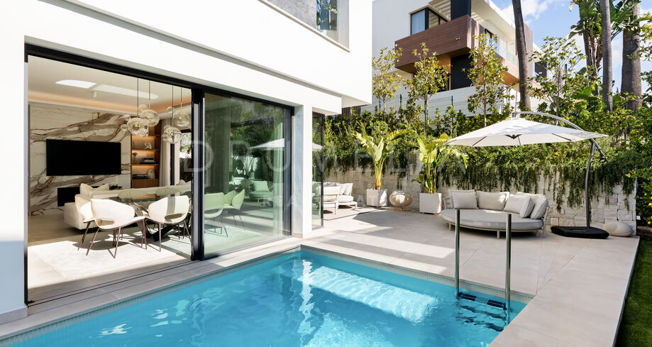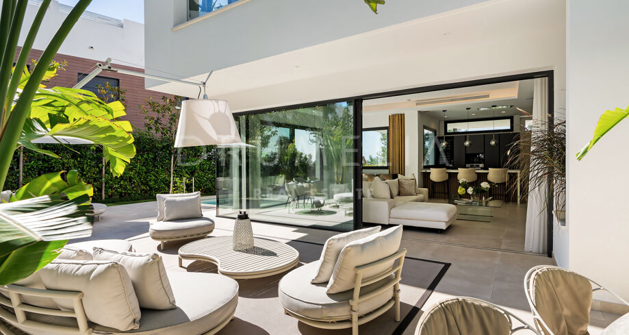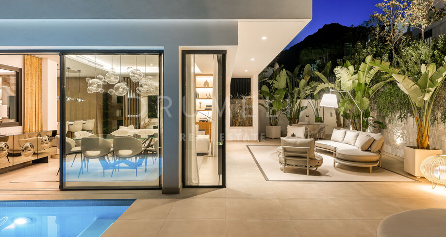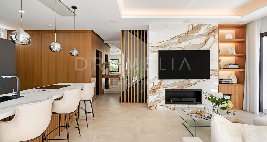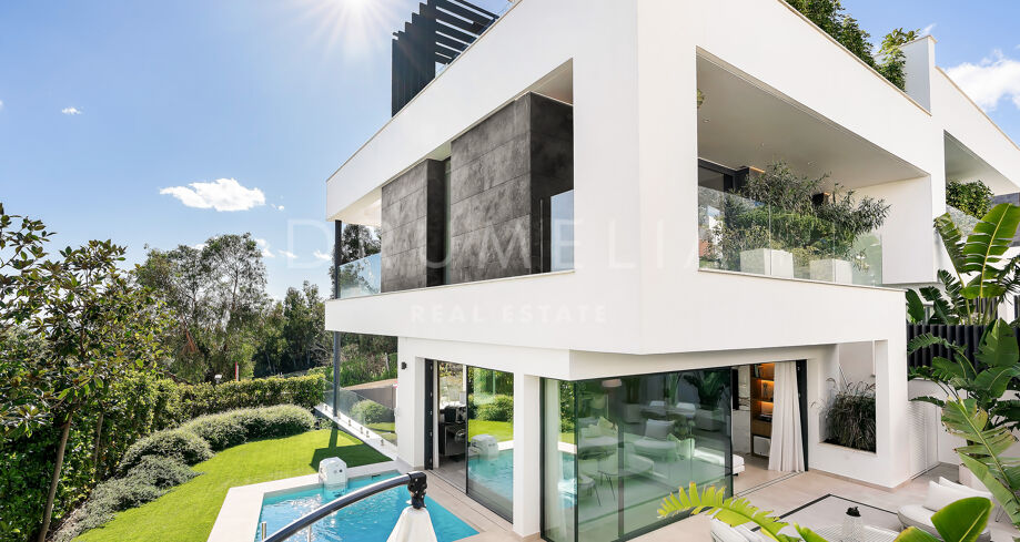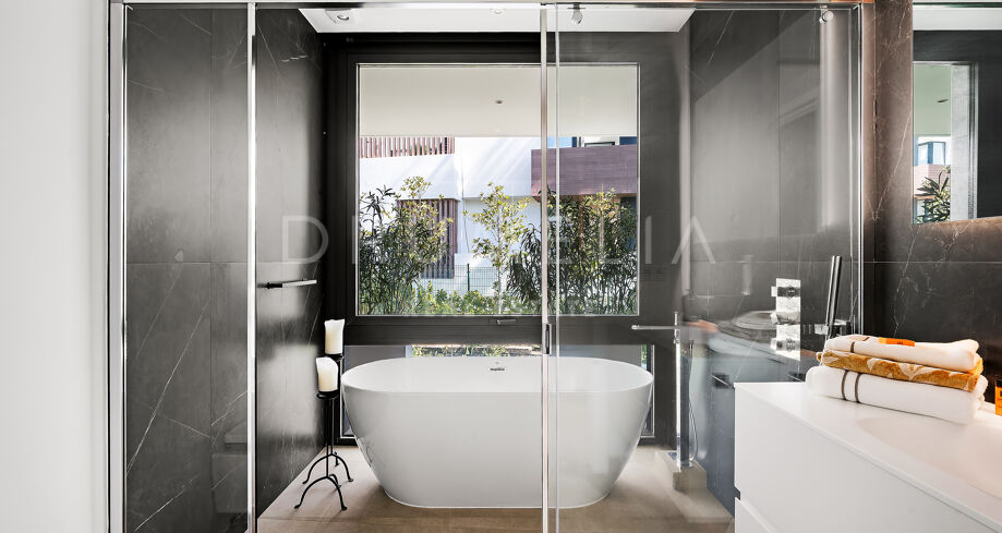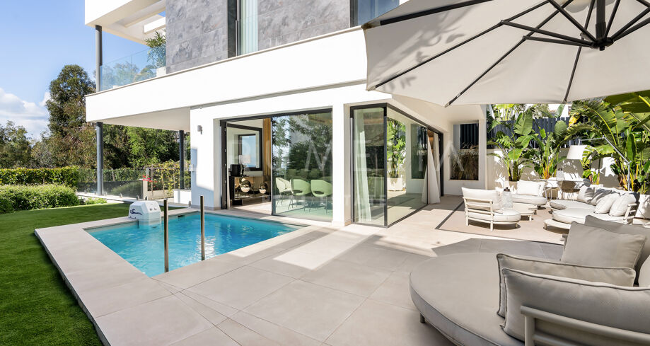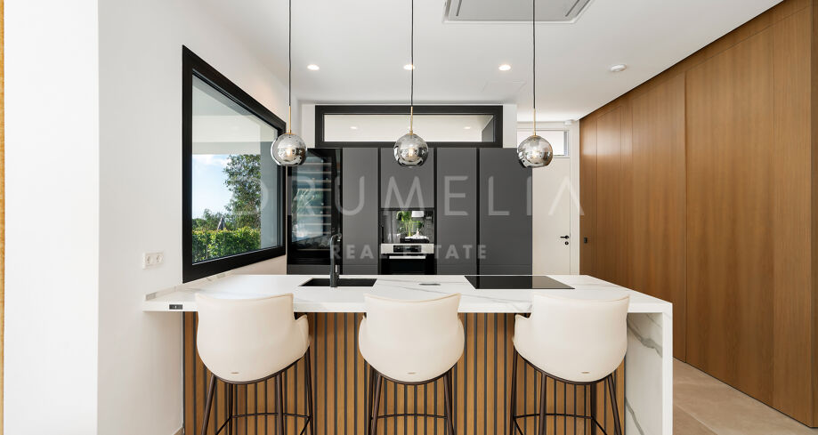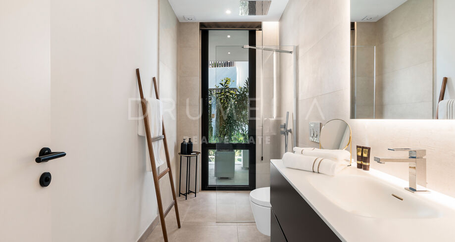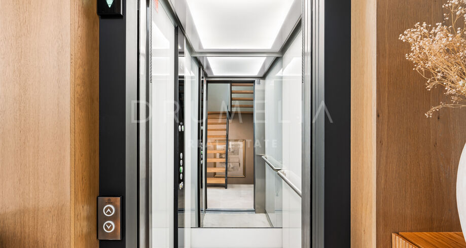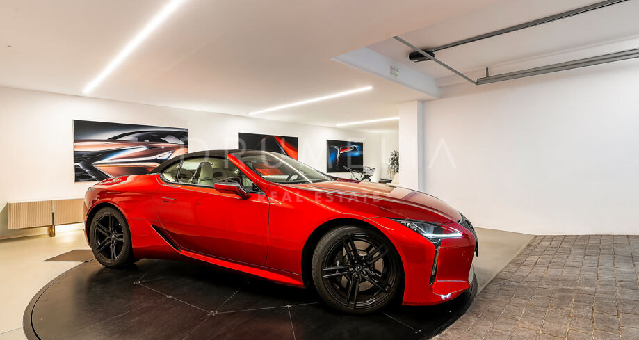 Использованы только лучшие материалы: плитка Porcelanosa, тройные стеклопакеты Cortizo, дубовая отделка и умная система управления домом. Вилла включает 4 спальни (3 на верхнем уровне с собственными террасами), гостевую комнату, прачечную и гараж с поворотной платформой Tyssenkrupp и дополнительное место для парковки.