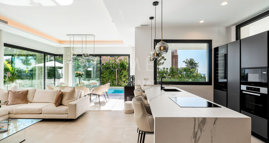 Эта современная вилла, расположенная в престижном районе Сьерра-Бланка в Марбелье, всего в 1,8 км от пляжей Золотой Мили, предлагает панорамный вид на море с каждого уровня и роскошь в каждой детали. Построена в 2022 году, вилла оснащена индивидуальной кухней с техникой Miele, просторной гостиной зоной и выходом на террасы, ухоженный сад и подогреваемый бассейн с противотоком.