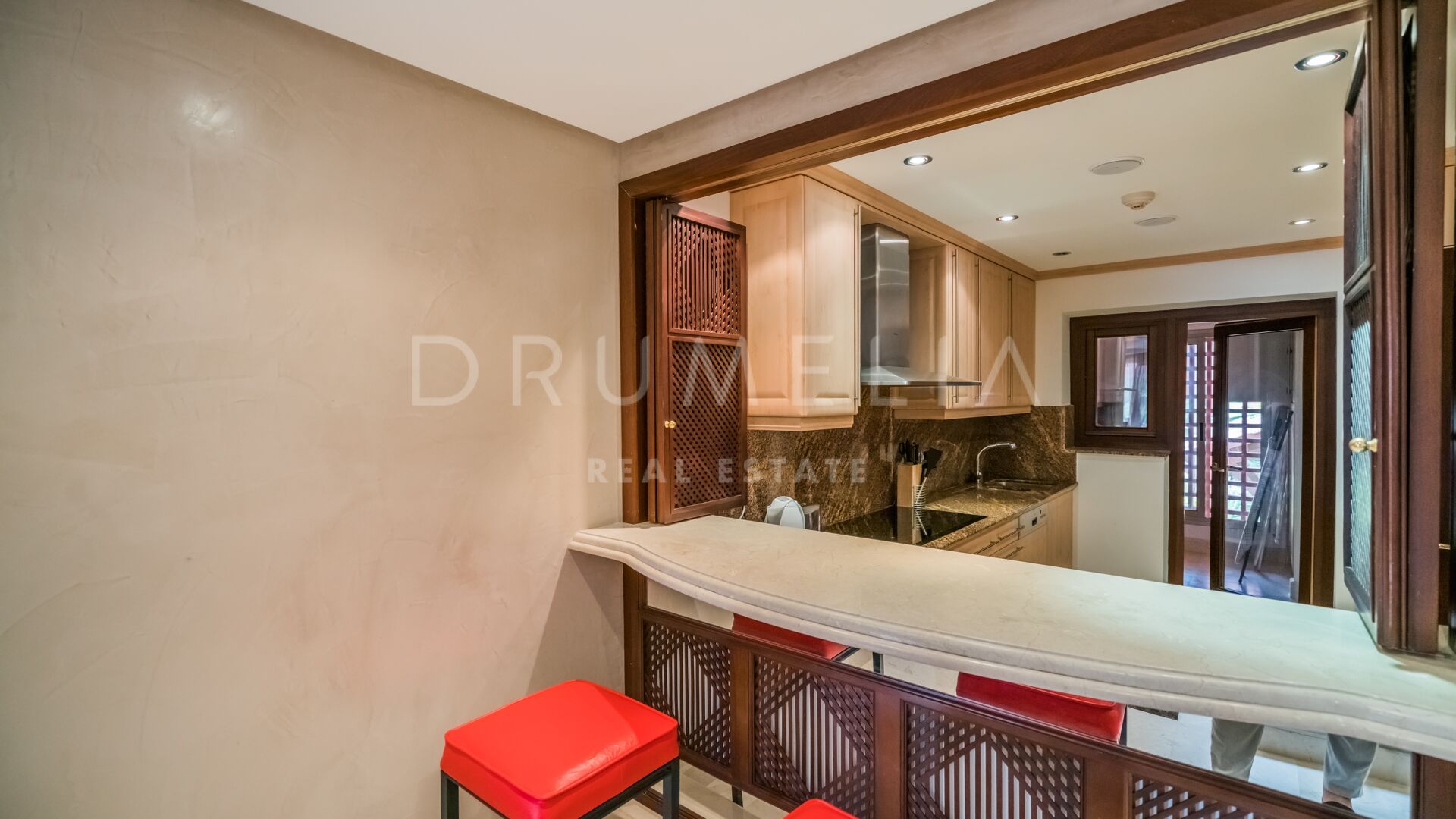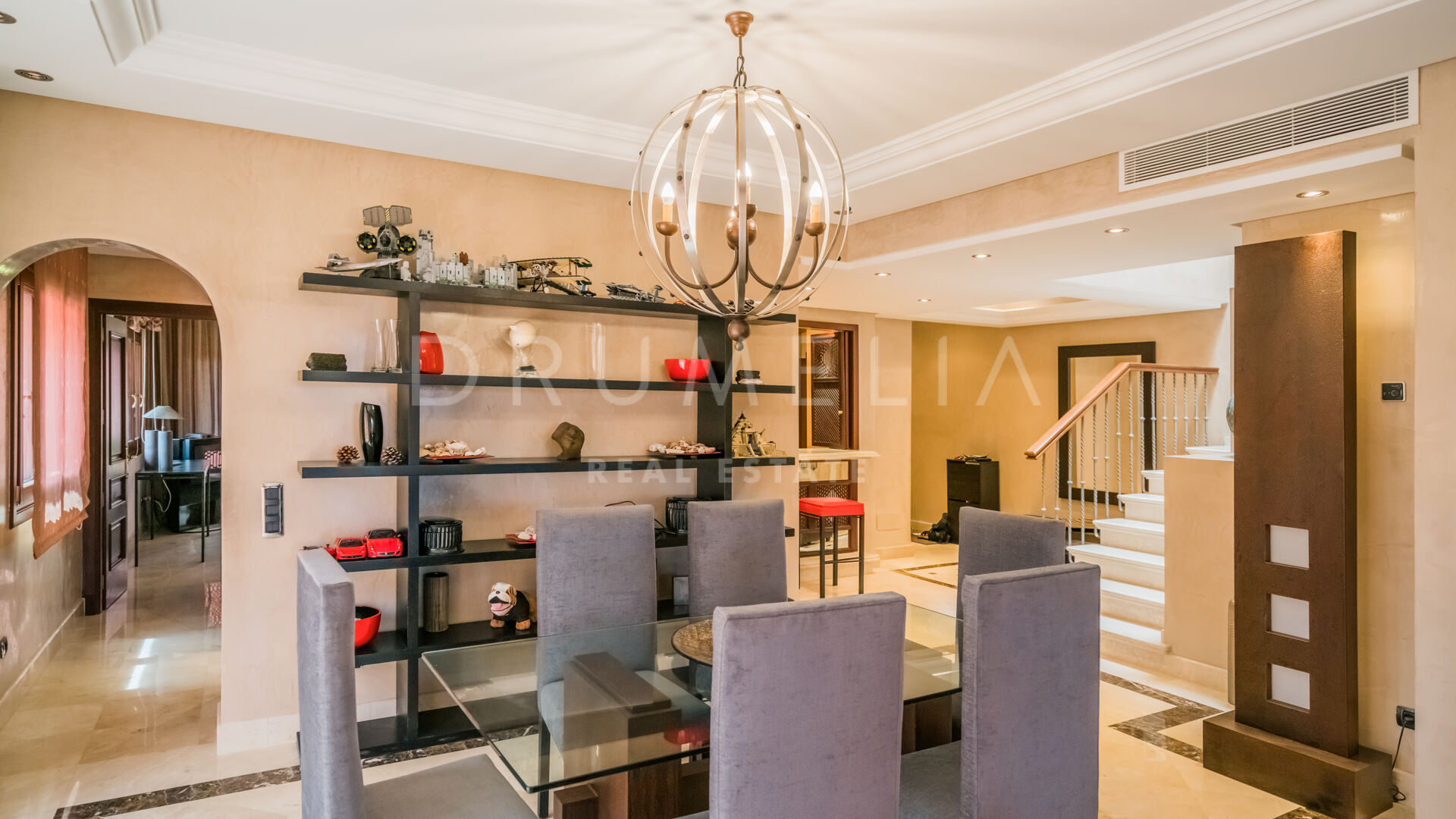 Великолепная недвижимость поставляется в отличном состоянии, со вкусом обставленной, со всем необходимым для самого комфортного проживания (прекрасные художественные полы из светлого мрамора с системой подогрева, джакузи внутри и снаружи, двойные стеклопакеты и раздвигающиеся панорамные стеклянные двери, впускающие свет и объединяющие интерьер с экстерьером, стильный деревянный потолок и оконные ставни, кладовая, большое парковочное место в подземном гараже и пр.). Каждое помещение прекрасно по-своему и в то же время все они объединены единым стилем, где элементы дизайна гармонично дополняют друг друга. Интересные дизайнерские интерьеры стиля «современная классика» еще больше выигрывают от натуральной палитры. Благородные тона дарят помещениям безмятежность и бесконечную элегантность, а смелые красные акценты добавляют гламур и освежают пространство, делая его ещё более стильным и жизнерадостным.