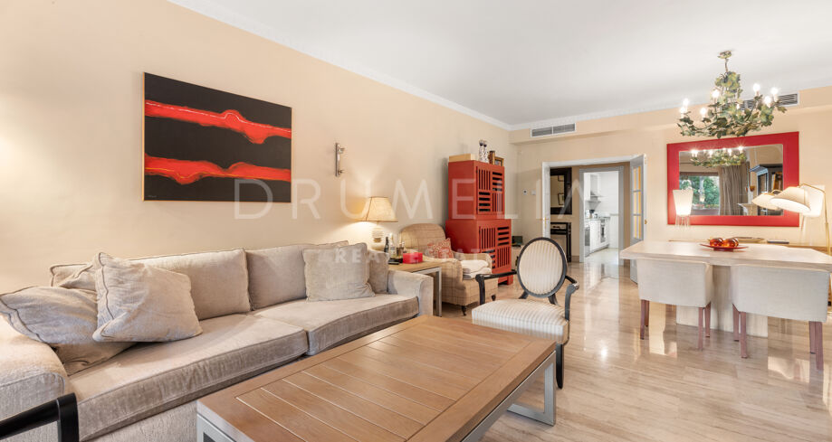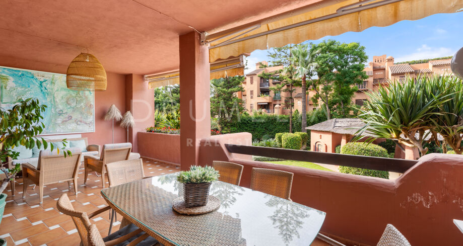 Ten przestronny apartament na parterze znajduje się w prestiżowym kompleksie mieszkalnym Alhambra del Golf we wschodniej części Estepony. Nieruchomość oferuje komfortowy i funkcjonalny układ, który łączy jasny salon i jadalnię z dużym zadaszonym tarasem z widokiem na zadbane ogrody i wspólny basen. Taras stanowi idealne miejsce na relaks i posiłki na świeżym powietrzu, doskonale wpisując się w styl życia Costa del Sol.