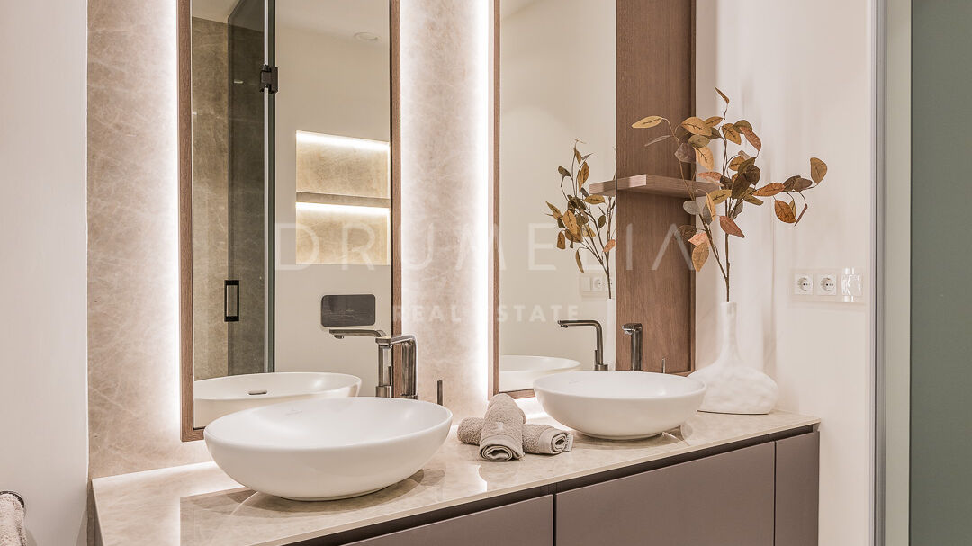 Ta wyrafinowana rezydencja została starannie odnowiona według najwyższych standardów. Przestronny taras, zabudowany bezramowymi szklanymi zasłonami, tworzy płynne przejście między wnętrzem a otoczeniem, powiększając przestrzeń dzienną i oferując kojące widoki na morze i ogród. Ogrzewanie podłogowe w całym apartamencie zapewnia komfort przez cały rok.