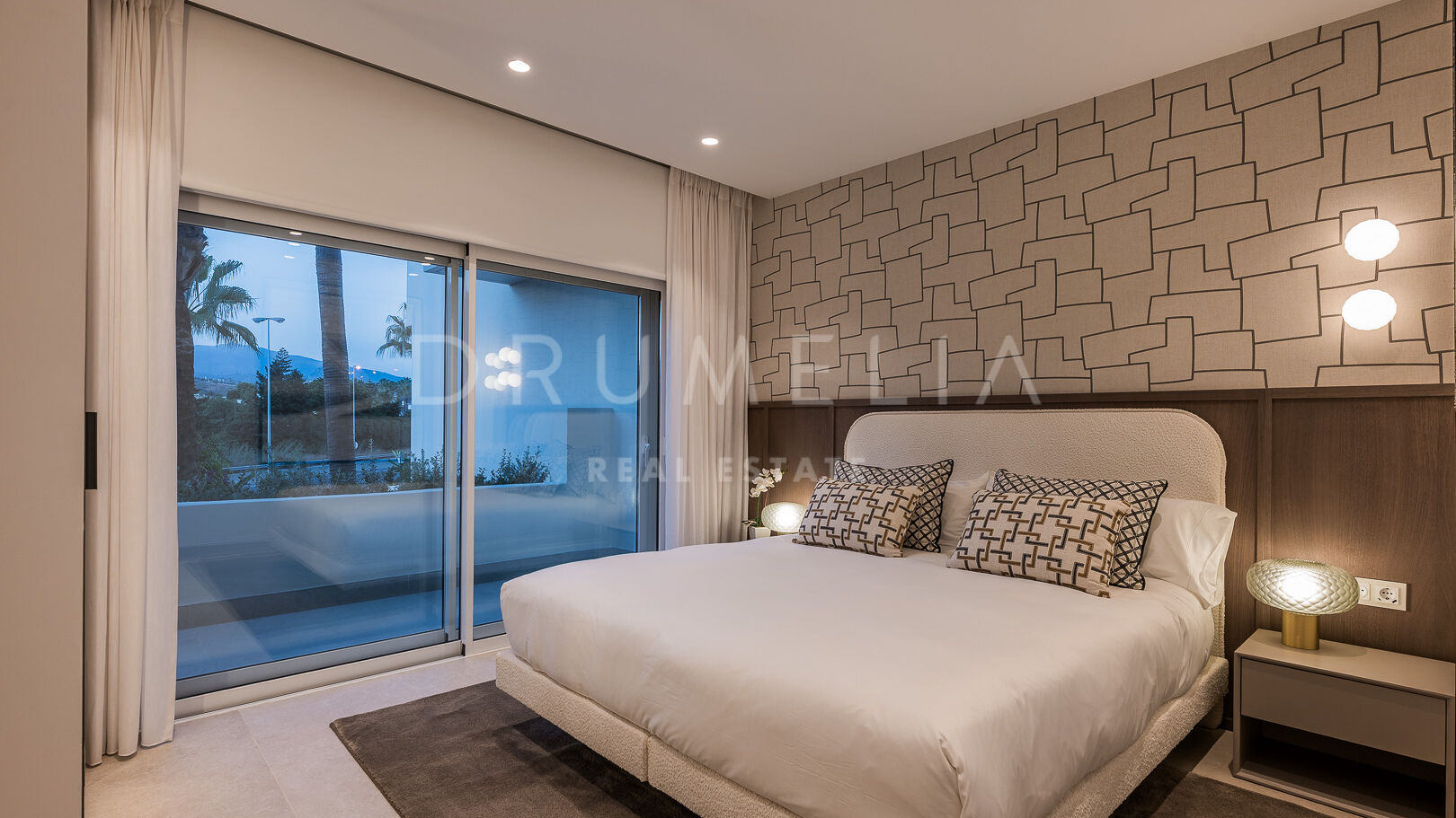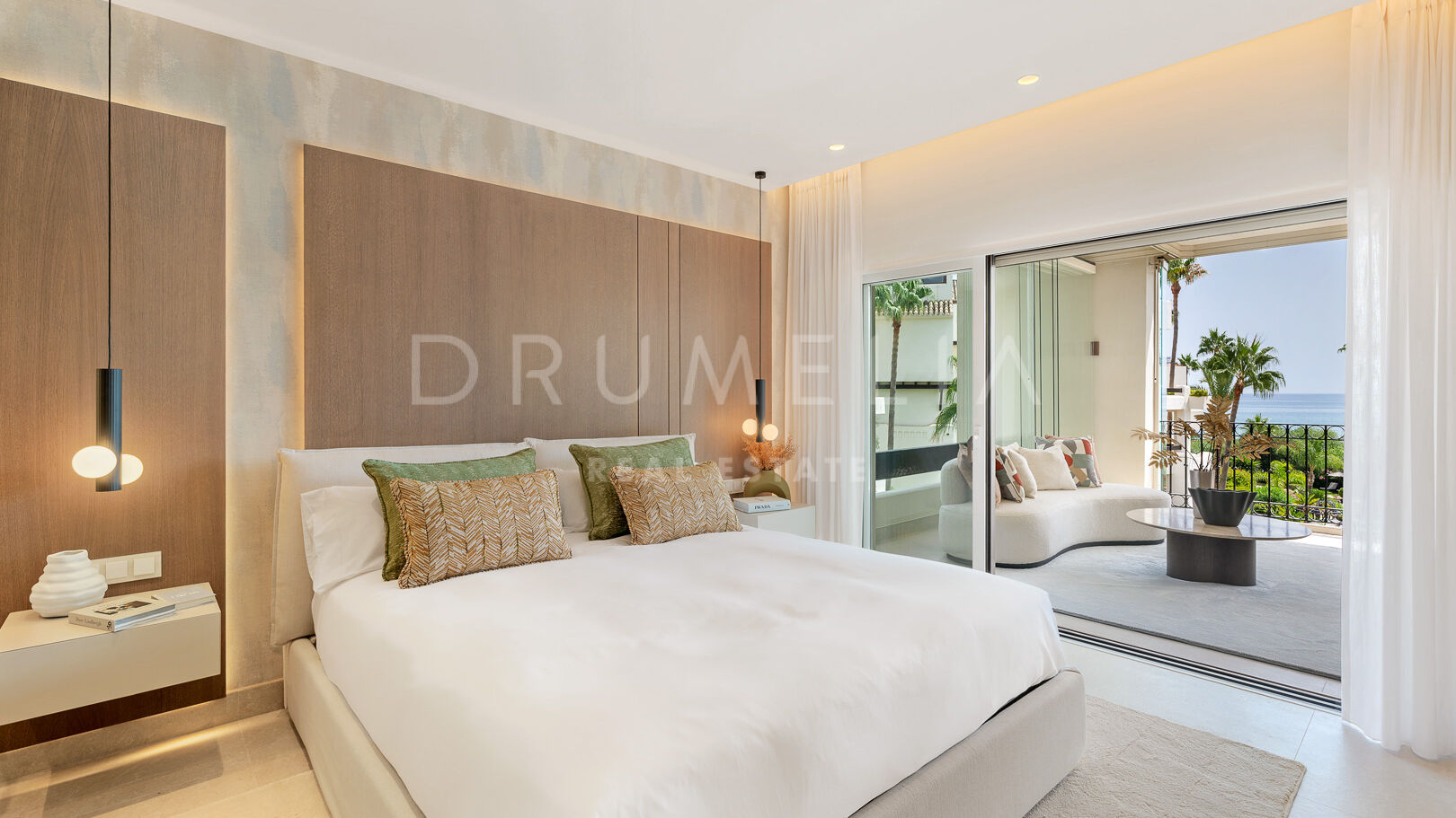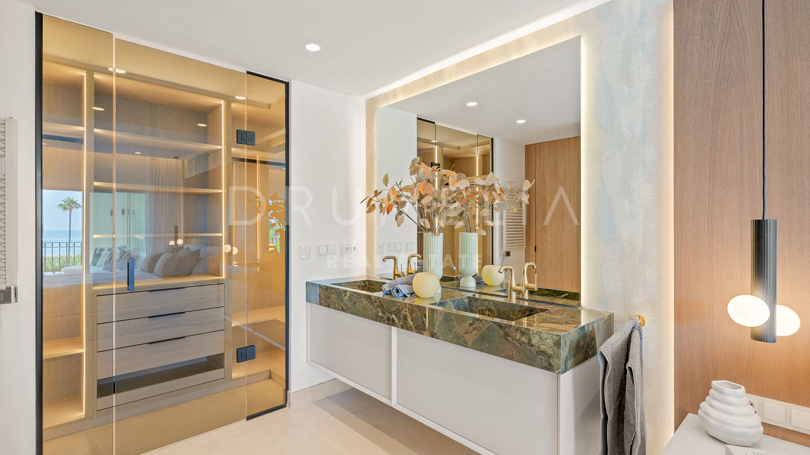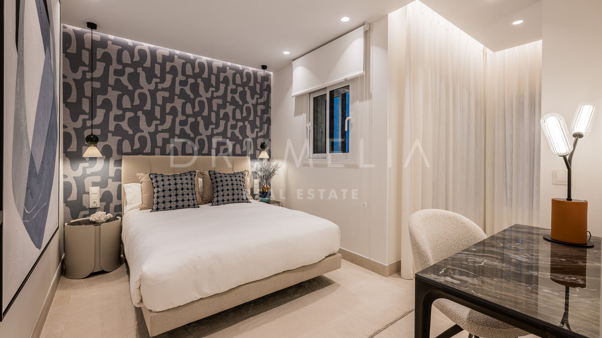 Wewnątrz każdy detal odzwierciedla jakość i wyrafinowanie. Otwarta kuchnia to designerska wizytówka, wyposażona w najwyższej klasy niemieckie urządzenia i eleganckie wykończenia. Wysokiej jakości podłogi, szafy robione na zamówienie, stylowe, nowoczesne meble oraz elegancki kominek elektryczny tworzą ciepłą i luksusową atmosferę. Najwyższej klasy system nagłośnienia Bang & Olufsen stanowi dopełnienie tego w pełni umeblowanego apartamentu gotowego do zamieszkania.