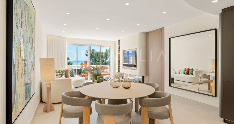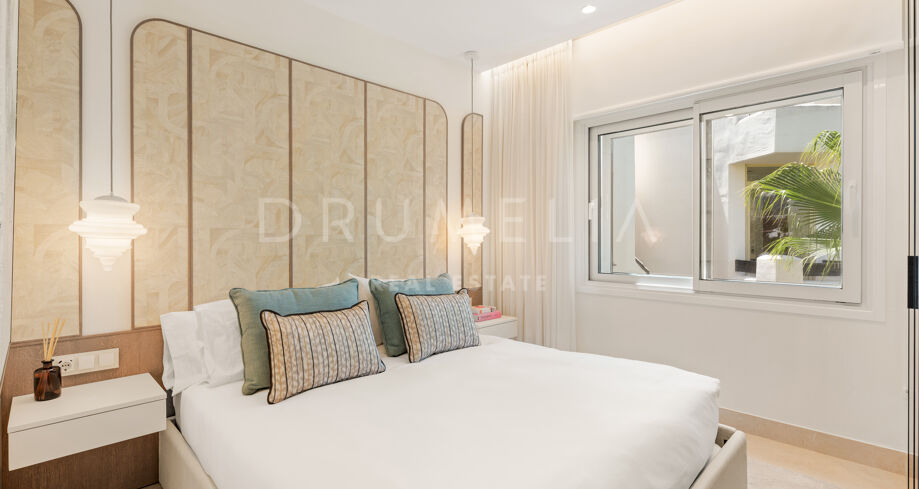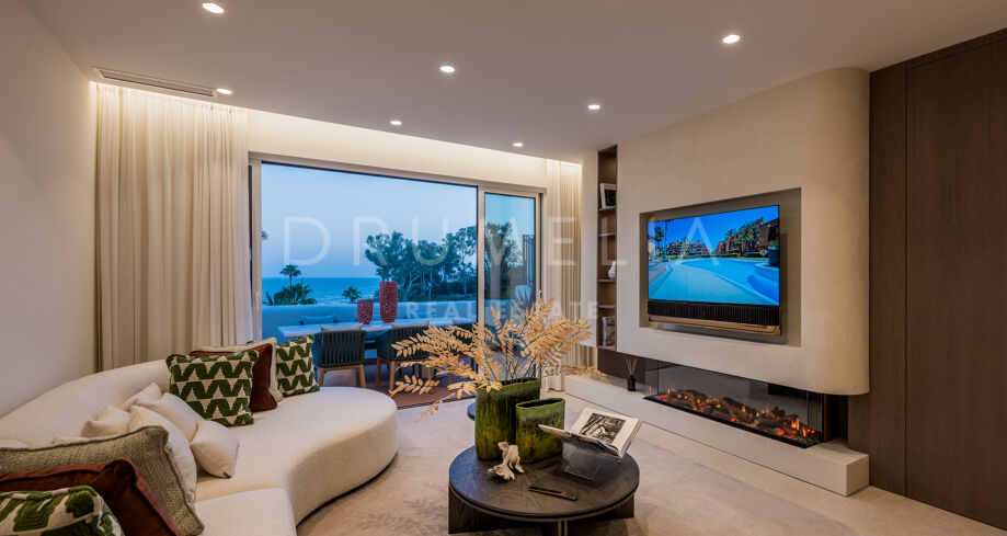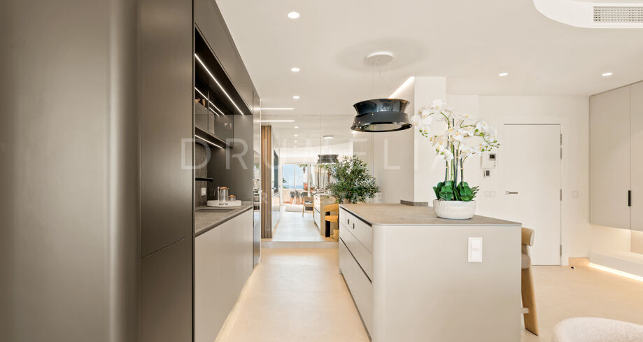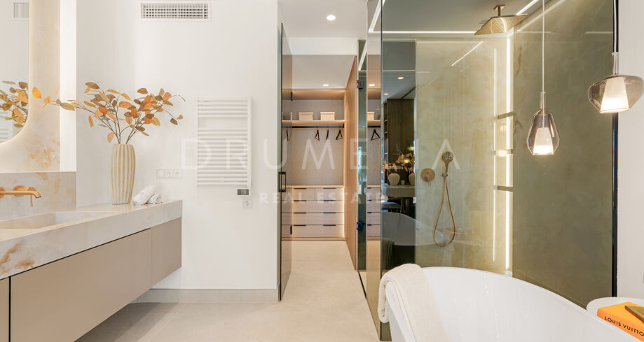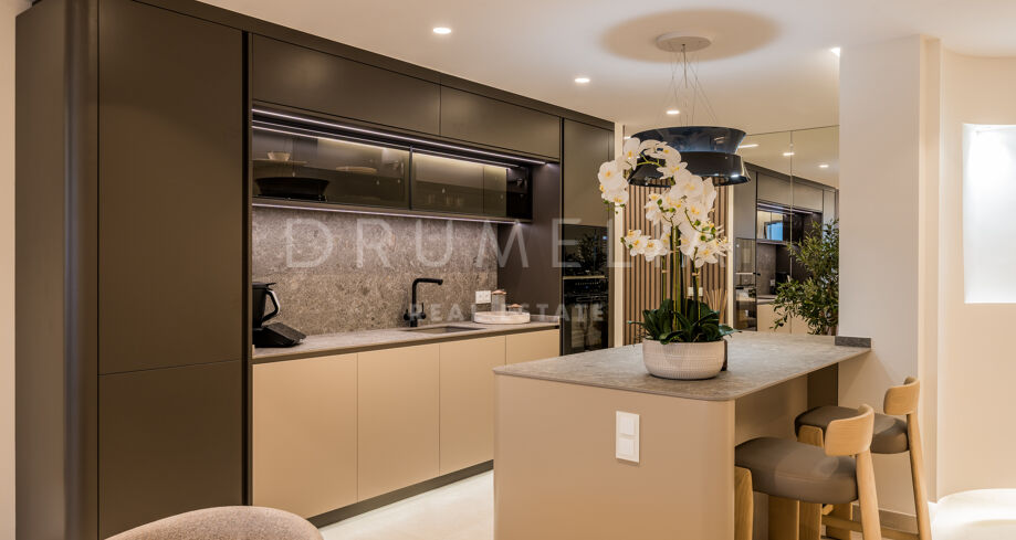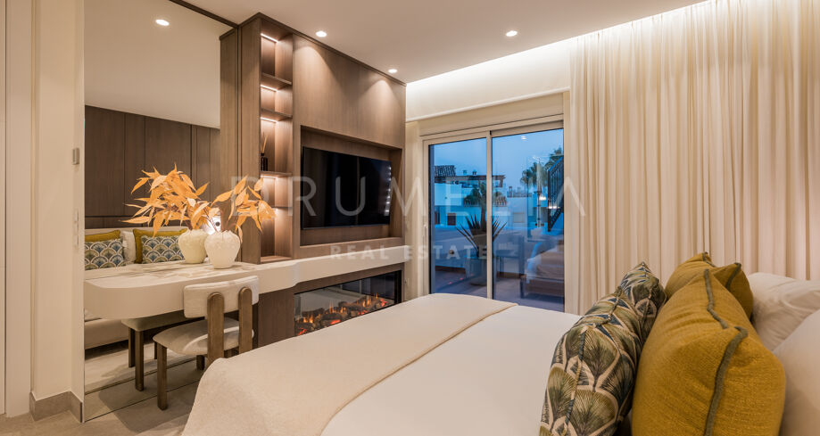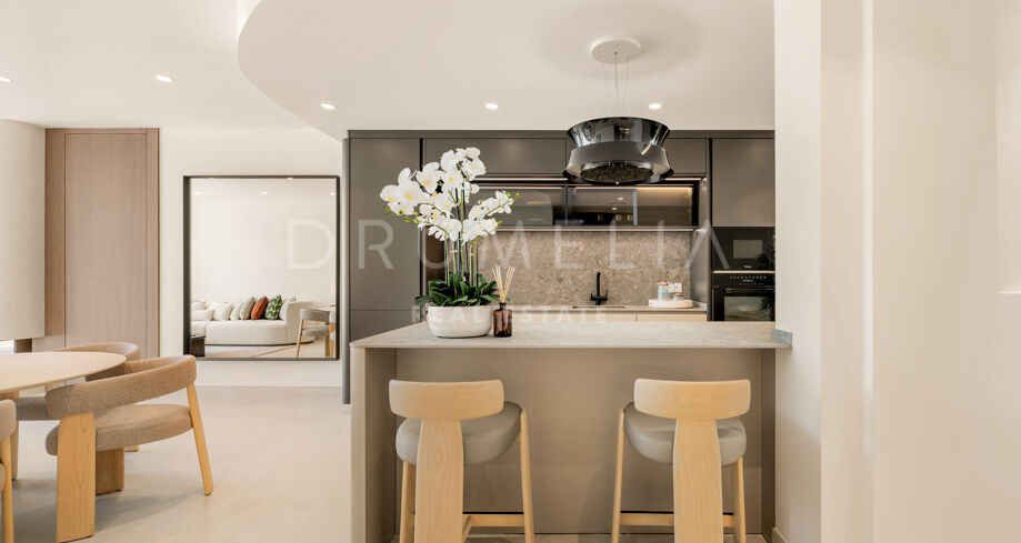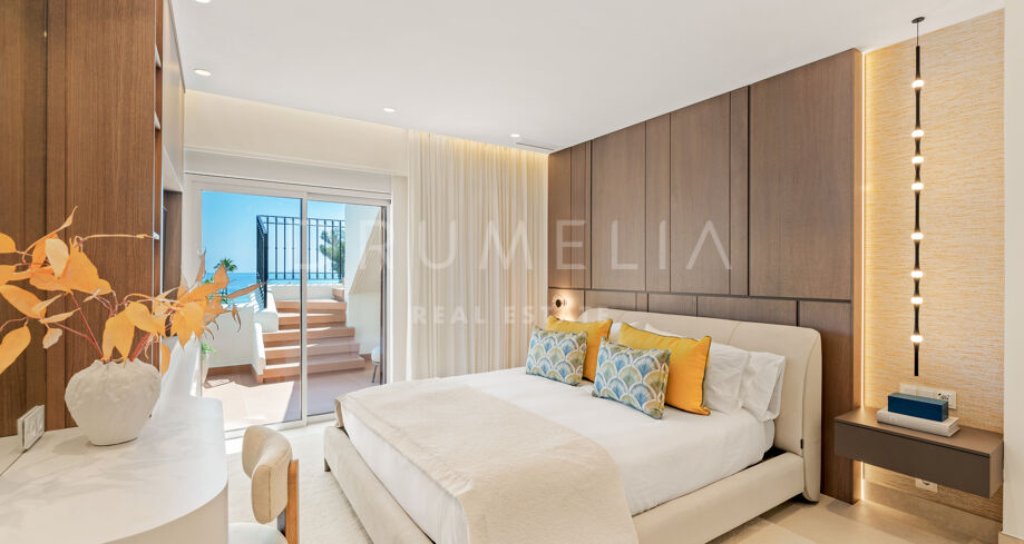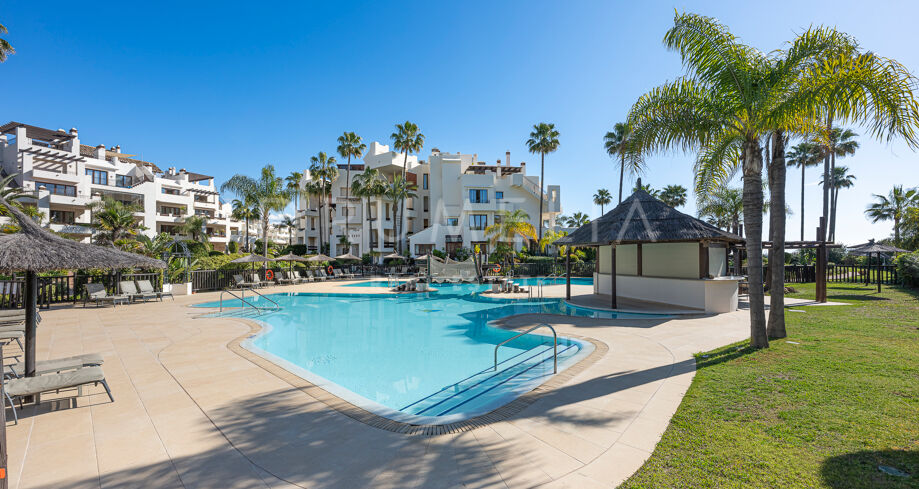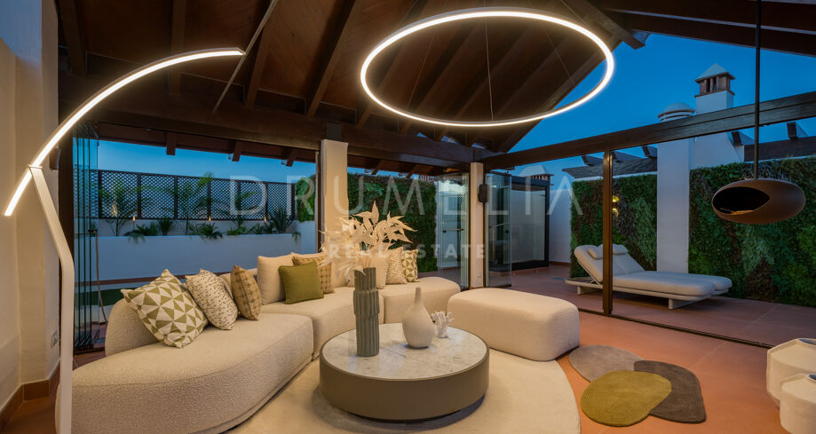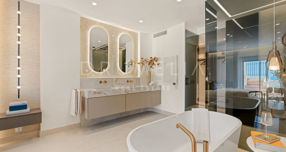 Położony w ekskluzywnej, nadmorskiej enklawie Bahía del Velerín, pomiędzy Marbellą a Esteponą, ten w pełni odnowiony apartament na ostatnim piętrze oferuje niepowtarzalne połączenie nowoczesnego luksusu i śródziemnomorskiego stylu życia. Nieruchomość znajduje się na terenie strzeżonego, całodobowego osiedla z bujnymi, tropikalnymi ogrodami, spokojnym basenem w stylu laguny oraz uroczym chiringuito przy plaży, oddającym klimat nadmorskiego kurortu.