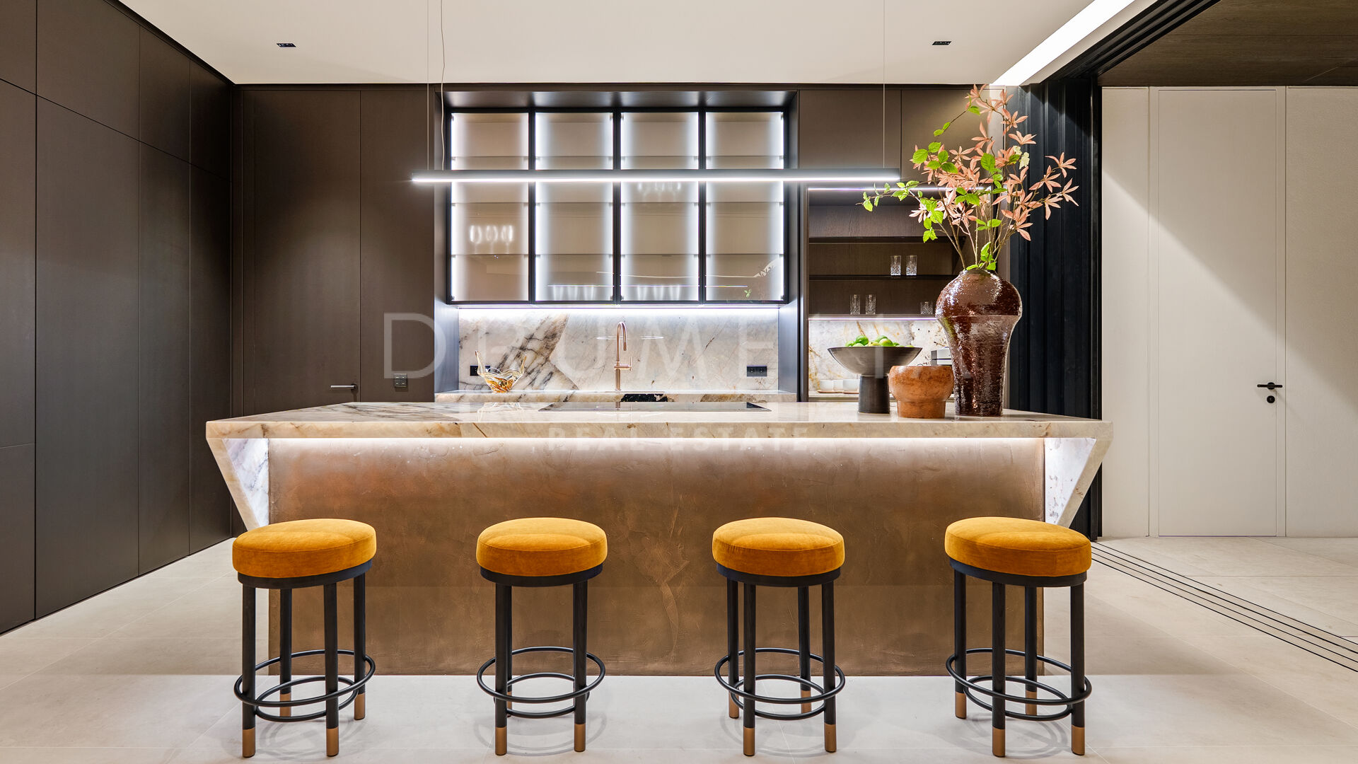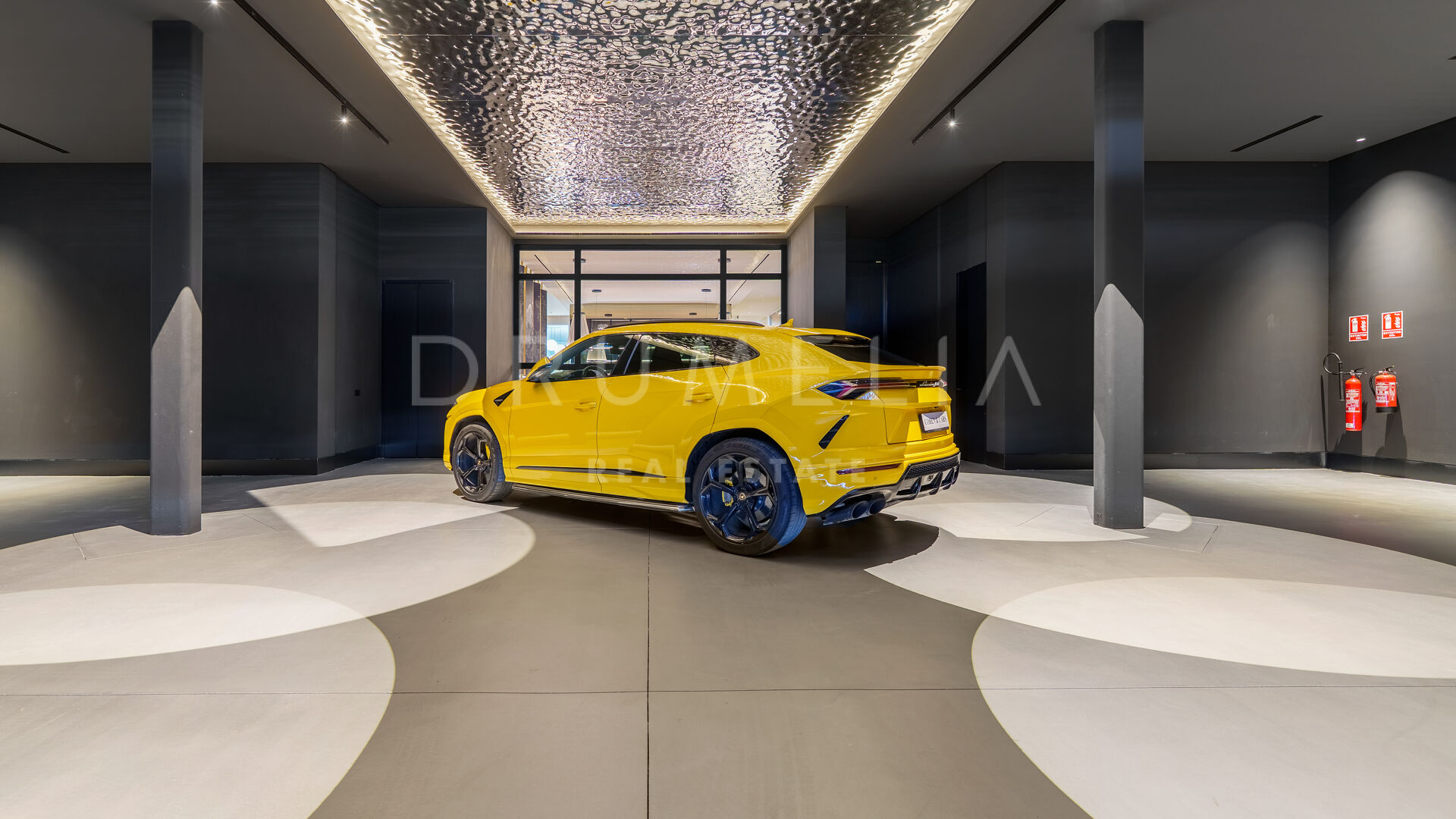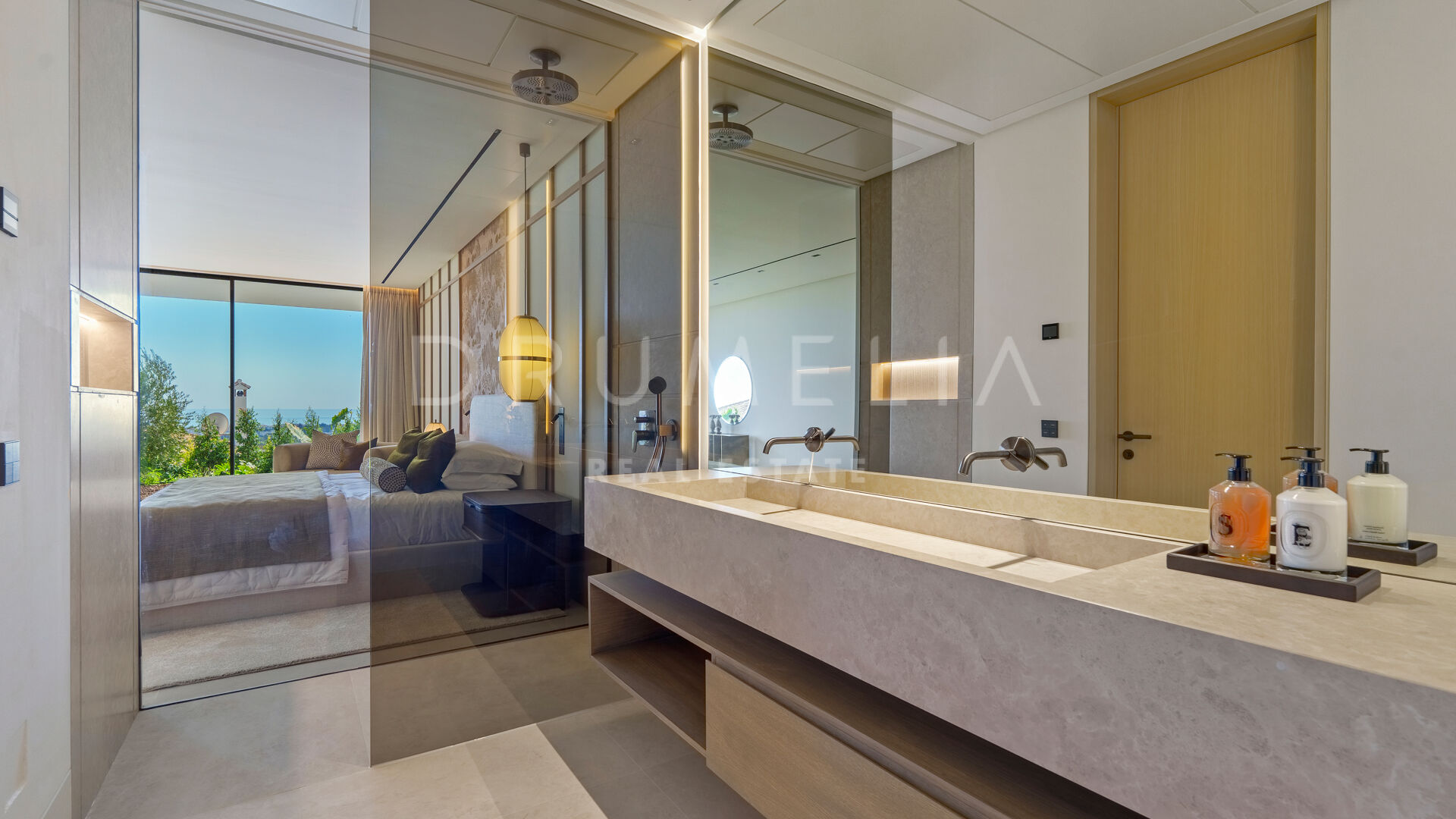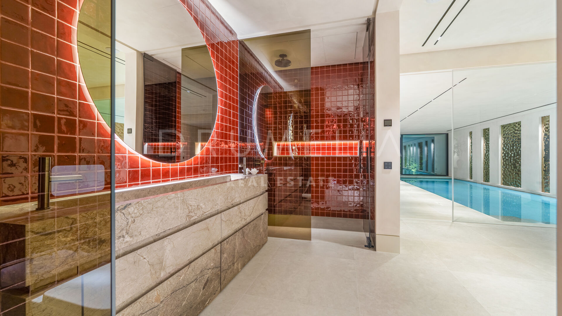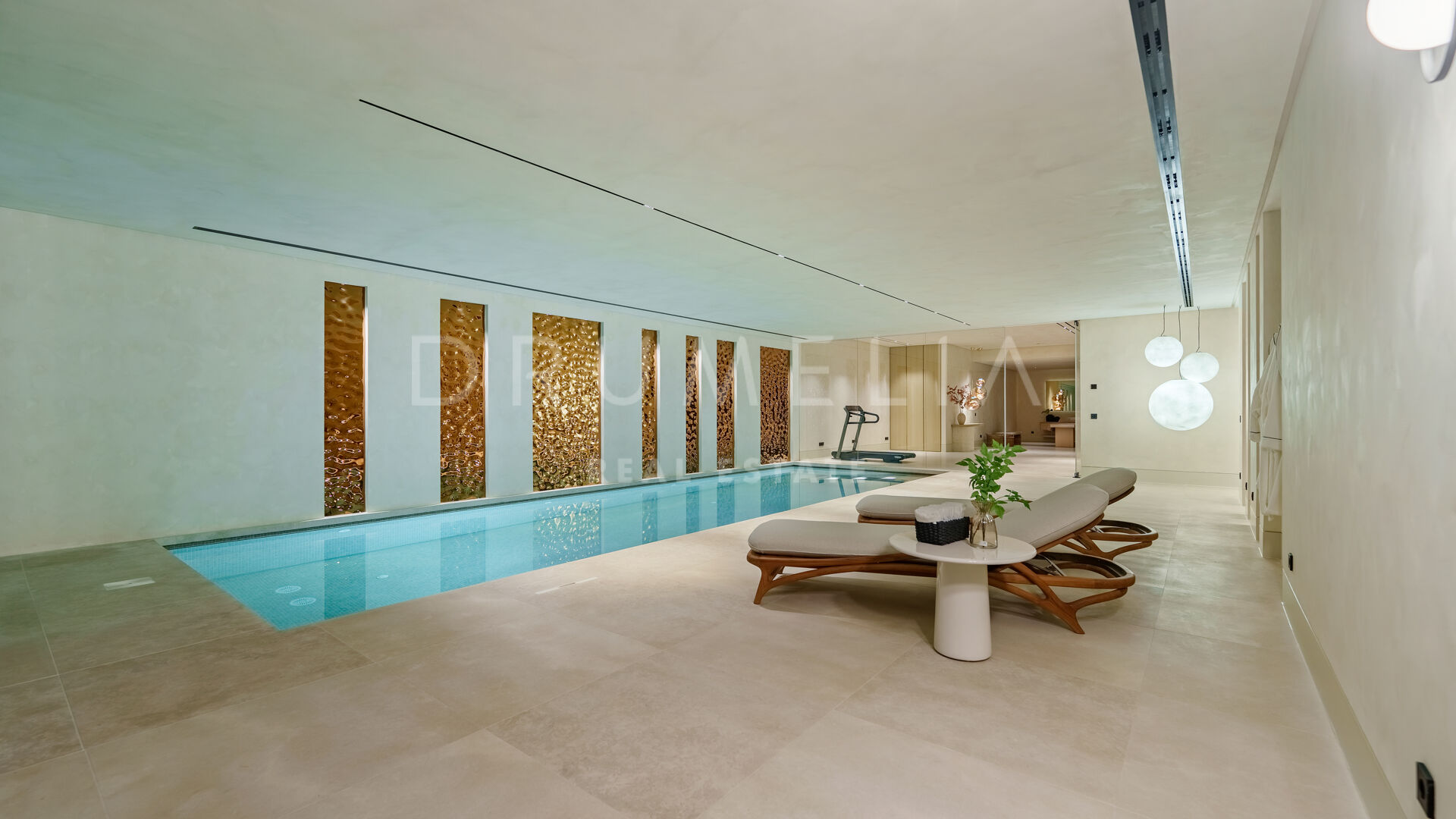 Dolna kondygnacja o powierzchni około 800 m² została przeznaczona na rekreację i wellness – siłownię, spa z krytym basenem i jacuzzi, kino, strefy wypoczynkowe i biuro, wszystko z dostępem światła dziennego. Garaż na osiem samochodów oraz trzy dodatkowe sypialnie, w tym jedna z osobnym wejściem i aneksem kuchennym, dopełniają całości. Zaledwie dziesięć minut od Puerto Banús, otoczona polami golfowymi, ta willa łączy innowacyjną architekturę, nowoczesną technologię i najwyższy komfort w jednym z najbardziej prestiżowych miejsc w Marbelli.