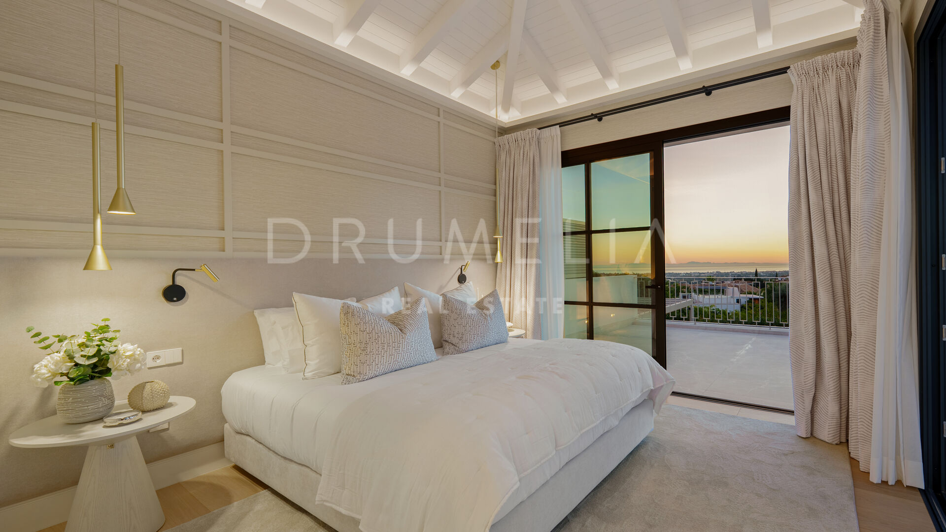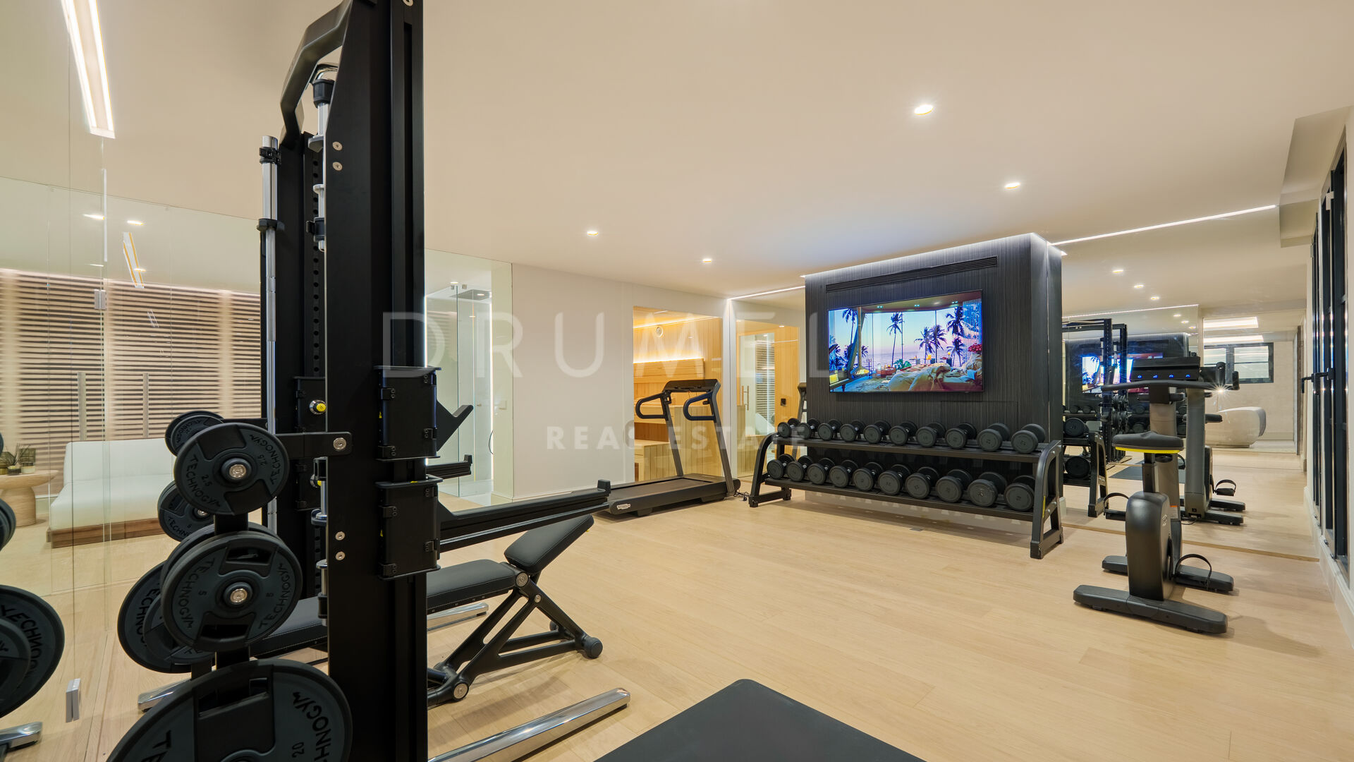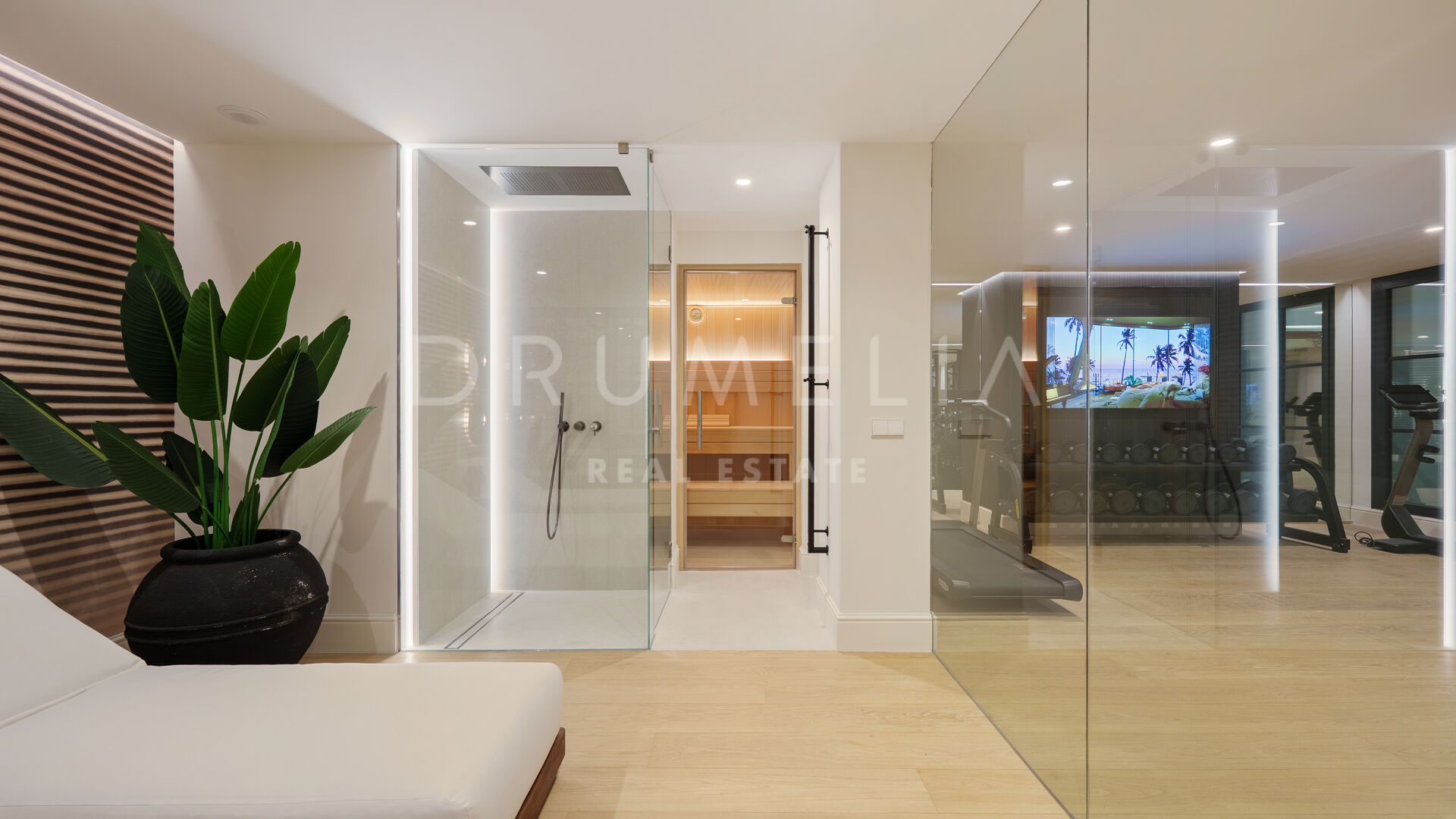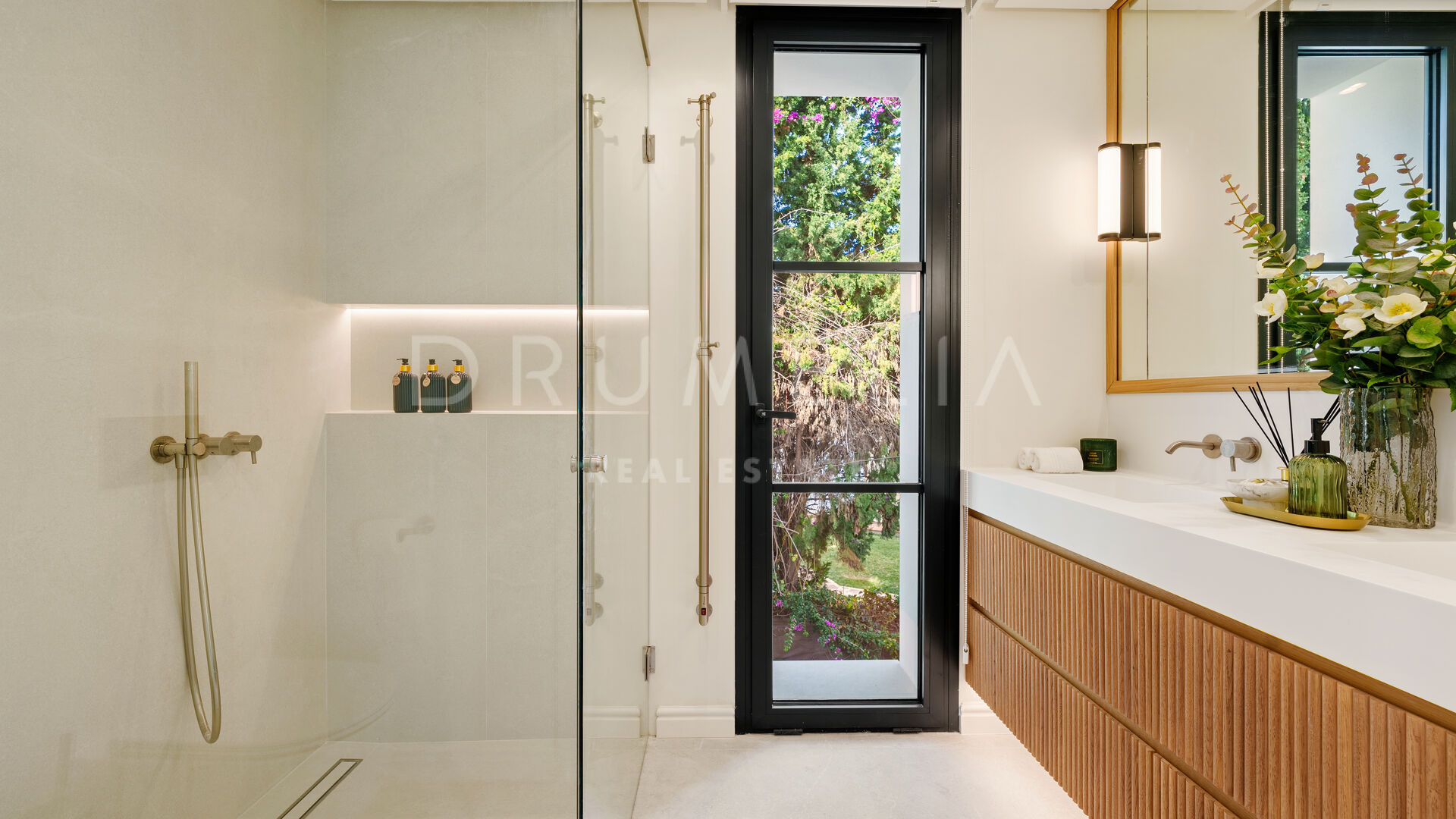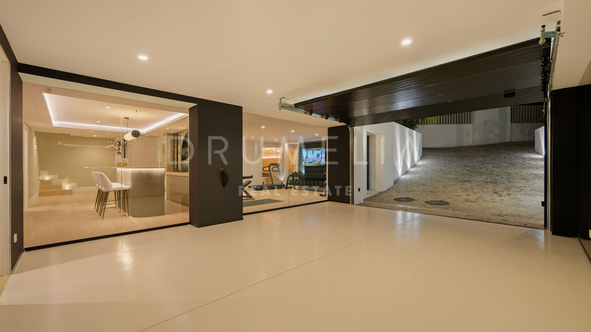 Dom oferuje pięć sypialni, w tym główną na piętrze z bezpośrednim wyjściem na taras. Wszystkie przestrzenie utrzymano w spójnej estetyce z neutralną kolorystyką, indywidualnie wykonaną stolarką i przemyślanym oświetleniem. Poziom rekreacyjny obejmuje wielofunkcyjne pomieszczenie, siłownię, saunę i klimatyzowaną piwniczkę na wino. Na zewnątrz znajduje się kilka stref wypoczynkowych i jadalnianych wokół ogrodu i prywatnego basenu. Lokalizacja zapewnia szybki dostęp do pól golfowych, szkół międzynarodowych oraz udogodnień Nueva Andalucía i Marbelli.