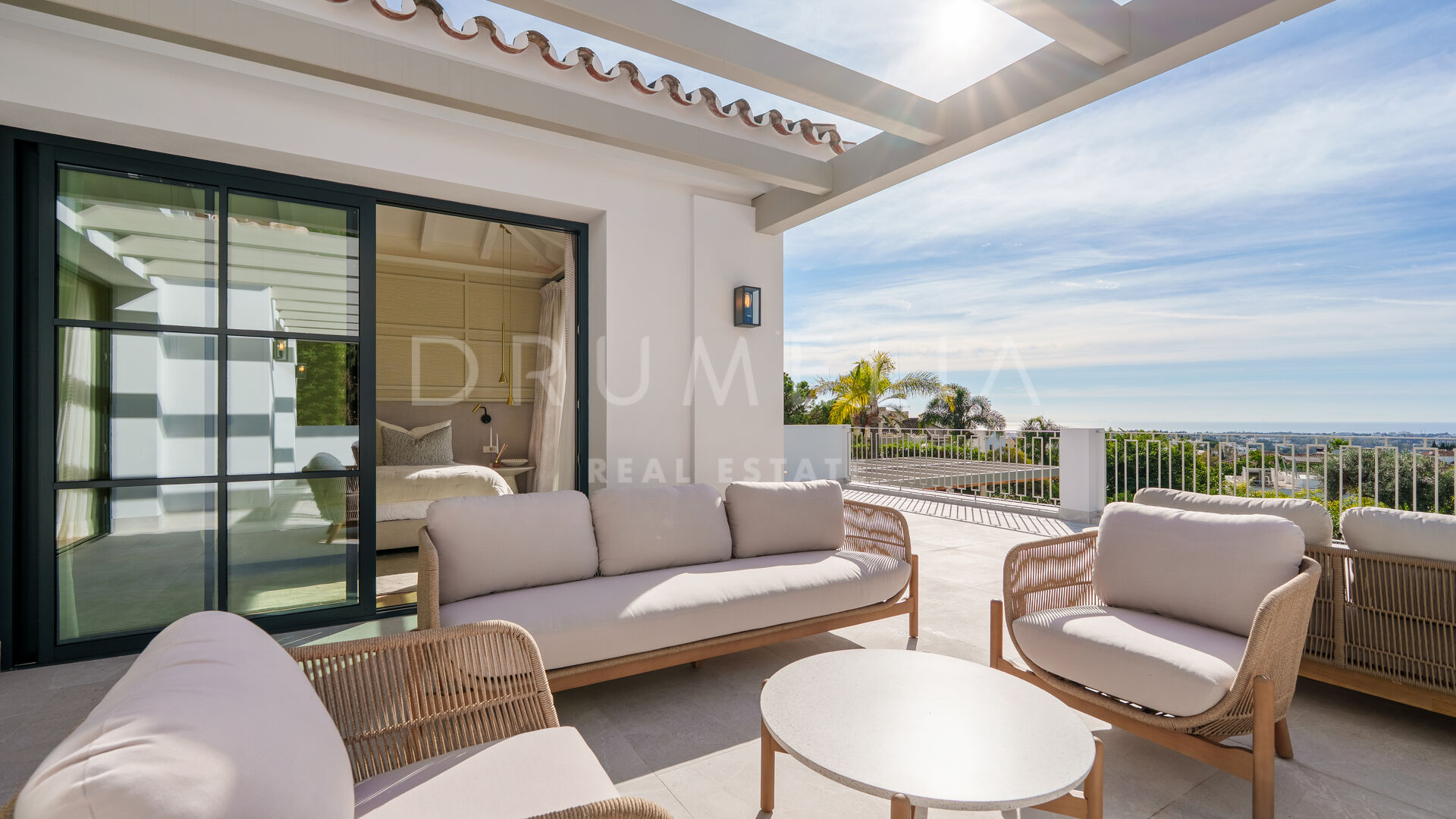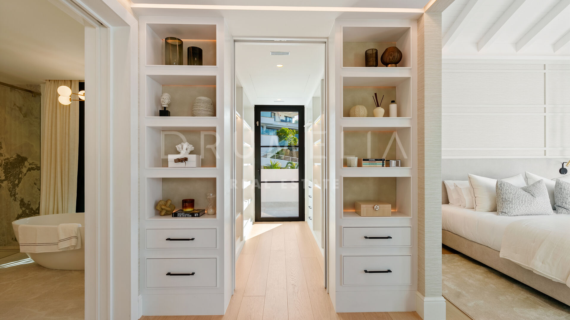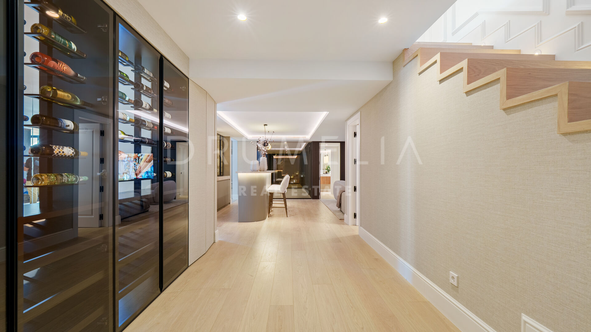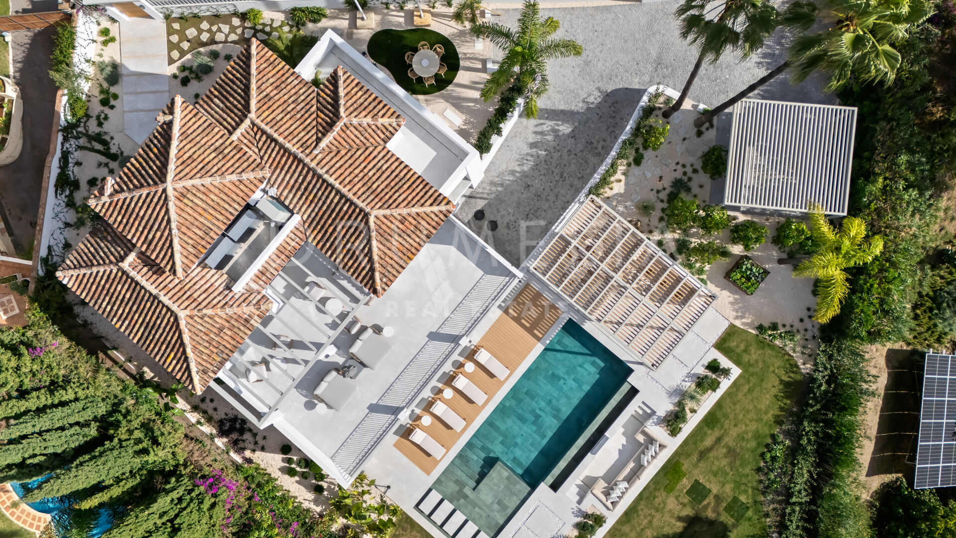 Dom oferuje pięć sypialni, w tym główną na piętrze z bezpośrednim wyjściem na taras. Wszystkie przestrzenie utrzymano w spójnej estetyce z neutralną kolorystyką, indywidualnie wykonaną stolarką i przemyślanym oświetleniem. Poziom rekreacyjny obejmuje wielofunkcyjne pomieszczenie, siłownię, saunę i klimatyzowaną piwniczkę na wino. Na zewnątrz znajduje się kilka stref wypoczynkowych i jadalnianych wokół ogrodu i prywatnego basenu. Lokalizacja zapewnia szybki dostęp do pól golfowych, szkół międzynarodowych oraz udogodnień Nueva Andalucía i Marbelli.
