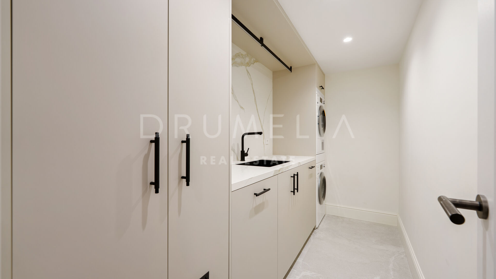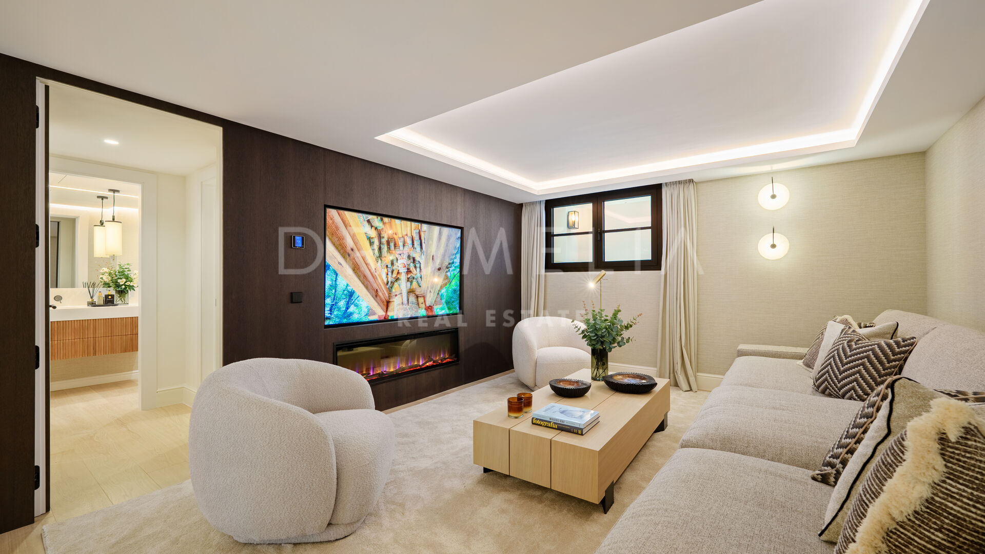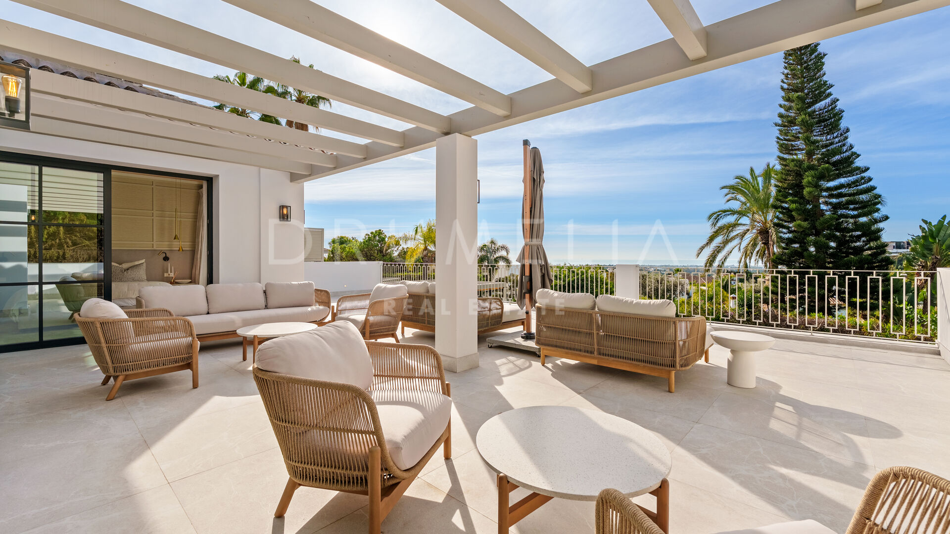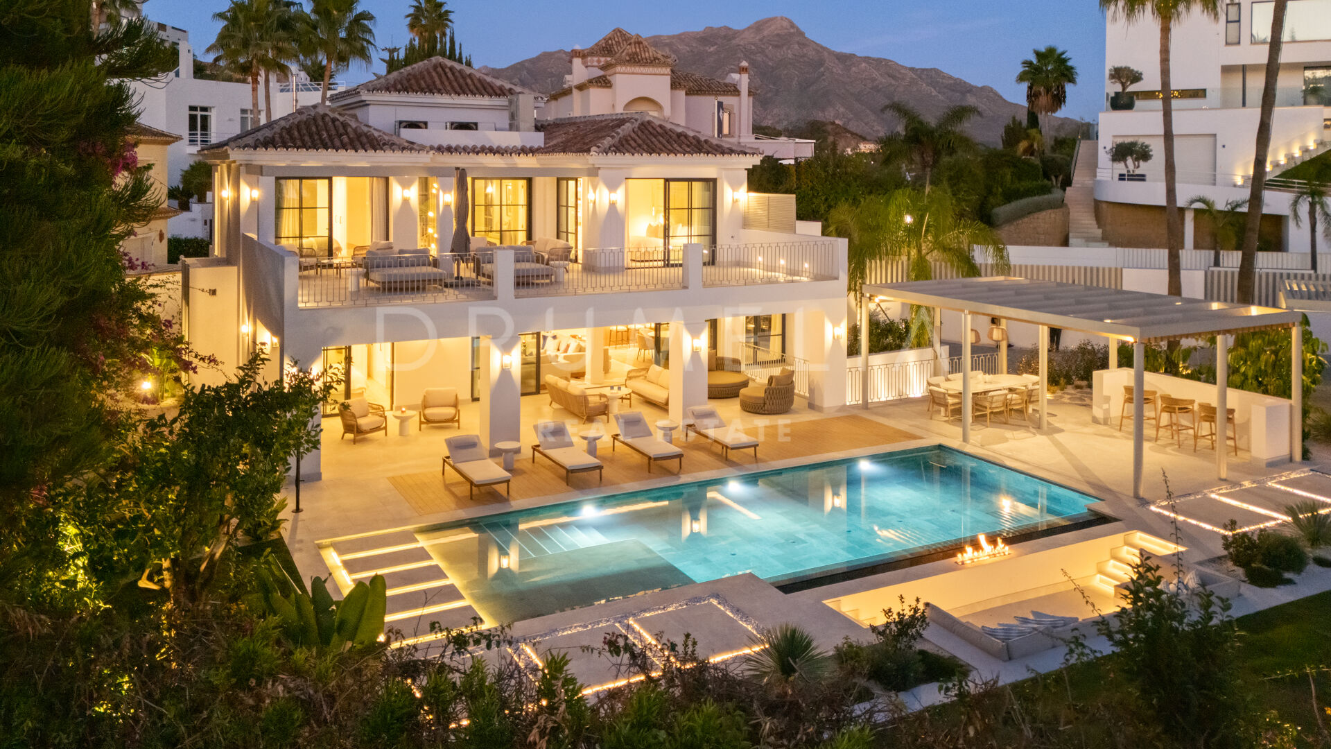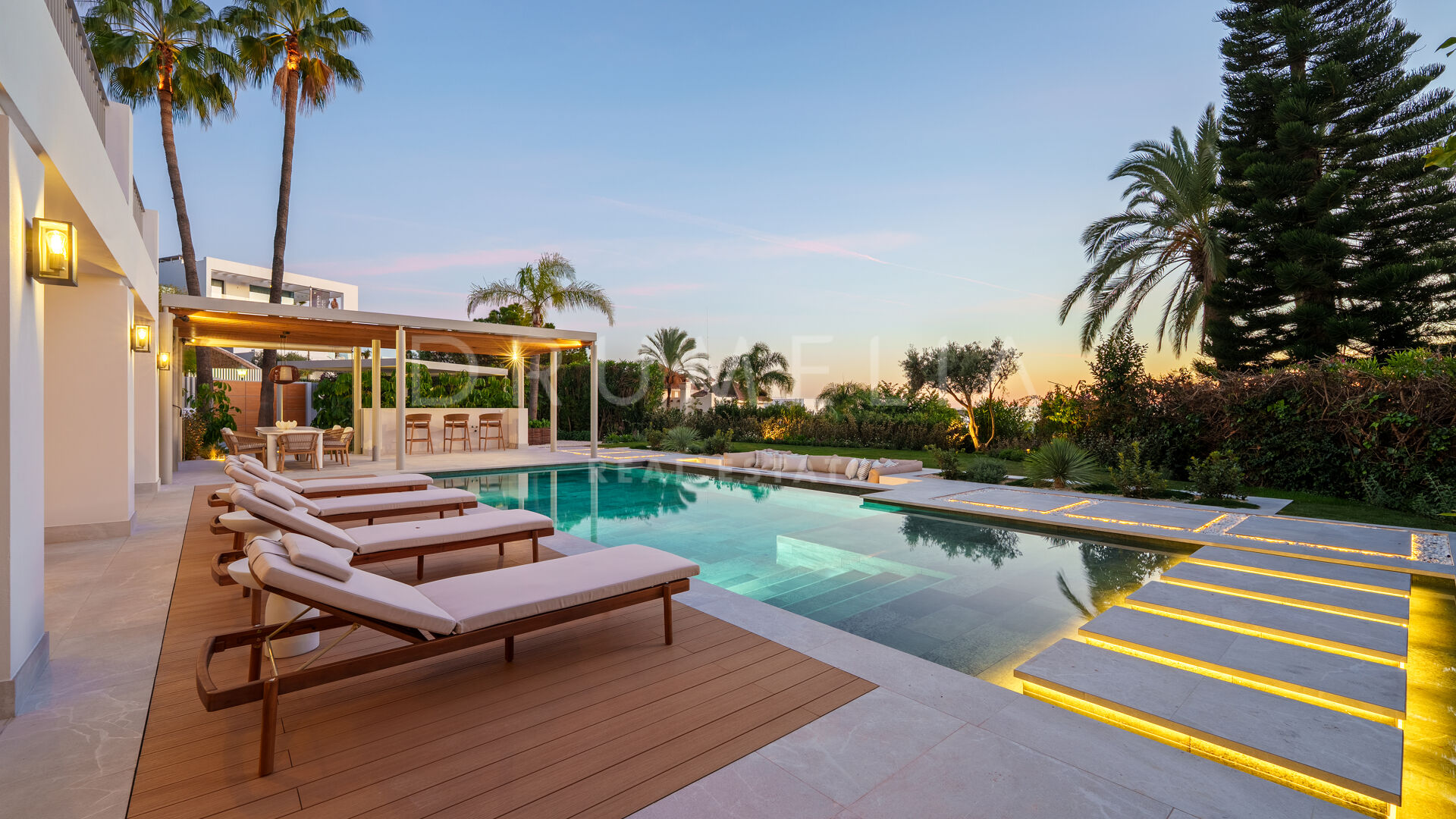 Dom oferuje pięć sypialni, w tym główną na piętrze z bezpośrednim wyjściem na taras. Wszystkie przestrzenie utrzymano w spójnej estetyce z neutralną kolorystyką, indywidualnie wykonaną stolarką i przemyślanym oświetleniem. Poziom rekreacyjny obejmuje wielofunkcyjne pomieszczenie, siłownię, saunę i klimatyzowaną piwniczkę na wino. Na zewnątrz znajduje się kilka stref wypoczynkowych i jadalnianych wokół ogrodu i prywatnego basenu. Lokalizacja zapewnia szybki dostęp do pól golfowych, szkół międzynarodowych oraz udogodnień Nueva Andalucía i Marbelli.