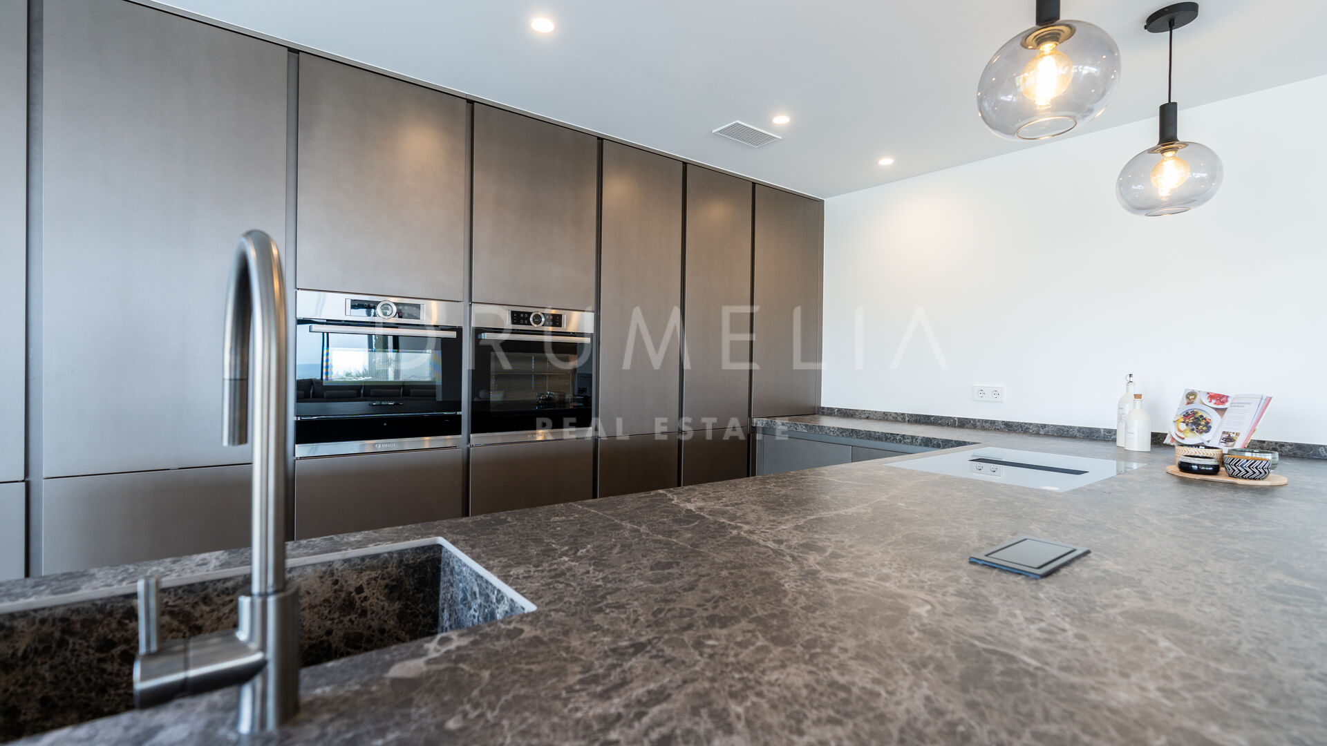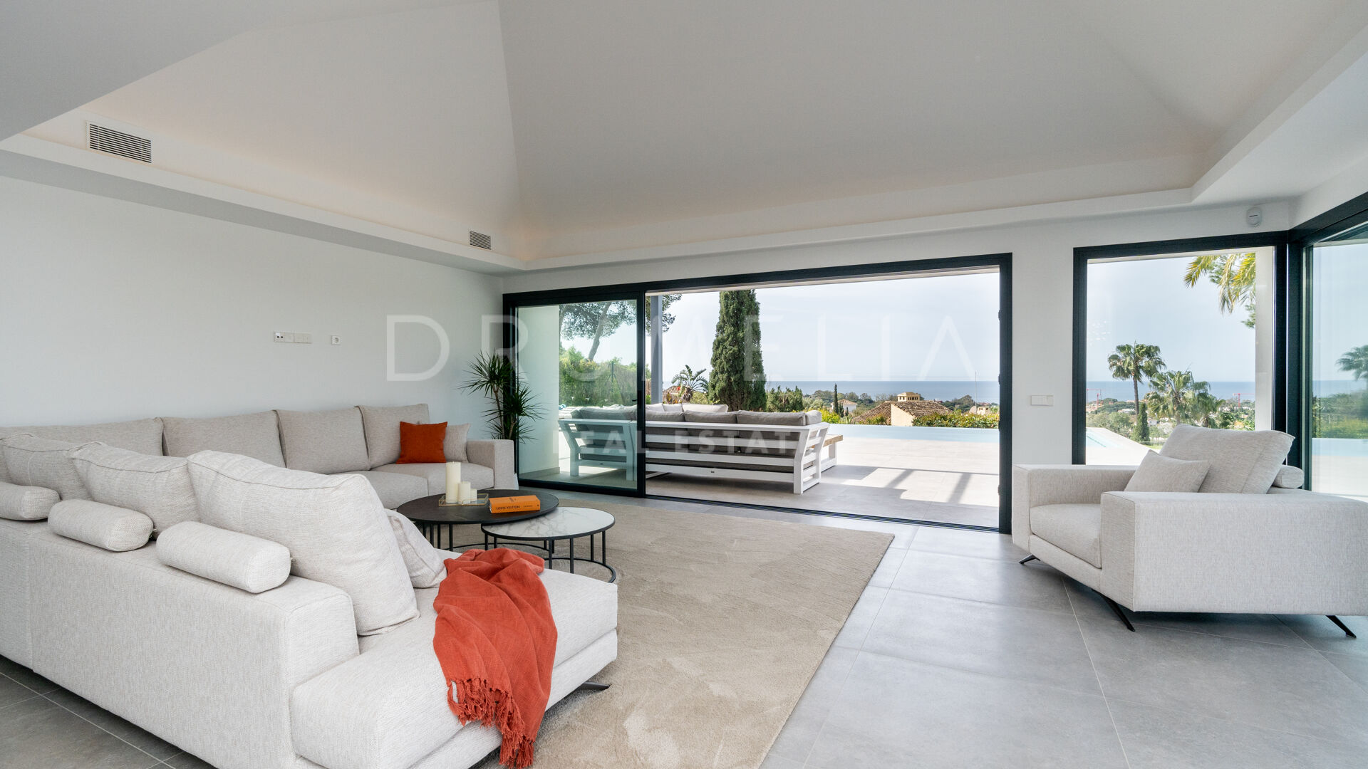 Obejmująca 280 m² starannie zaprojektowanej przestrzeni mieszkalnej, jednopoziomowa willa ma otwarty układ, który płynnie łączy najnowocześniejszą kuchnię wyposażoną w najwyższej klasy sprzęt AGD z jasnym i przestronnym salonem z kominkiem na bioetanol. Główny apartament, strategicznie umieszczony z przodu willi, otwiera się na taras z basenem bez krawędzi, oferując zapierające dech w piersiach widoki na morze. Każda z czterech sypialni posiada własną łazienkę, zapewniając prywatność i wygodę.