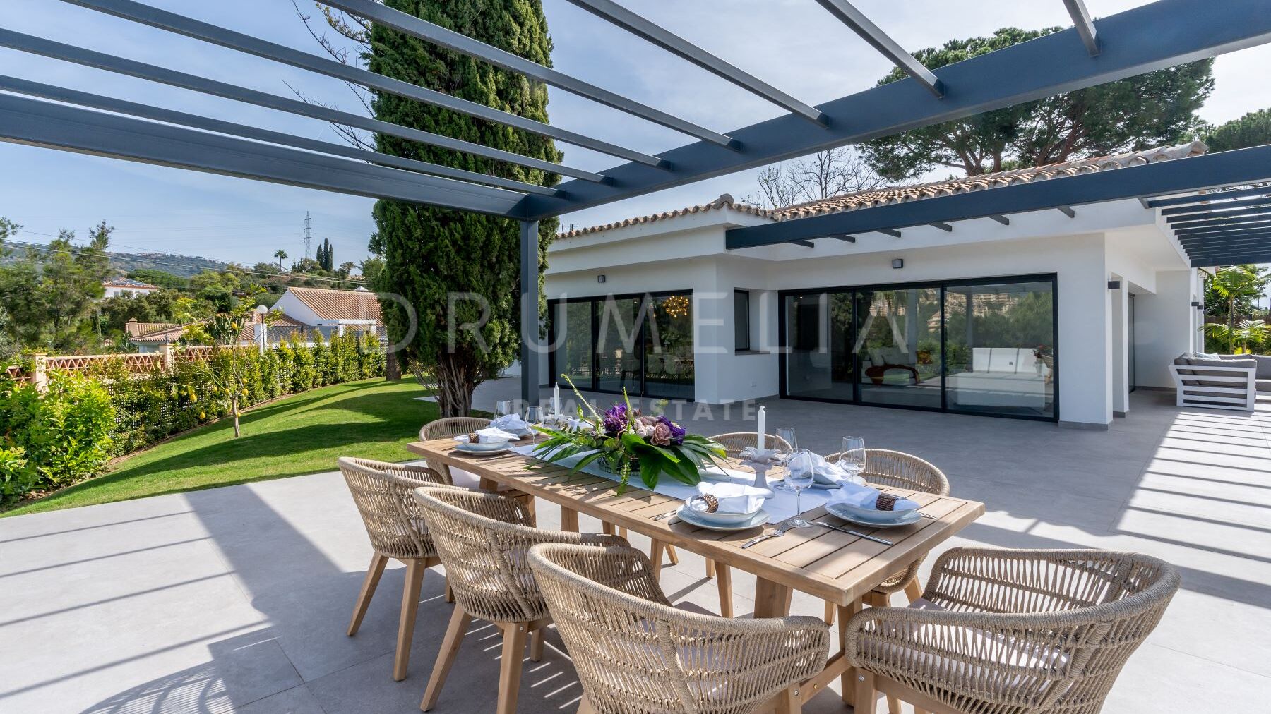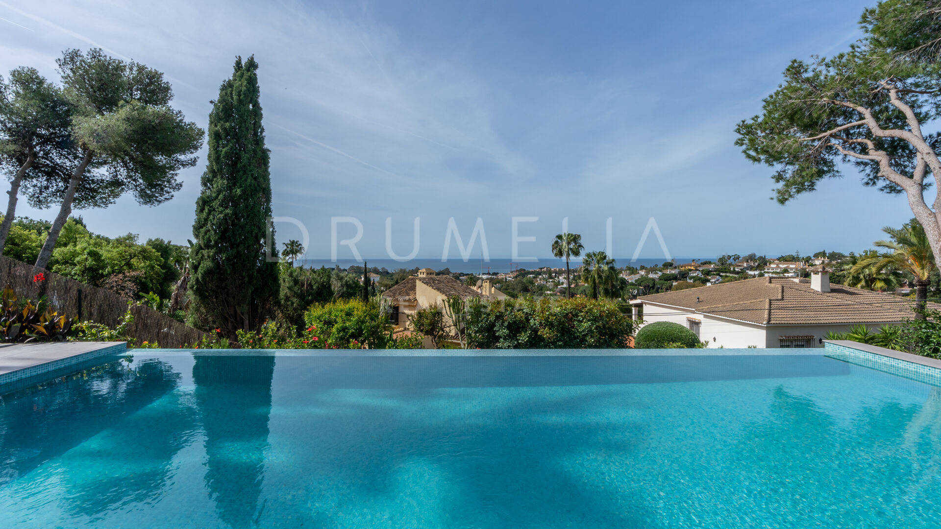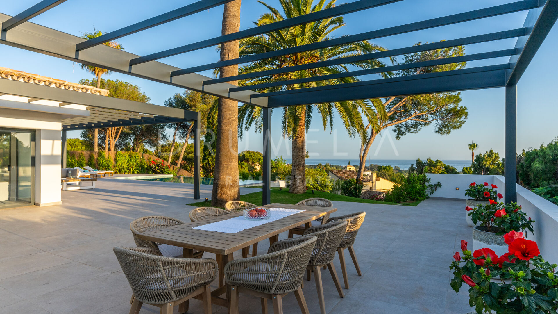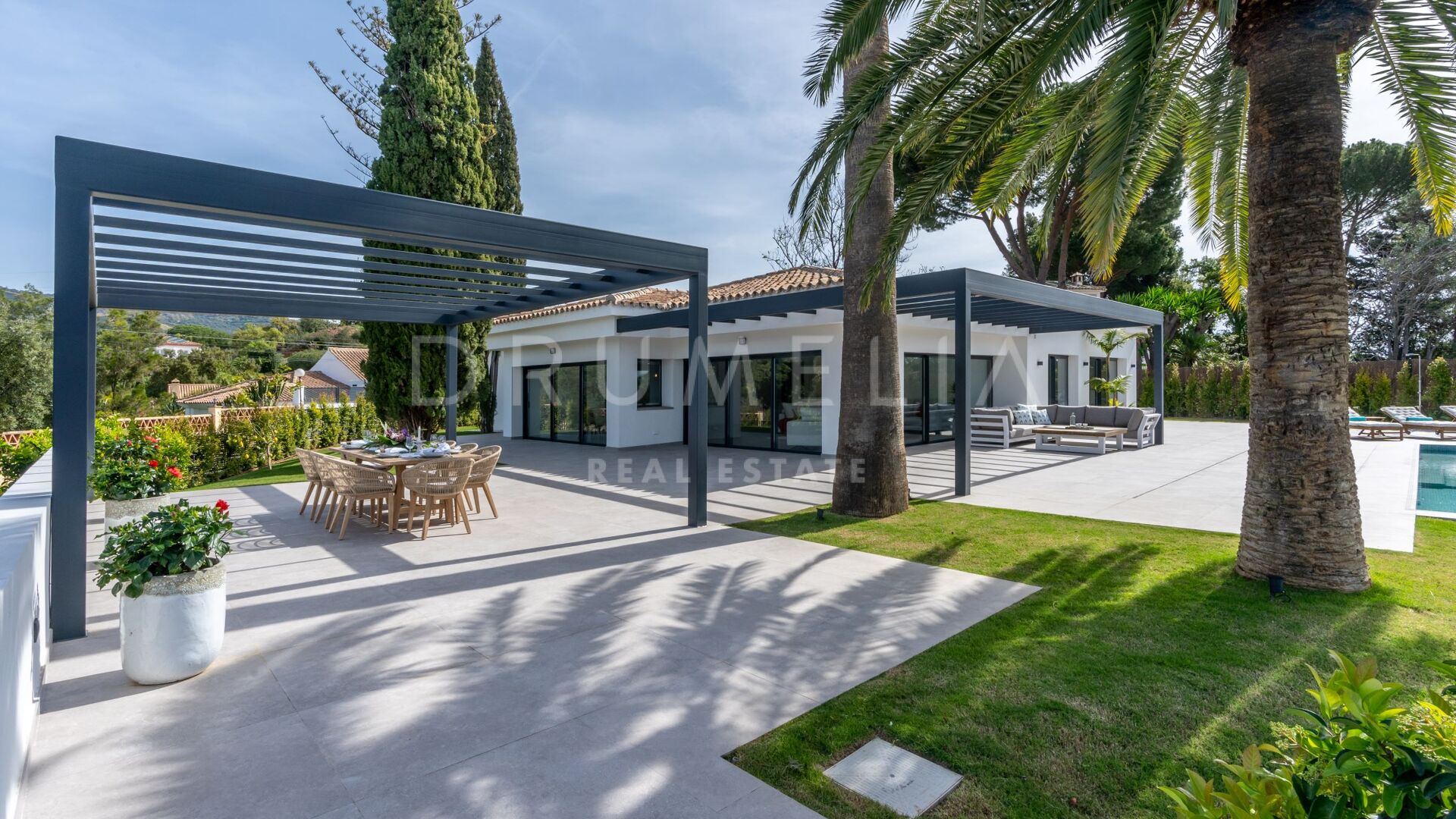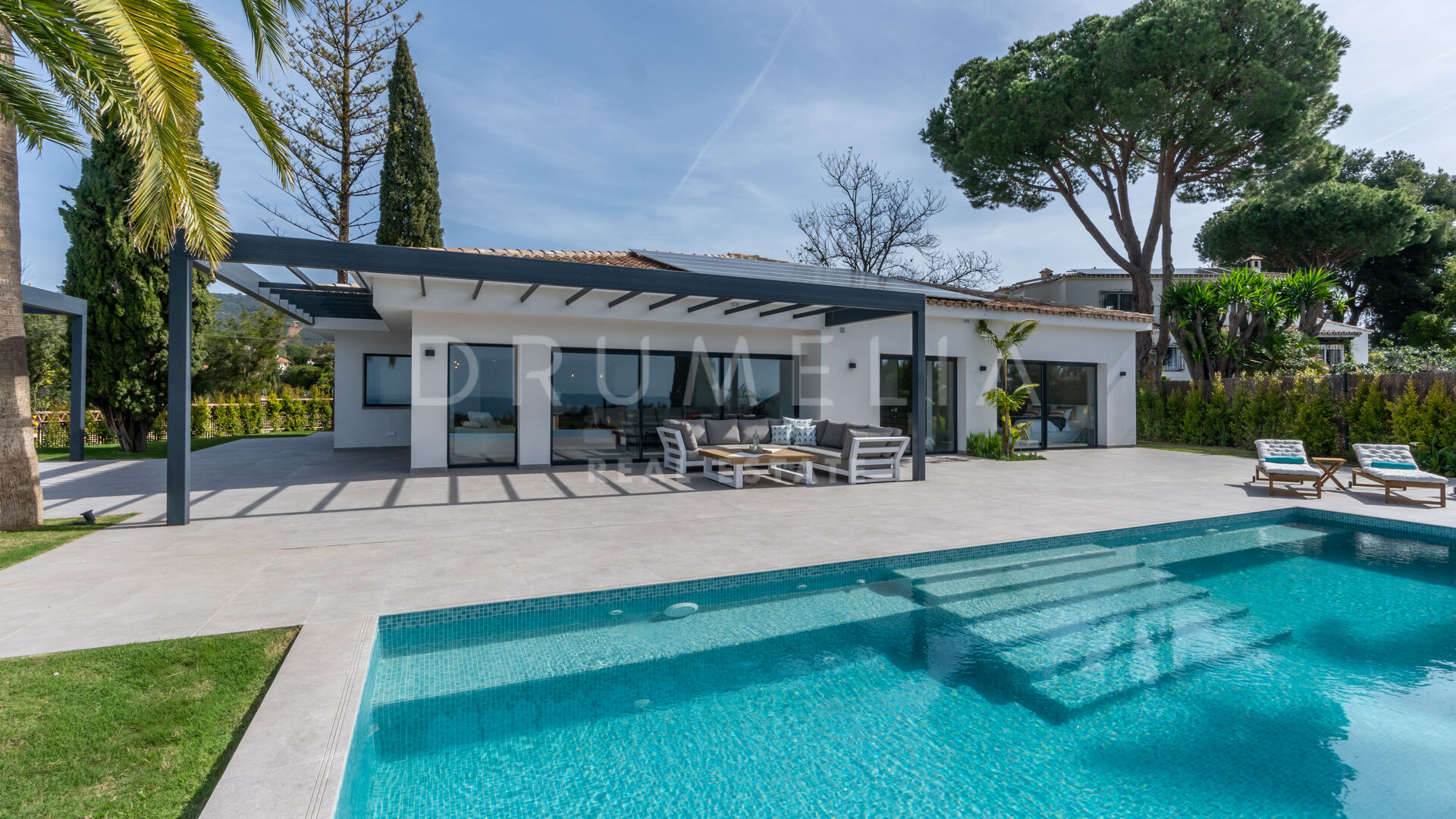 Obszar zewnętrzny jest równie imponujący, z nowo zaprojektowanym, łatwym w utrzymaniu ogrodem i basenem bez krawędzi o wymiarach 10 × 4,7 m. Rozległe tarasy o powierzchni 235 m² zapewniają dużo miejsca na posiłki na świeżym powietrzu, relaks i rozrywkę, a wszystko to w spokojnym otoczeniu, które zapewnia maksymalną prywatność. Pomimo spokojnej okolicy, willa jest dogodnie zlokalizowana w odległości krótkiego spaceru od udogodnień Elvirii i dziewiczych plaż.