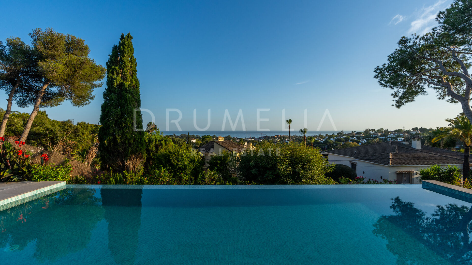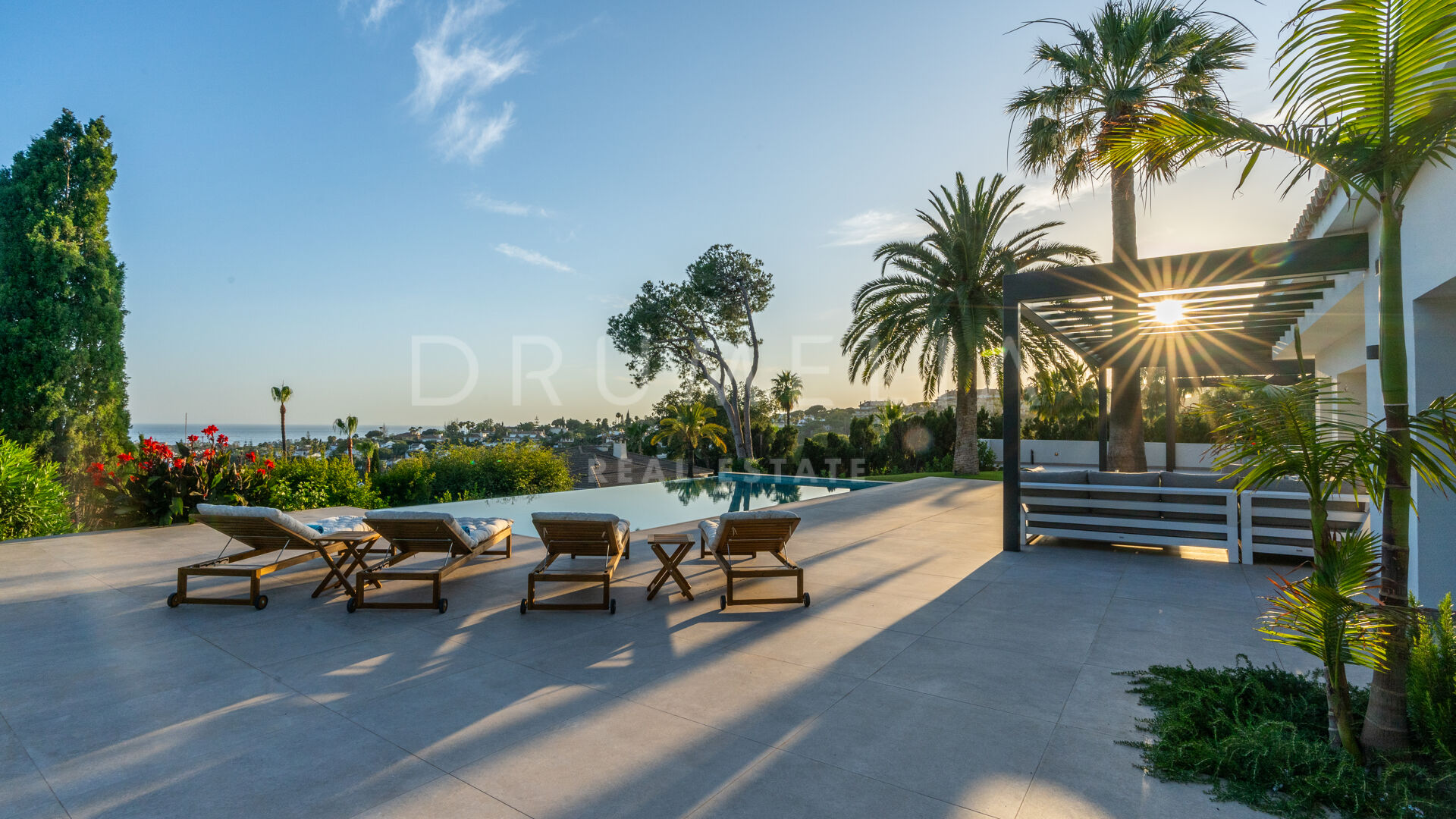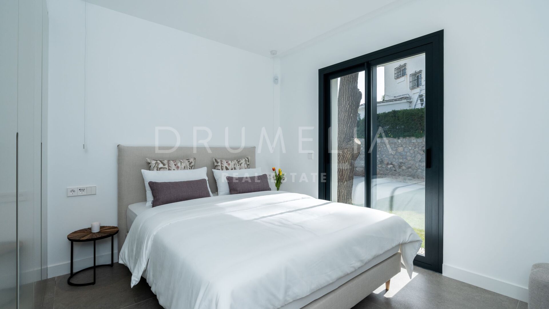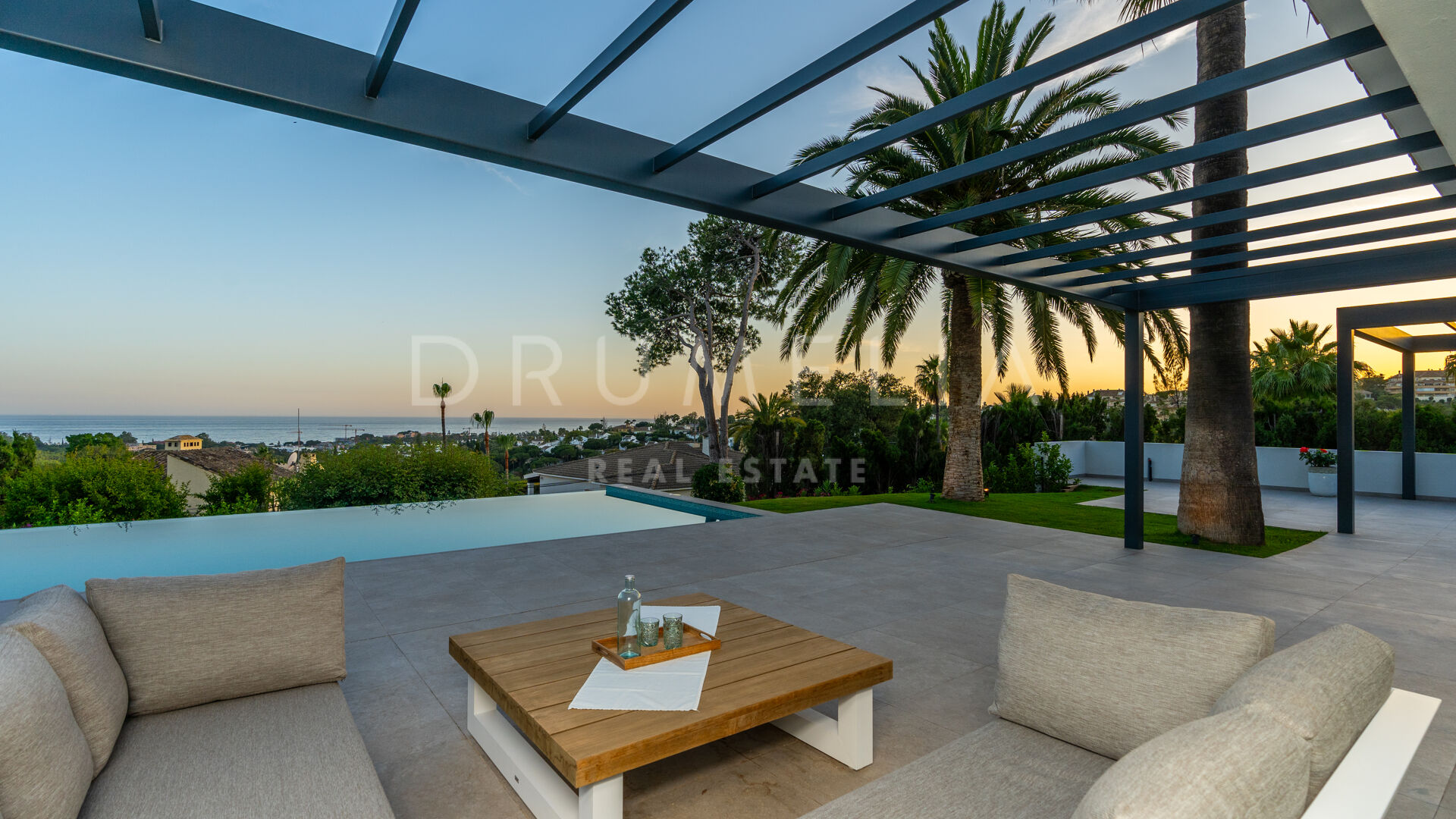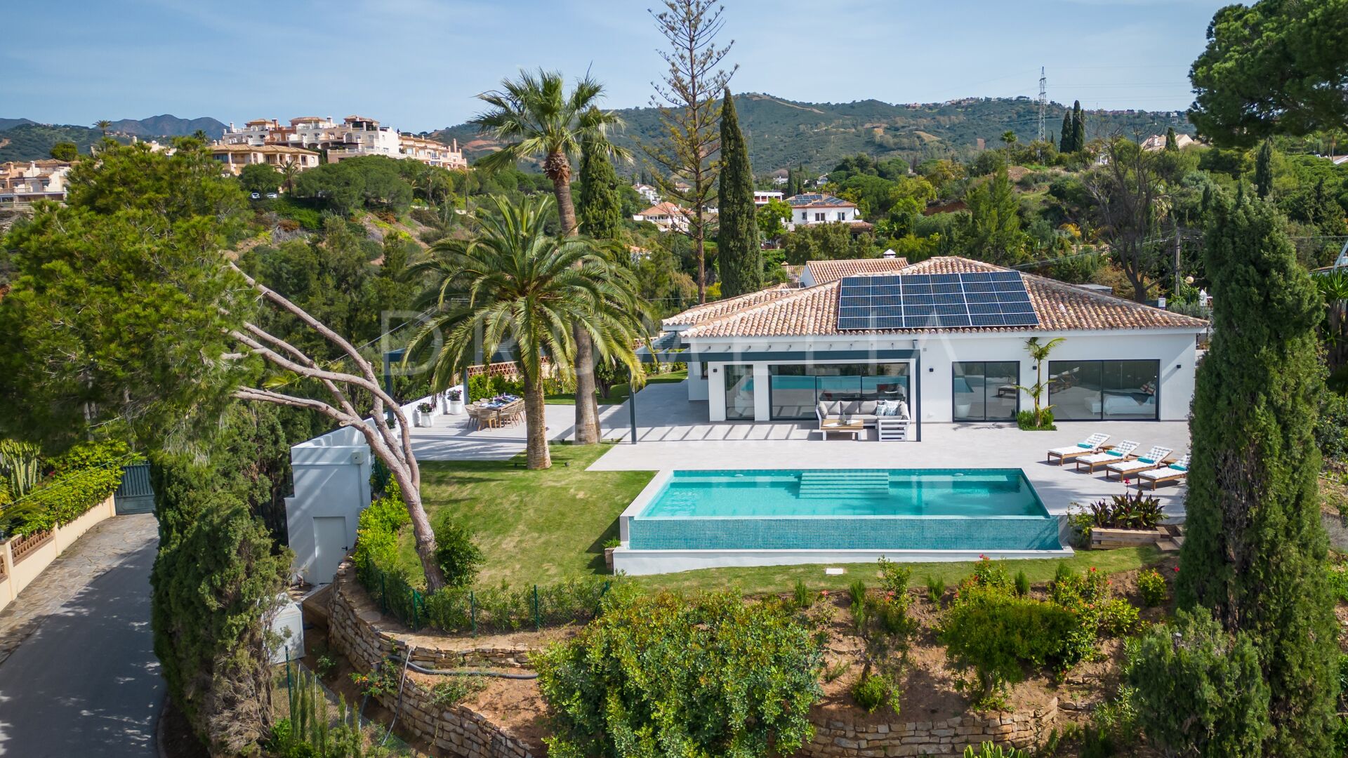 Obszar zewnętrzny jest równie imponujący, z nowo zaprojektowanym, łatwym w utrzymaniu ogrodem i basenem bez krawędzi o wymiarach 10 × 4,7 m. Rozległe tarasy o powierzchni 235 m² zapewniają dużo miejsca na posiłki na świeżym powietrzu, relaks i rozrywkę, a wszystko to w spokojnym otoczeniu, które zapewnia maksymalną prywatność. Pomimo spokojnej okolicy, willa jest dogodnie zlokalizowana w odległości krótkiego spaceru od udogodnień Elvirii i dziewiczych plaż.