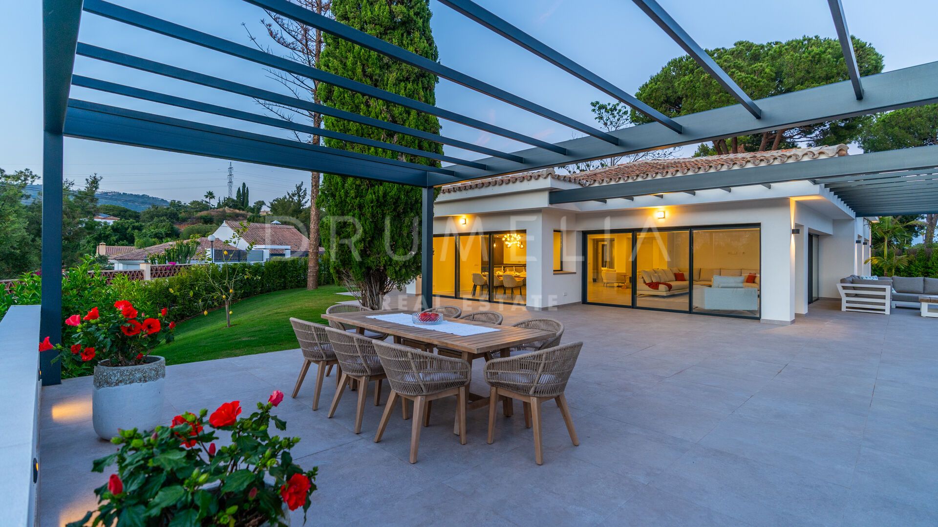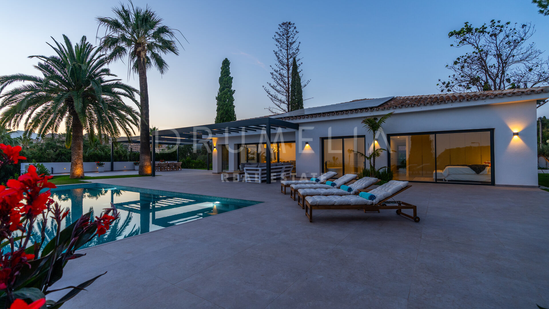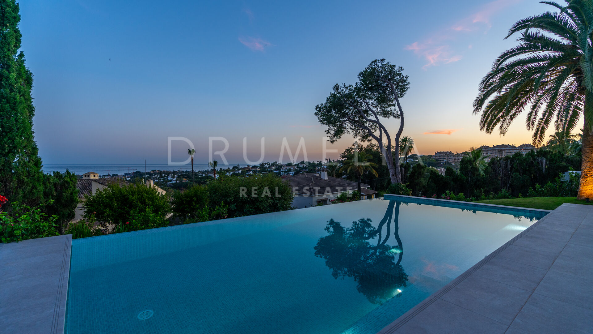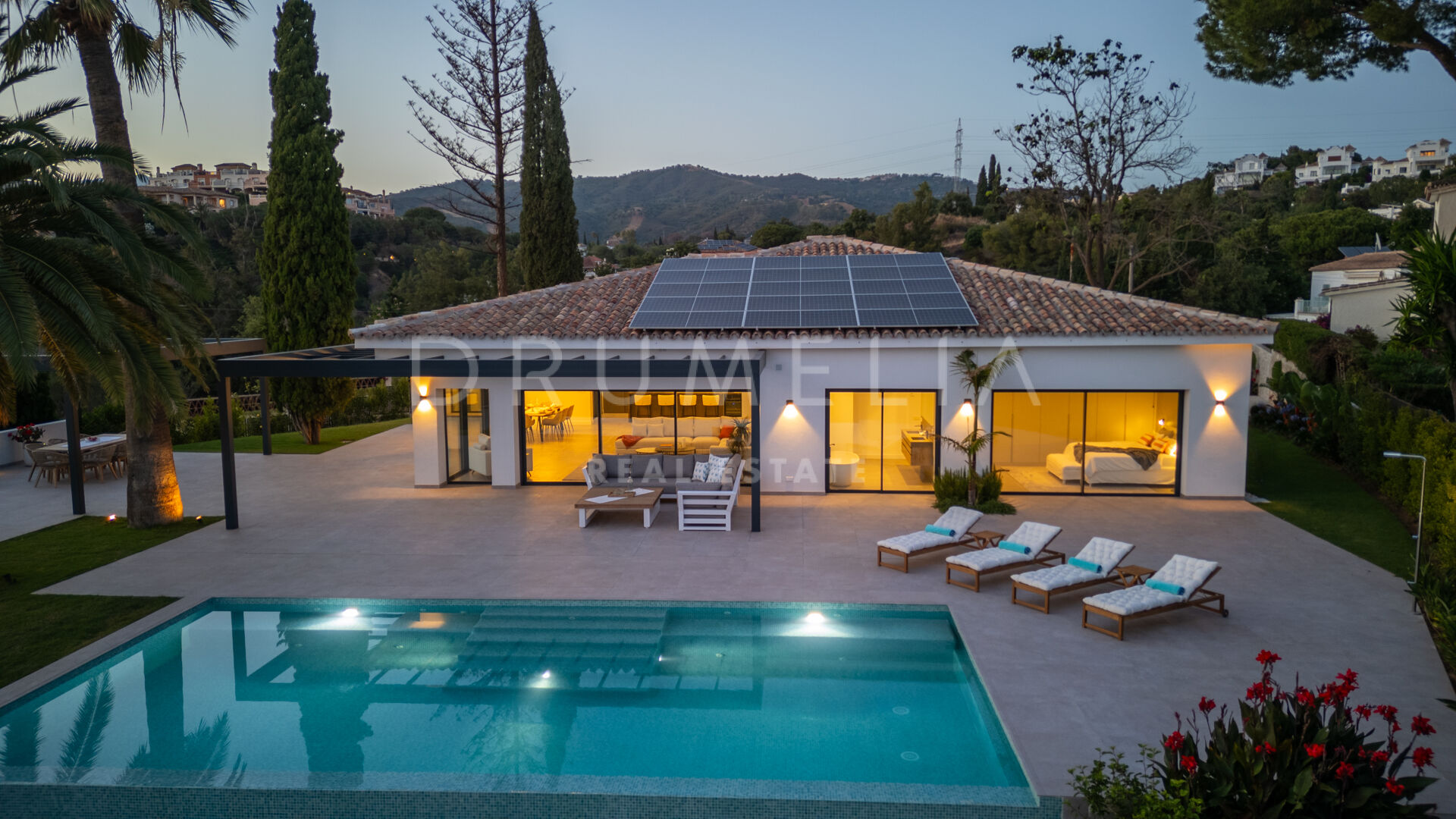 Obszar zewnętrzny jest równie imponujący, z nowo zaprojektowanym, łatwym w utrzymaniu ogrodem i basenem bez krawędzi o wymiarach 10 × 4,7 m. Rozległe tarasy o powierzchni 235 m² zapewniają dużo miejsca na posiłki na świeżym powietrzu, relaks i rozrywkę, a wszystko to w spokojnym otoczeniu, które zapewnia maksymalną prywatność. Pomimo spokojnej okolicy, willa jest dogodnie zlokalizowana w odległości krótkiego spaceru od udogodnień Elvirii i dziewiczych plaż.