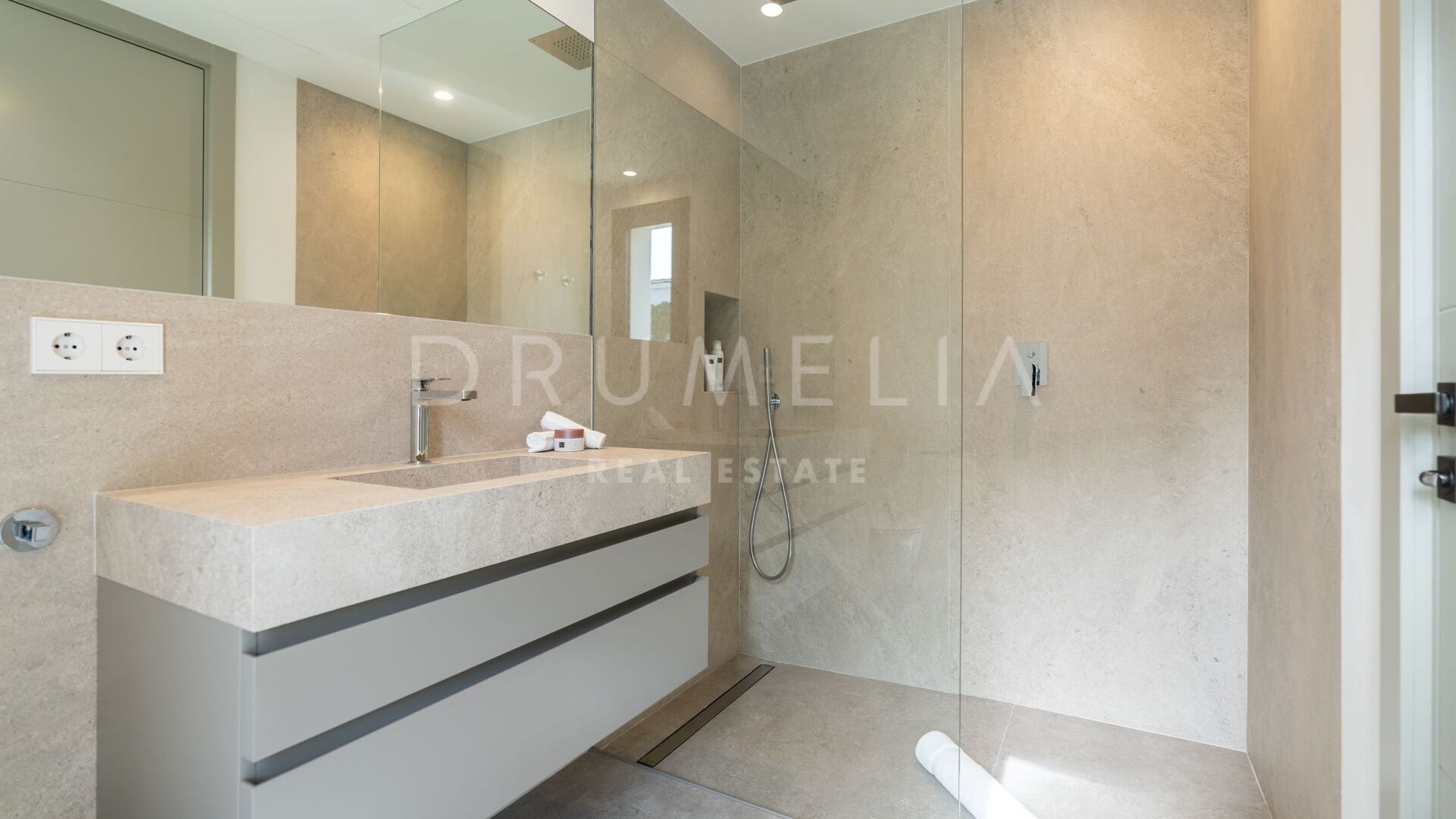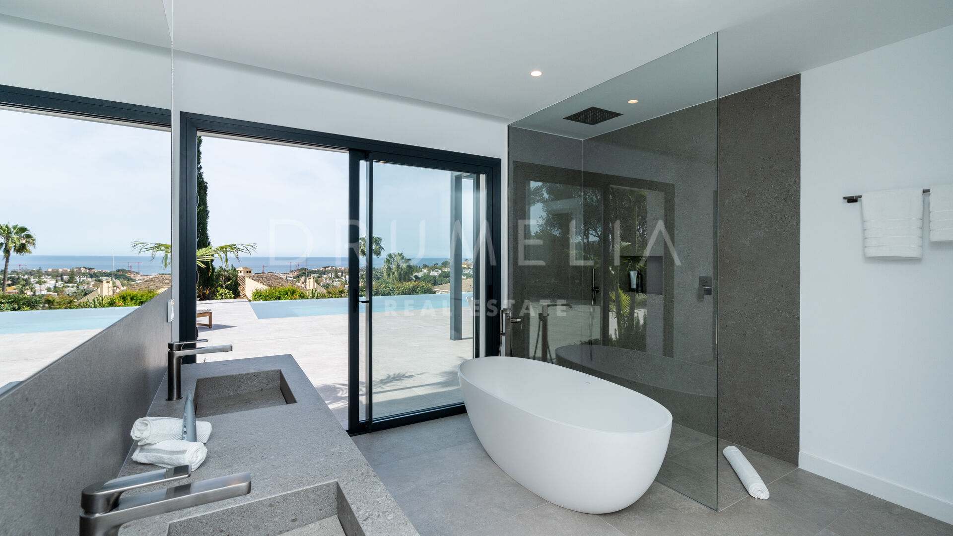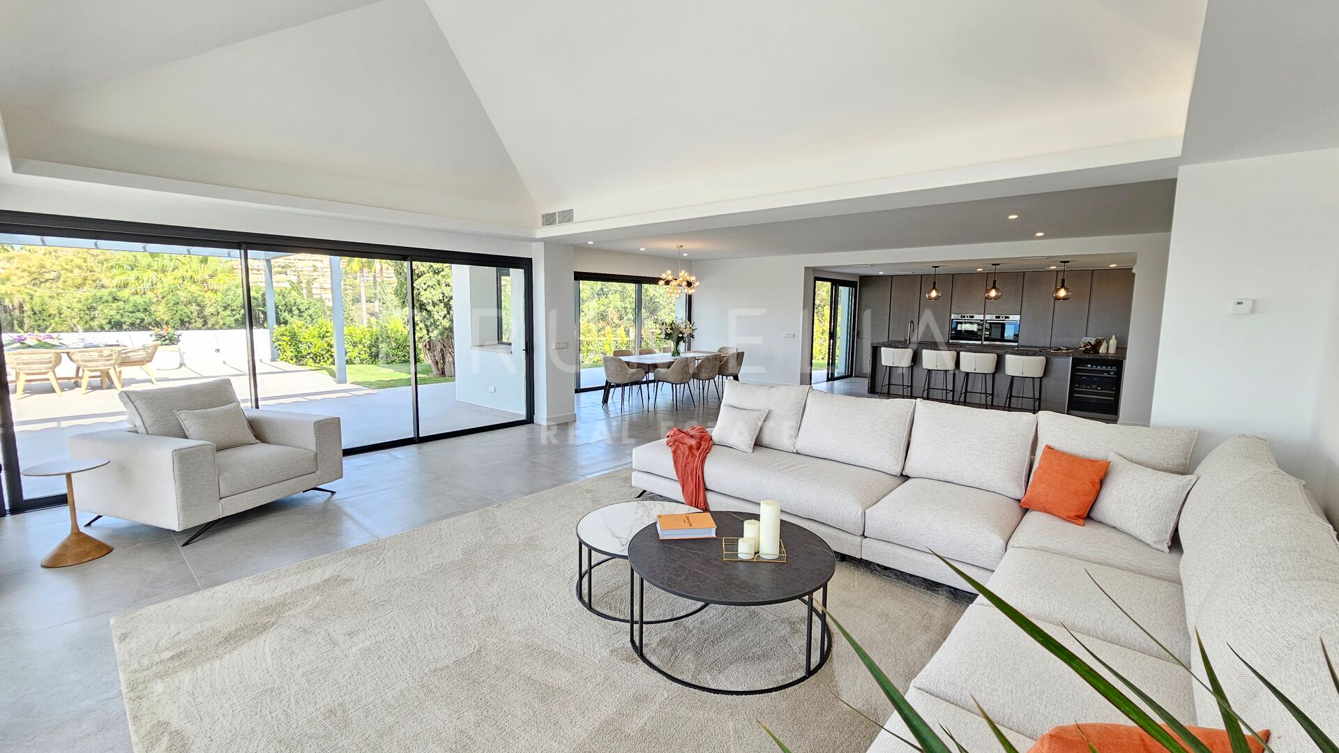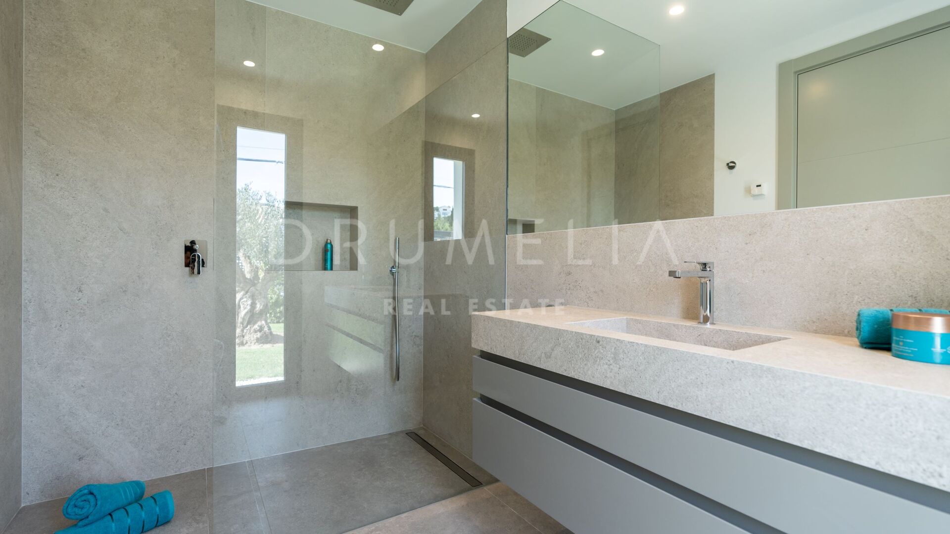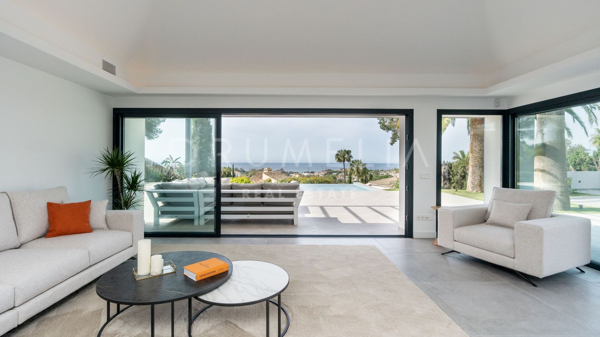 Obszar zewnętrzny jest równie imponujący, z nowo zaprojektowanym, łatwym w utrzymaniu ogrodem i basenem bez krawędzi o wymiarach 10 × 4,7 m. Rozległe tarasy o powierzchni 235 m² zapewniają dużo miejsca na posiłki na świeżym powietrzu, relaks i rozrywkę, a wszystko to w spokojnym otoczeniu, które zapewnia maksymalną prywatność. Pomimo spokojnej okolicy, willa jest dogodnie zlokalizowana w odległości krótkiego spaceru od udogodnień Elvirii i dziewiczych plaż.