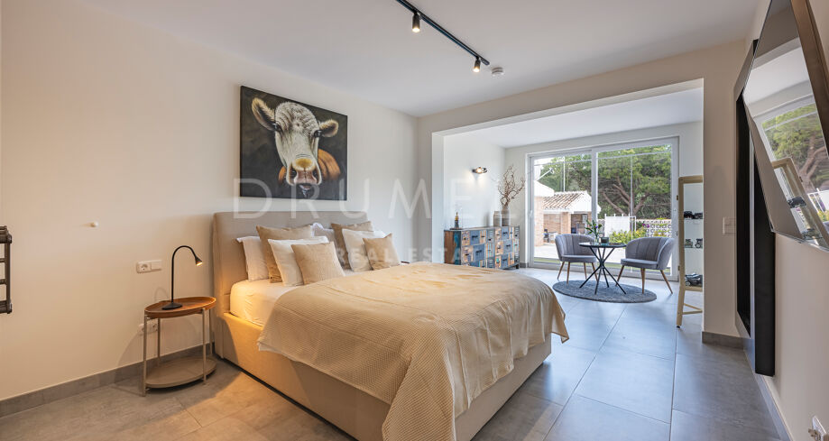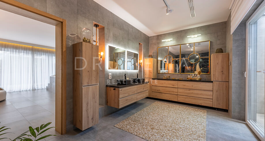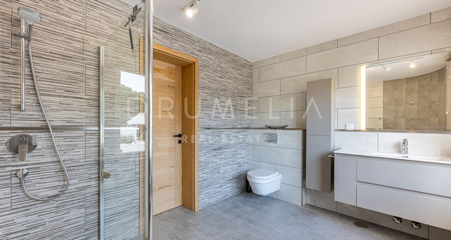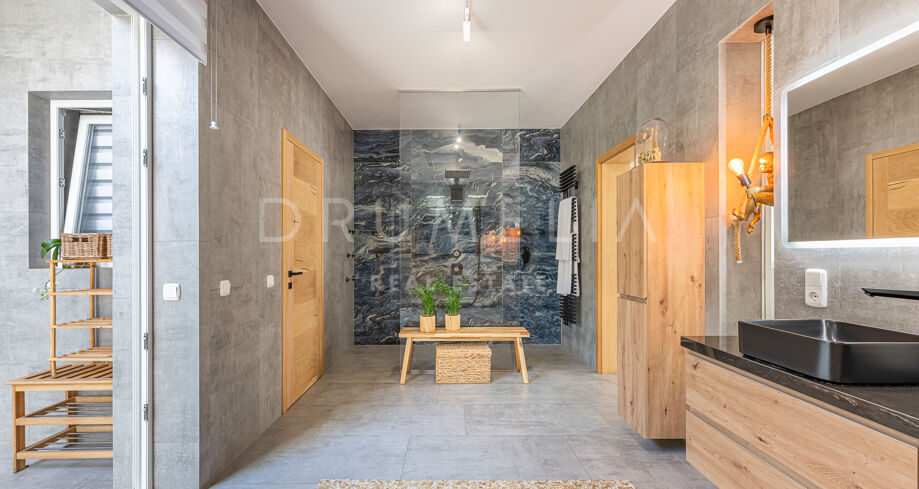 Willa ma cztery sypialnie, w tym główną suite z prysznicem wewnętrznym i zewnętrznym. Na niższym poziomie znajduje się niezależne mieszkanie z osobnym wejściem, trzema sypialniami, dwoma łazienkami i częścią dzienną – idealne dla gości, rodziny lub jako gabinet.