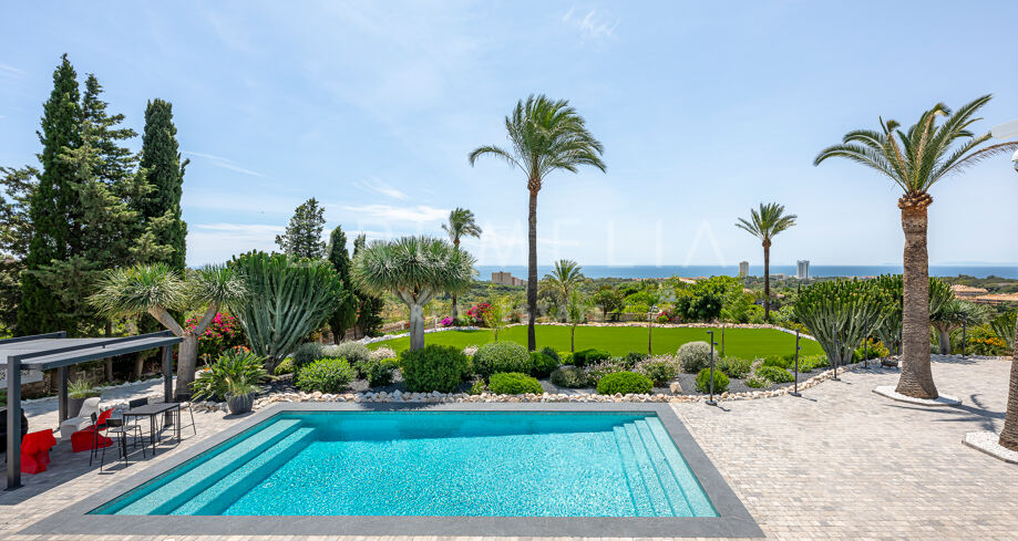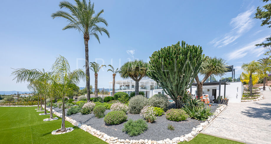 Na zewnątrz: starannie utrzymane ogrody, różne strefy wypoczynkowe na świeżym powietrzu, tarasy zarówno nasłonecznione, jak i zacienione, grill, bar oraz dwa baseny – jeden na wysokości salonu, drugi na niższym tarasie, oferują najlepszy widok na całej posesji.