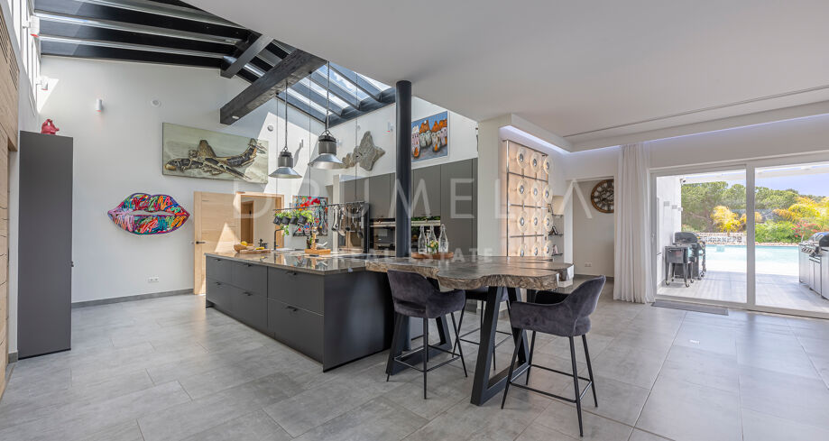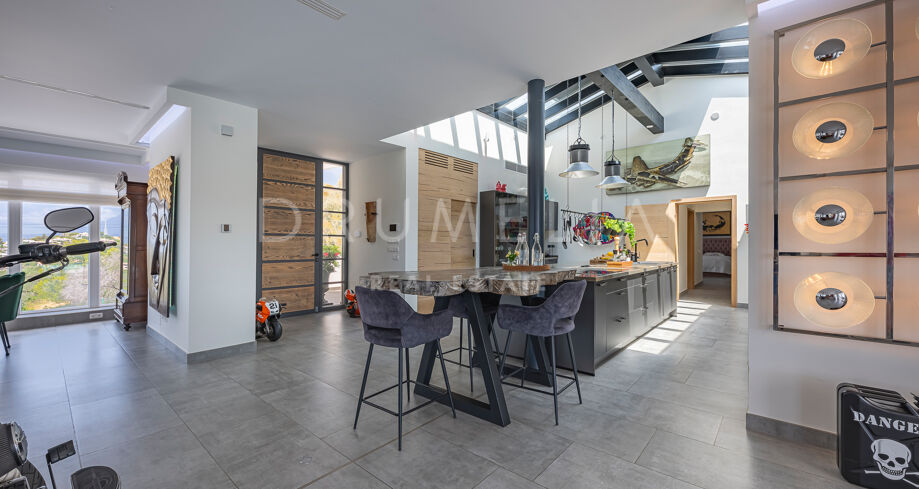 Willa została zaprojektowana na jednym poziomie – co jest rzadkością w tej okolicy – i oferuje wygodny, funkcjonalny styl życia. W głównym budynku znajduje się przestronny, jasny salon z oknami sięgającymi od podłogi do sufitu, które prowadzą bezpośrednio na główny taras. Stąd widok na morze i otoczenie jest po prostu oszałamiający. Nowoczesna kuchnia z częścią śniadaniową harmonijnie łączy się z przestrzenią dzienną – idealne na codzienne życie i do przyjmowania gości.