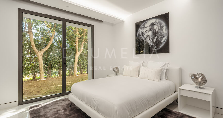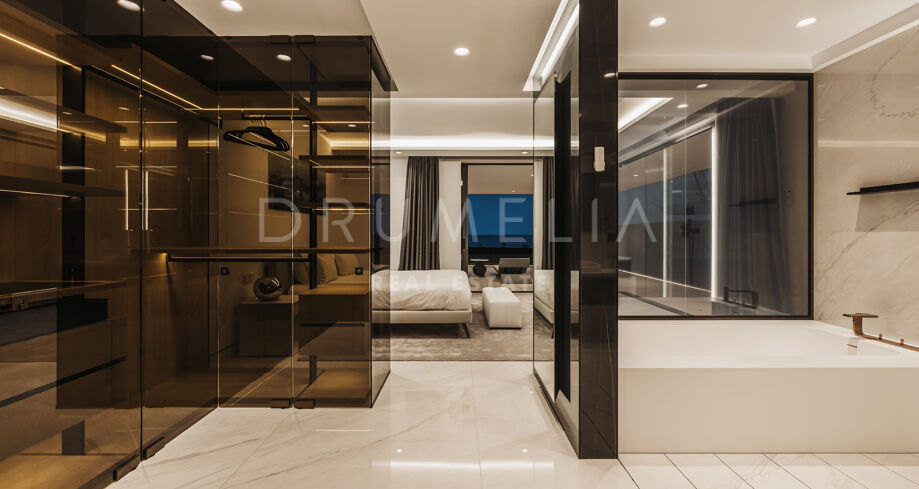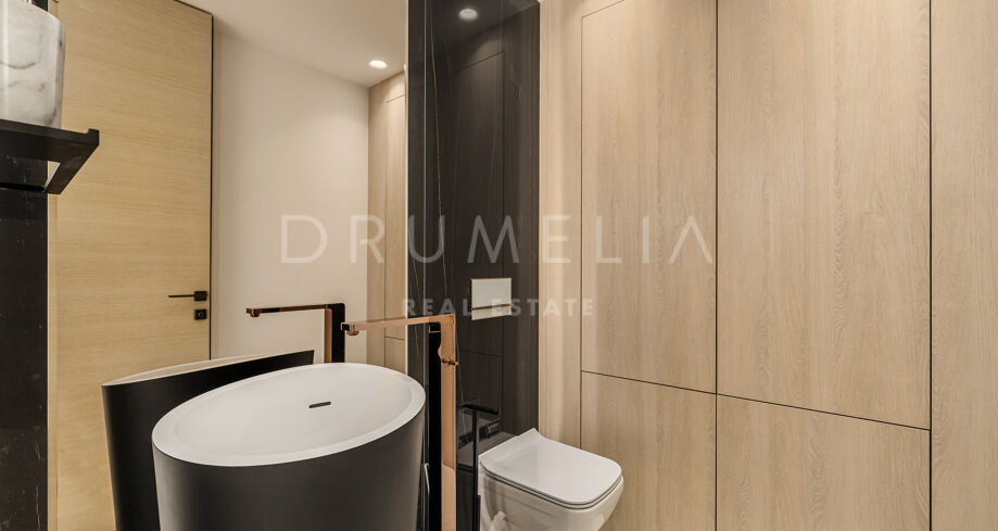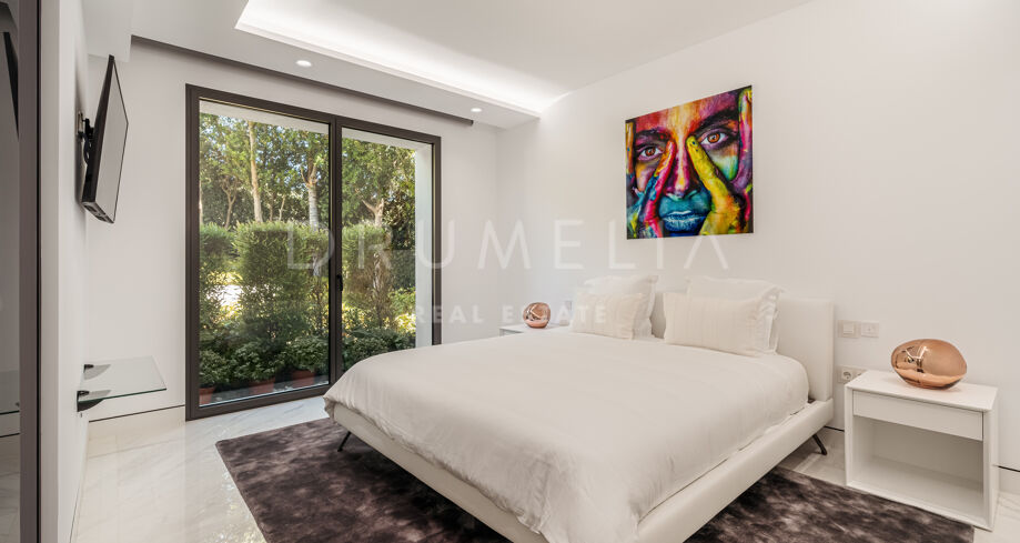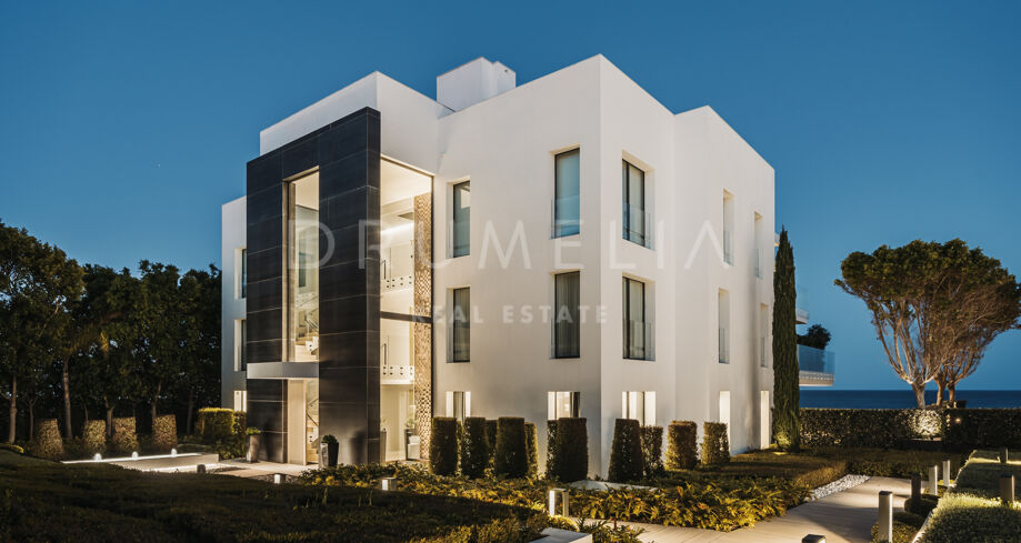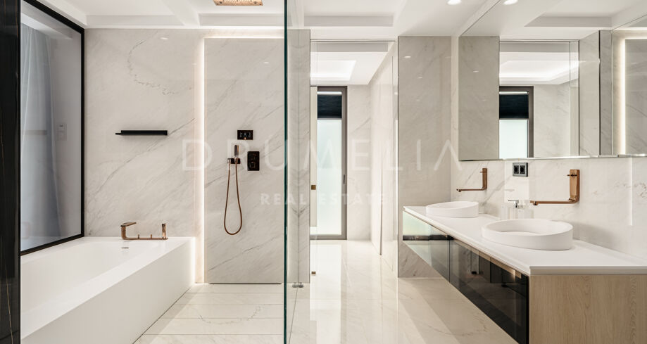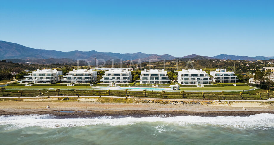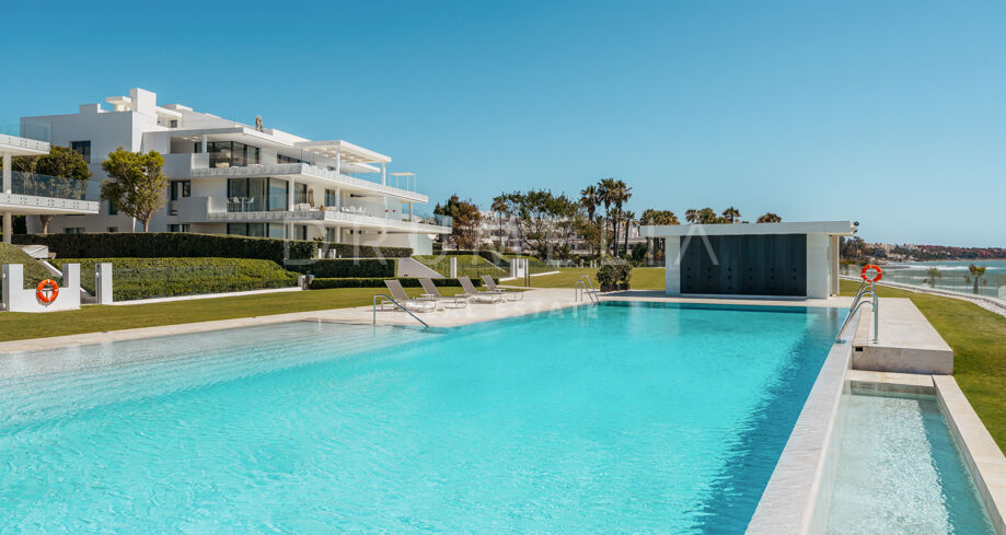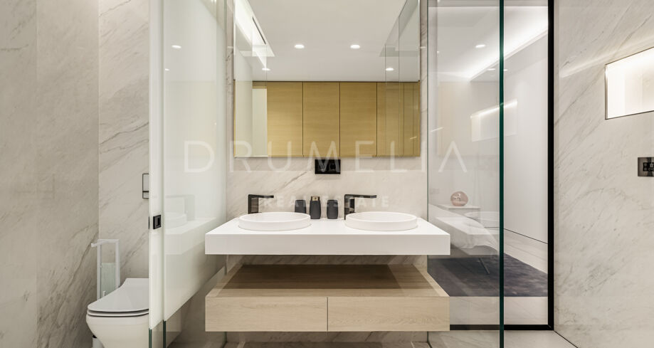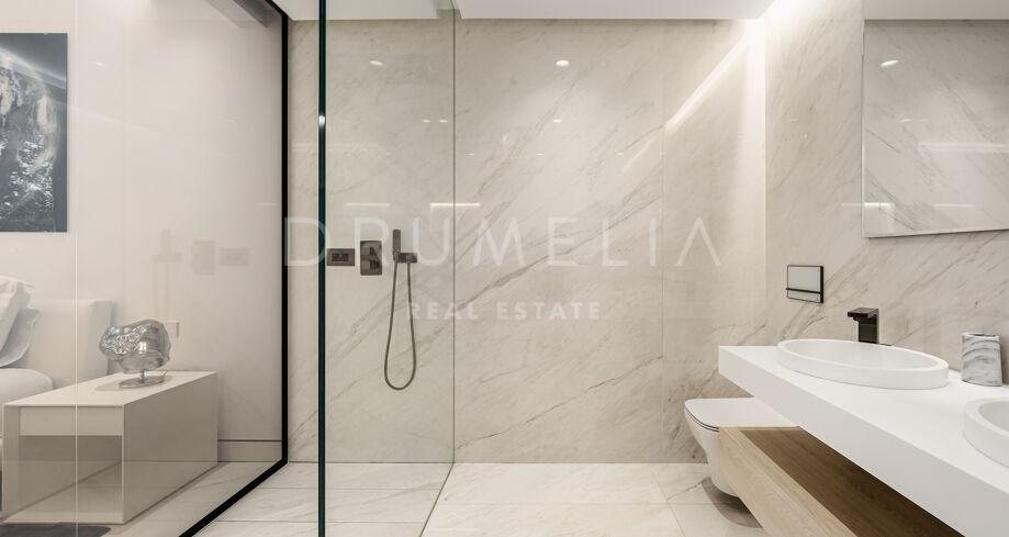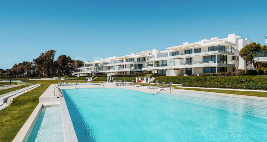 Apartament na parterze na sprzedaż w Emare, Estepona Wschodnia z 4 sypialnie, 4 łazienki, 4 pokoje z łazienką, 1 toaleta, wbudowany 2019 i posiada basen (osiedlowy), garaż (osiedlowy) i ogród (wlasny). Wymiary: 453m² wybudowano, 415m² działka i 146m² taras.