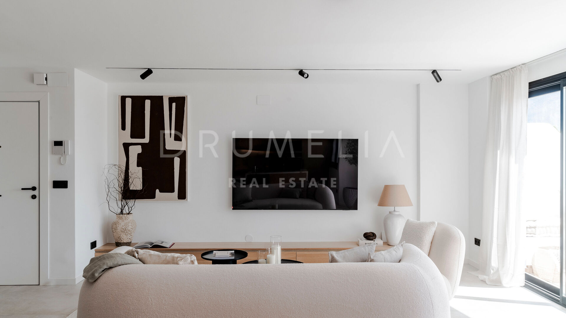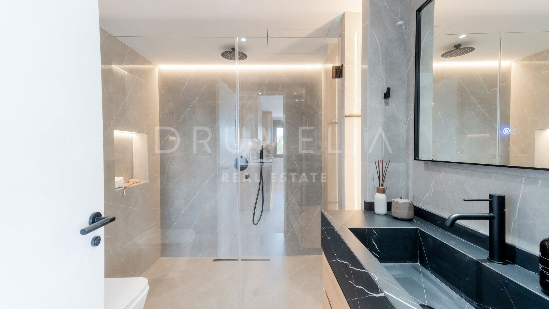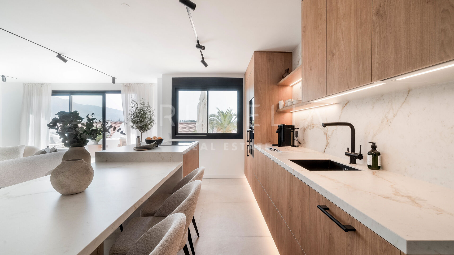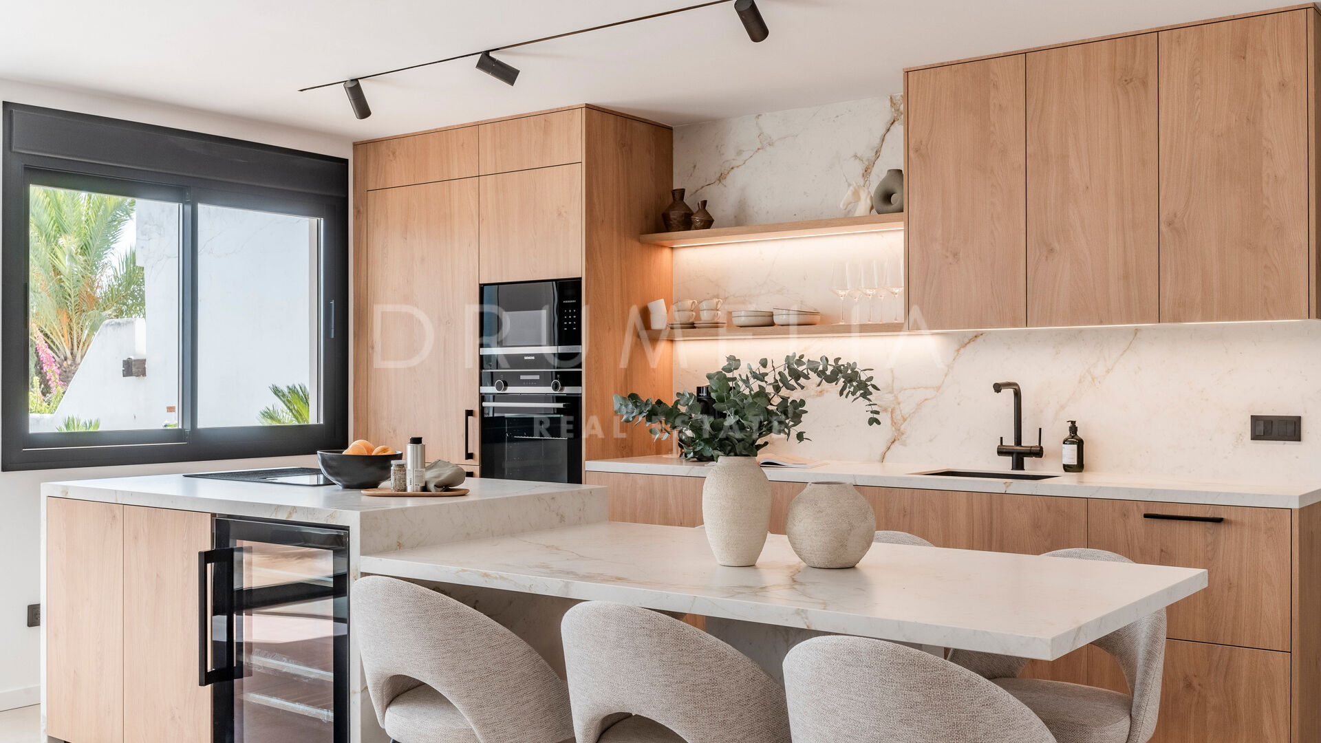 Po wejściu do domu wita nas przestronny salon, który płynnie łączy się z otwartą kuchnią i rozległym tarasem o powierzchni 32 m2, z którego roztacza się wspaniały widok na góry La Concha. Nowoczesna kuchnia jest w pełni wyposażona w wysokiej klasy urządzenia i dużo miejsca do przechowywania, idealne do codziennego życia i przyjmowania gości.