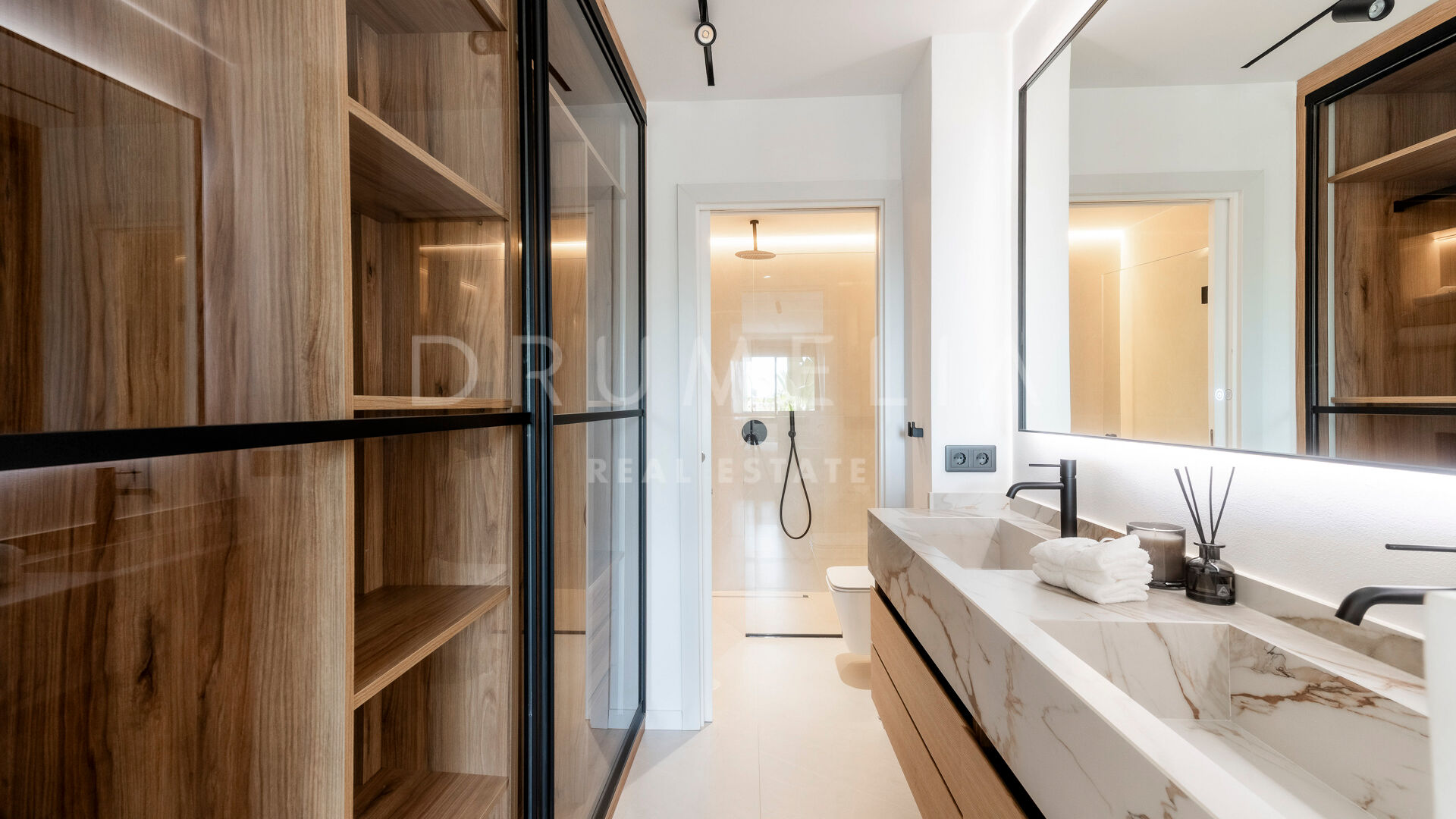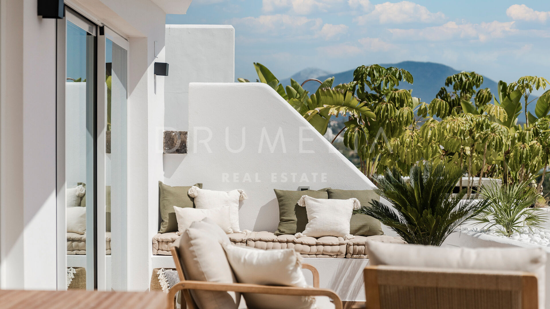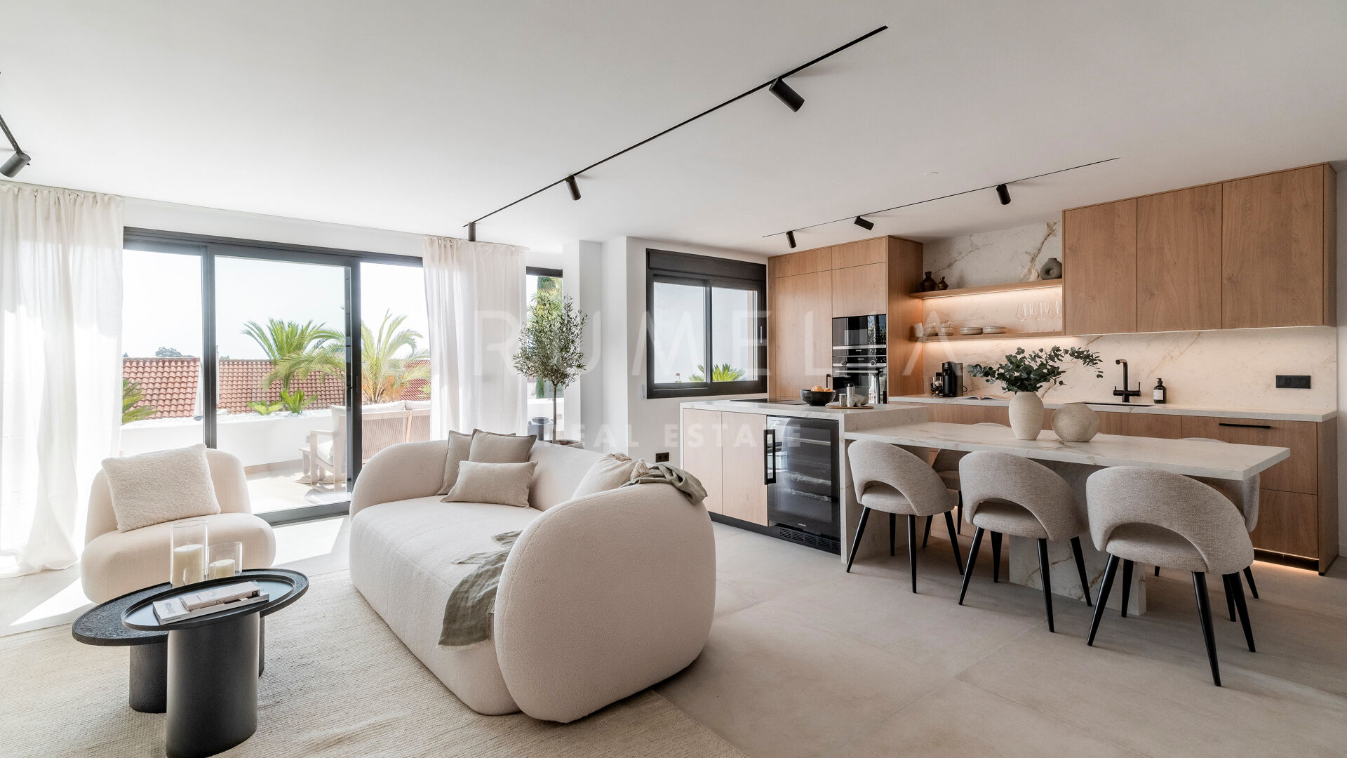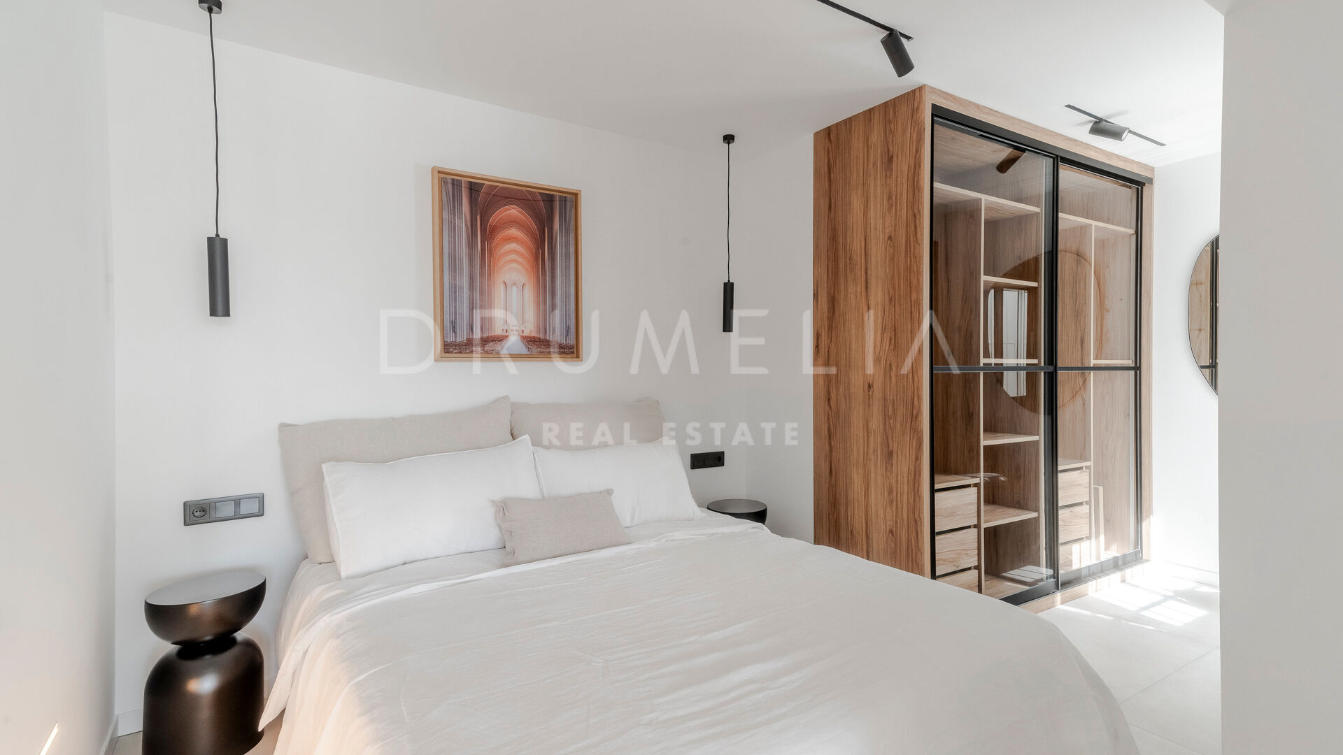 Po wejściu do domu wita nas przestronny salon, który płynnie łączy się z otwartą kuchnią i rozległym tarasem o powierzchni 32 m2, z którego roztacza się wspaniały widok na góry La Concha. Nowoczesna kuchnia jest w pełni wyposażona w wysokiej klasy urządzenia i dużo miejsca do przechowywania, idealne do codziennego życia i przyjmowania gości.