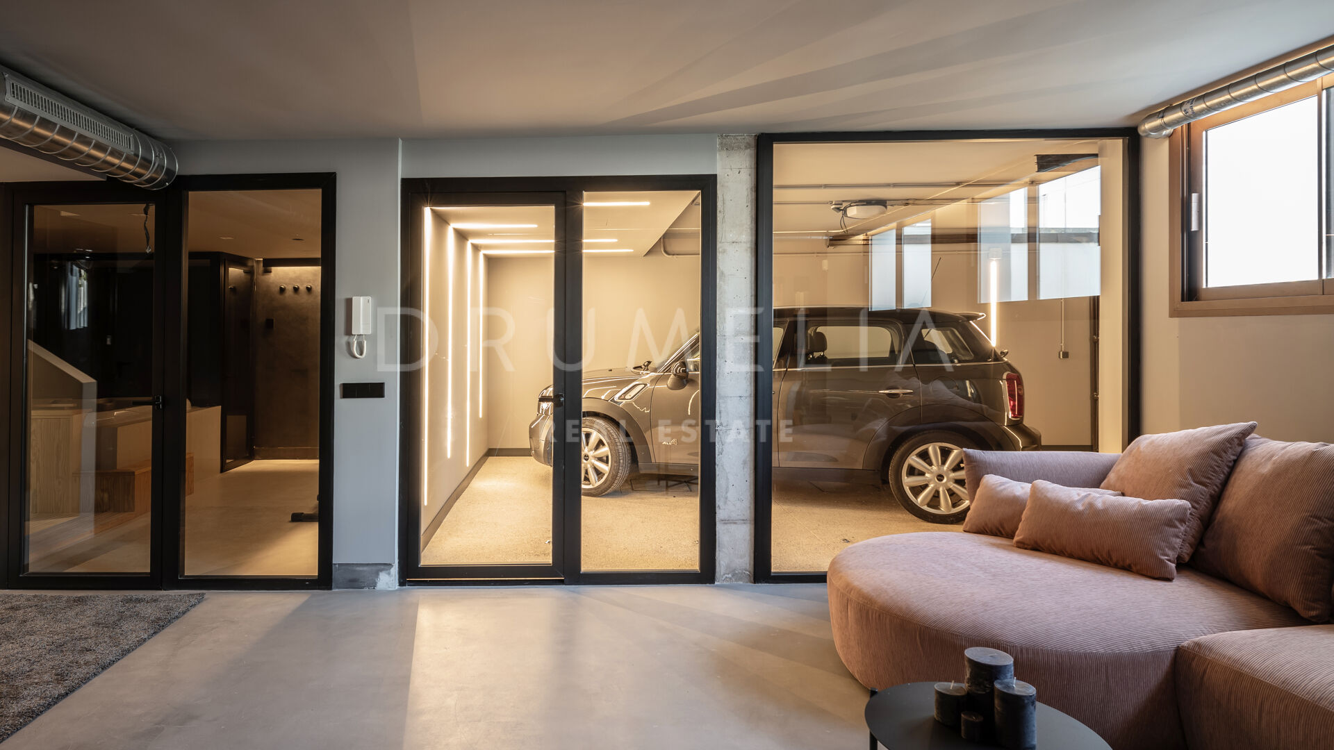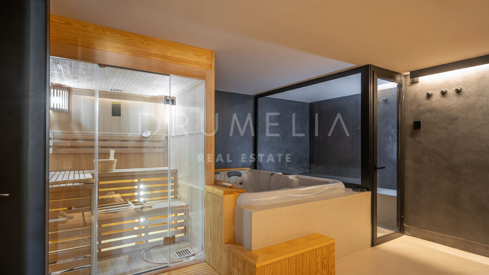 W całej nieruchomości nowoczesny komfort i technologia odgrywają kluczową rolę, oferując takie udogodnienia jak ogrzewanie i chłodzenie podłogowe, system klimatyzacji Airzone, zaawansowaną automatykę domową, ładowarkę do samochodów elektrycznych, automatyczne przeszklenia oraz panoramiczną prywatną windę. Wystrój wnętrz łączy czyste linie architektoniczne z ciepłymi, przytulnymi akcentami, tworząc wyrafinowaną, a zarazem przyjazną atmosferę.