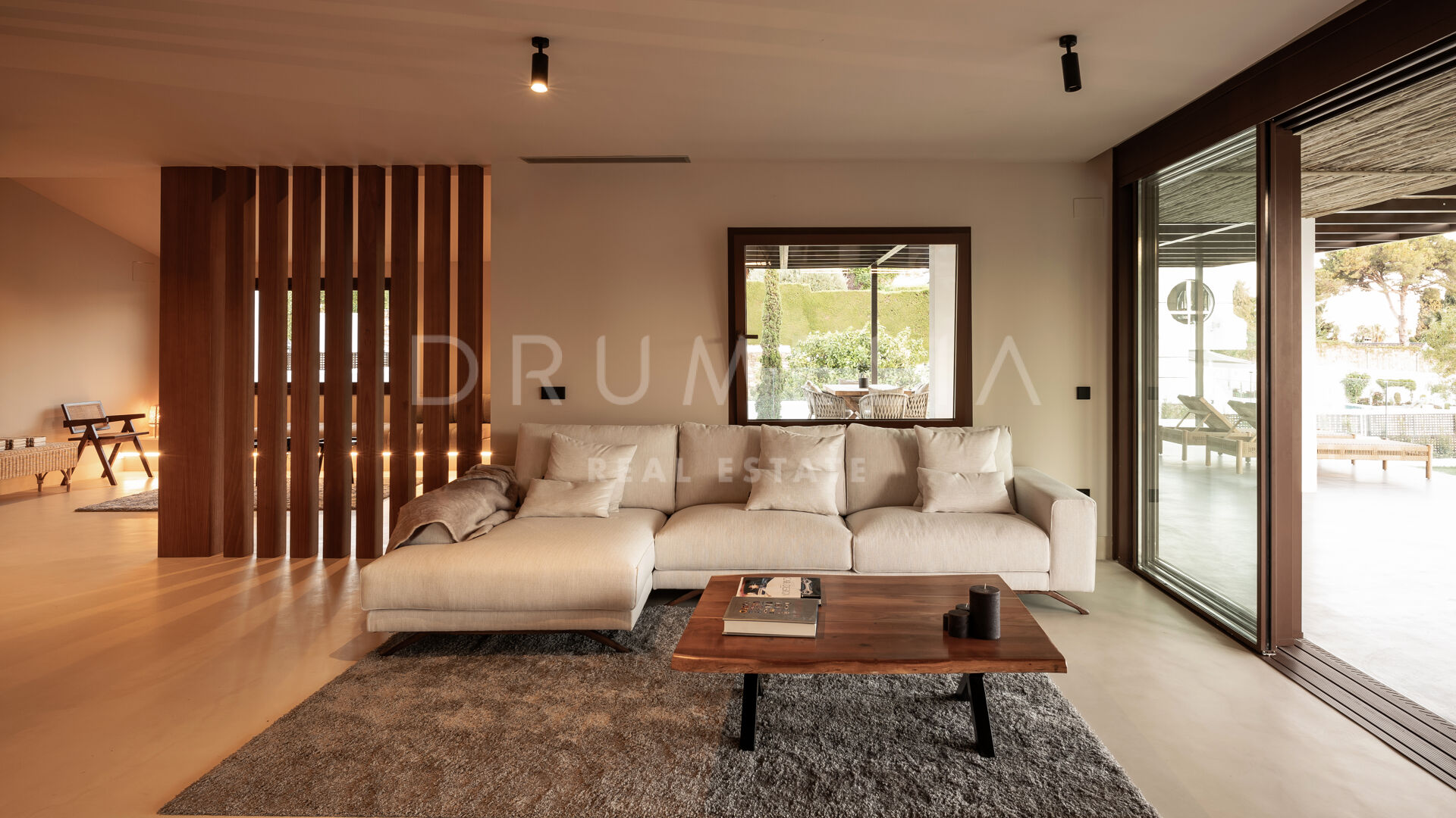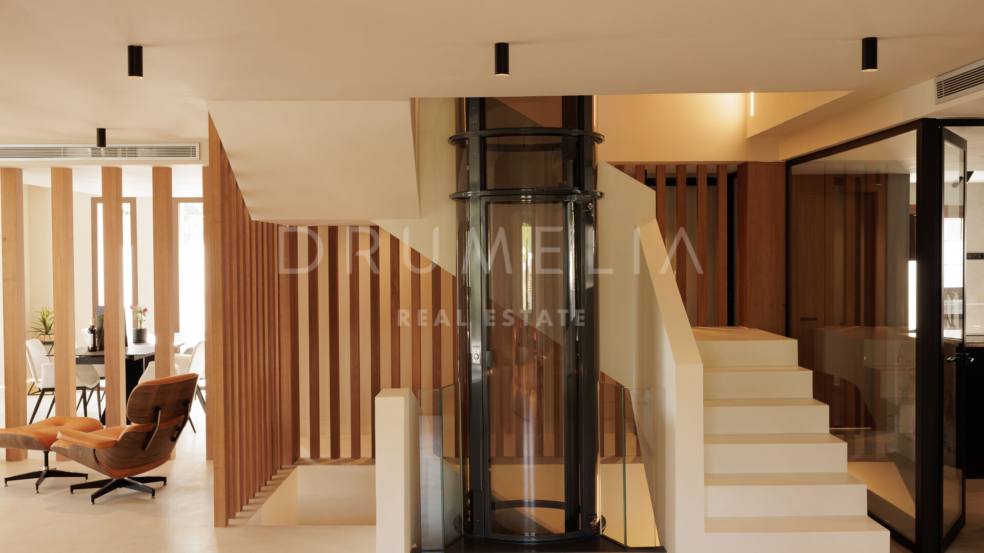 Willa rozplanowana jest na trzech głównych poziomach oraz tarasie na dachu, połączonych elegancką klatką schodową i prywatną windą. Główna kondygnacja mieszkalna została zaprojektowana wokół przestronnych, otwartych stref, subtelnie wydzielonych na relaksujący salon, część wypoczynkową przy kominku oraz jadalnię, która płynnie przechodzi na zewnętrzne tarasy. Duże przesuwne drzwi prowadzą do zagospodarowanych ogrodów na różnych poziomach, z widokiem na przestronny basen ze słoną wodą i możliwością podgrzewania. Na tym piętrze znajduje się również nowoczesna kuchnia wyposażona w najwyższej klasy sprzęt AGD oraz dwie sypialnie gościnne, każda z własną łazienką. Oddzielna pralnia zewnętrzna z toaletą dla gości zapewnia dodatkową funkcjonalność.