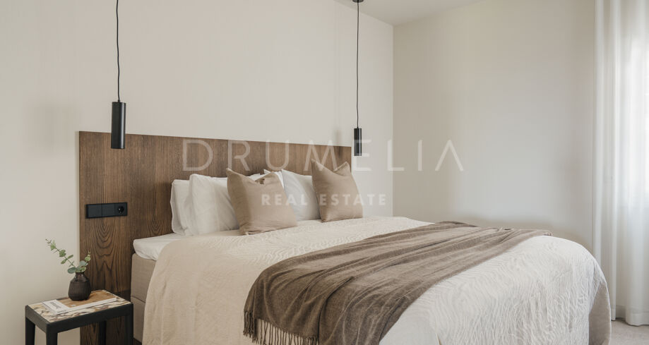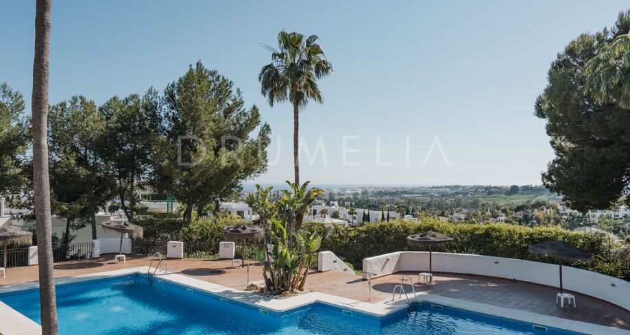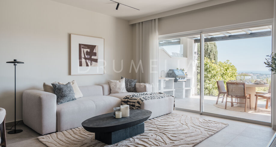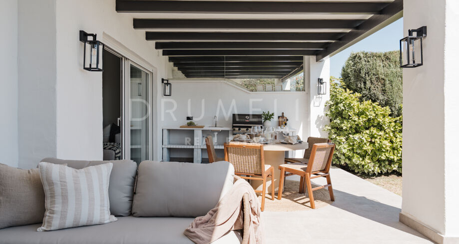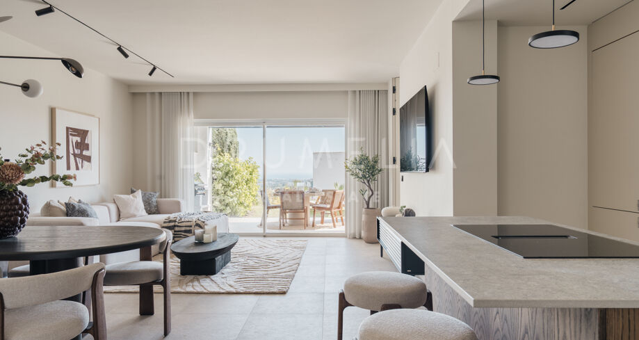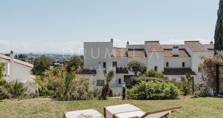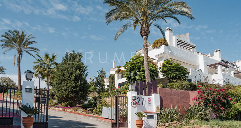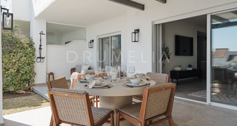 Odnowiony 3-pokojowe mieszkanie na parterze z prywatnym ogrodem, widokiem na morze i tarasem w strzeżonej społeczności w miejscowości La Quinta, Nueva Andalucía