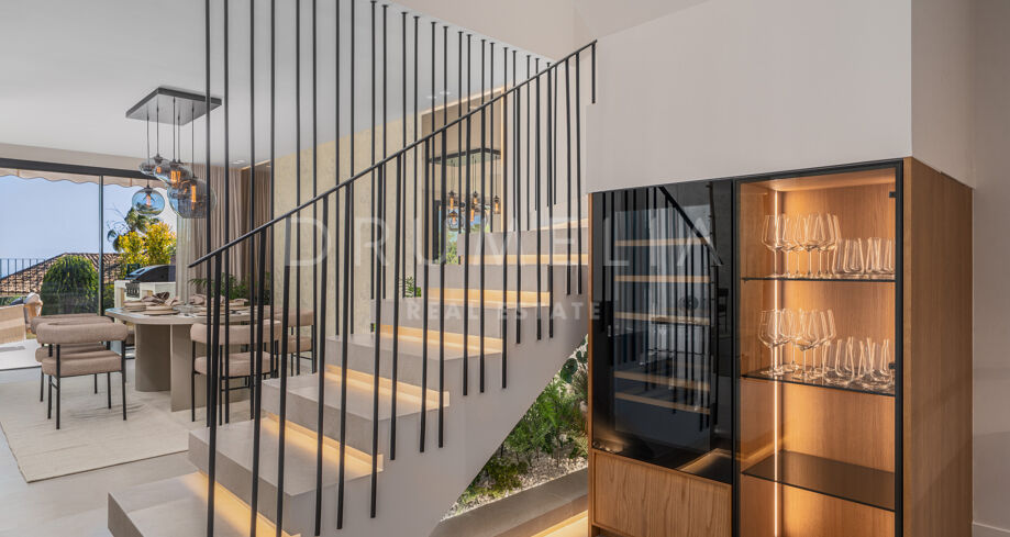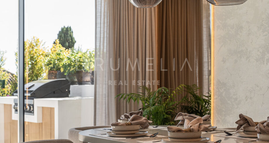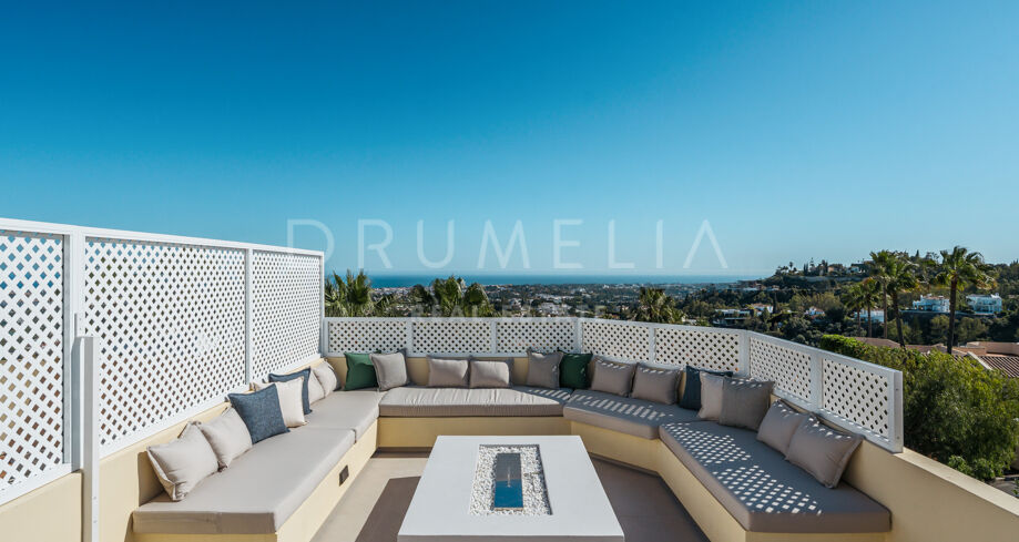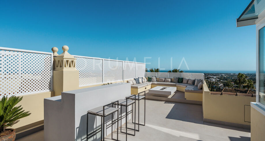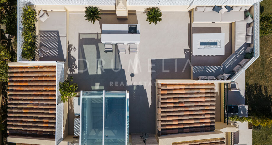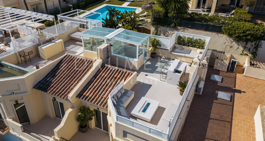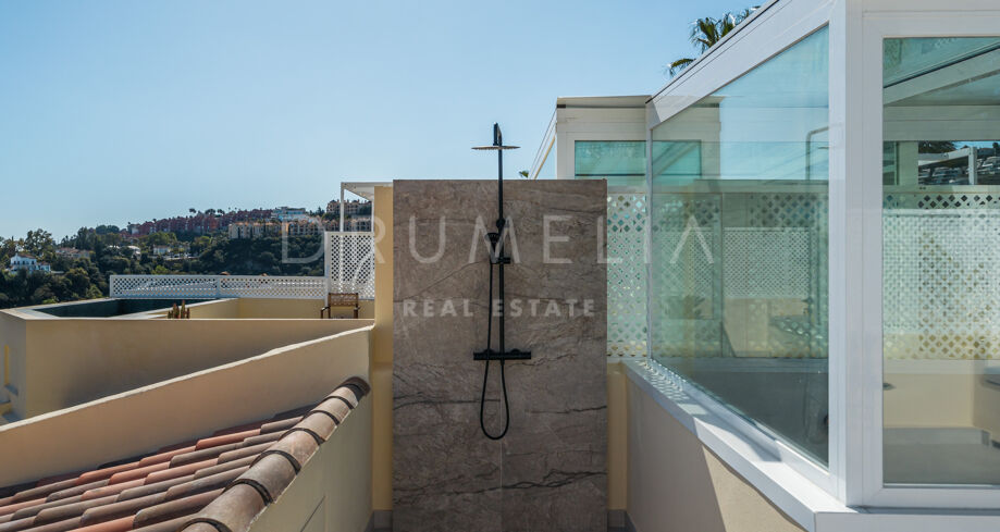 Taras na dachu to prawdziwa perełka — strefa relaksu z barem, kominkiem, leżakami i prysznicem na świeżym powietrzu, idealna do użytku przez cały rok. W pobliżu znajduje się klub golfowy La Quinta, plaże Puerto Banús, szkoły międzynarodowe oraz liczne sklepy i restauracje. Doskonałe miejsce na rezydencję całoroczną lub wakacyjny azyl na Costa del Sol.