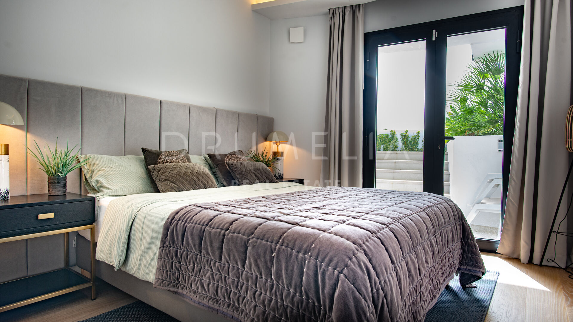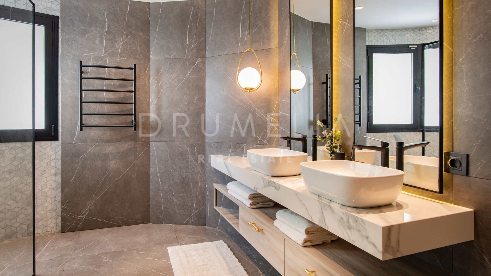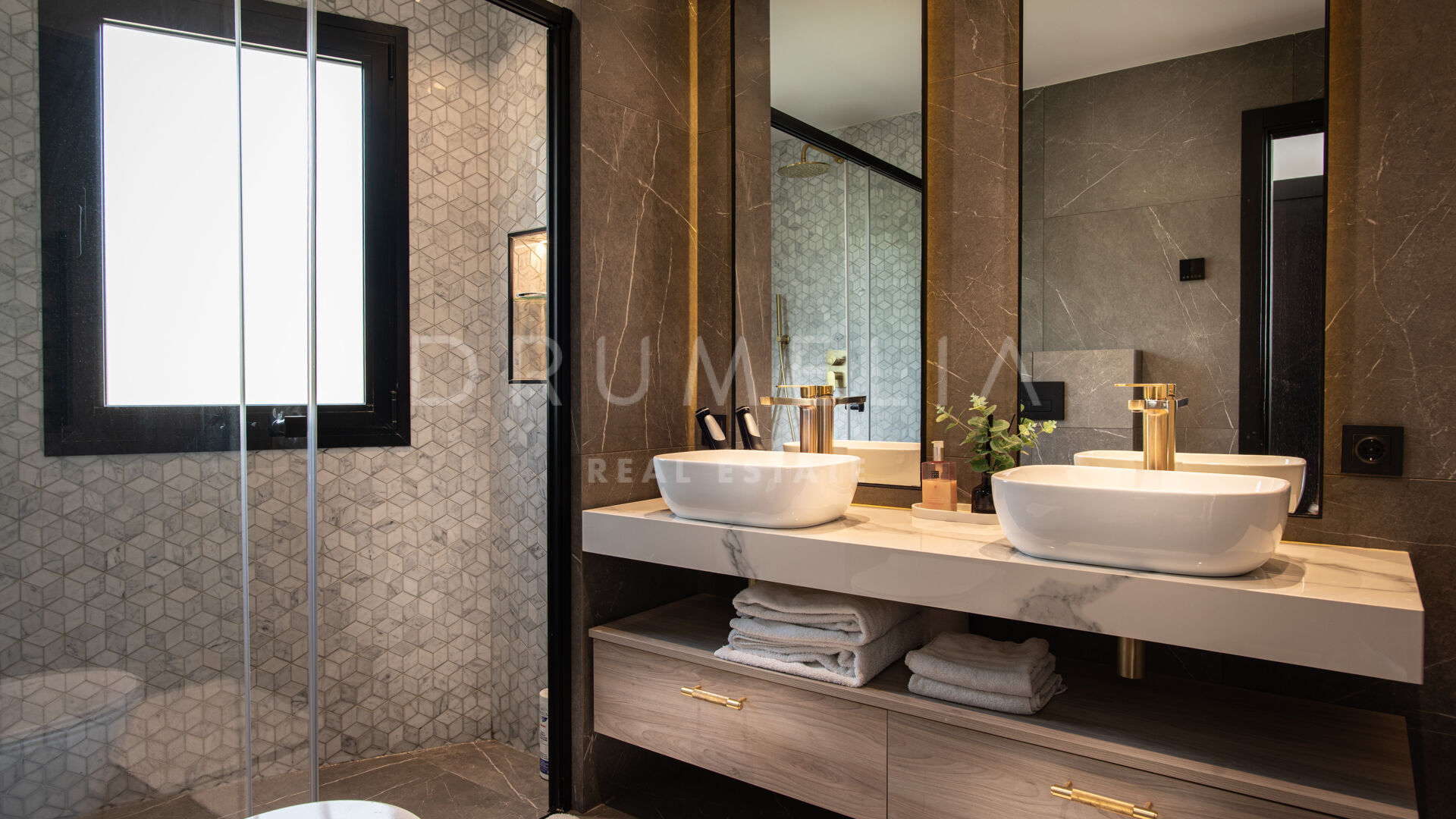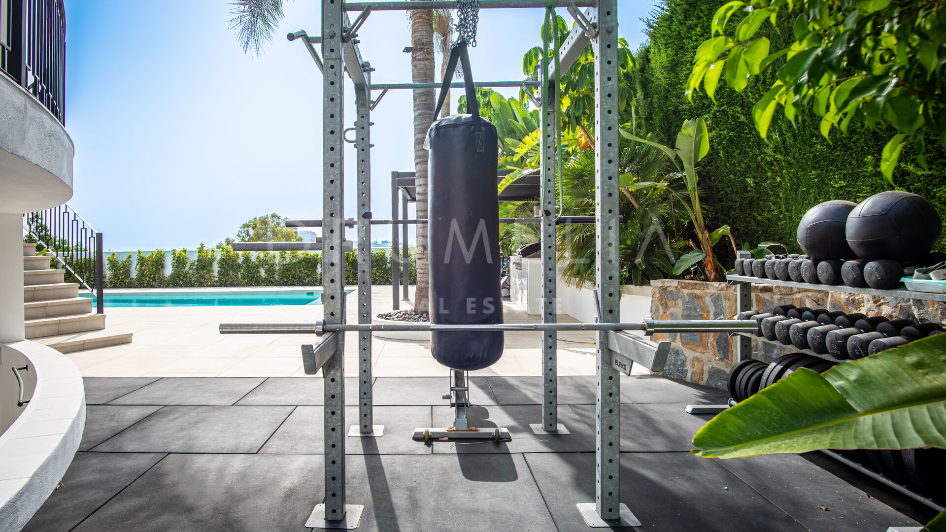 Willa obejmuje pięć sypialni i pięć łazienek, zaprojektowanych z myślą o przestrzeni i prywatności. Przestrzenie mieszkalne prowadzą do ogrodu z prywatnym basenem, kuchnią na świeżym powietrzu i strefą fitness — idealną do aktywnego stylu życia śródziemnomorskiego. Garaż na dwa samochody zapewnia bezpieczne parkowanie i dodatkowe miejsce na przechowywanie.