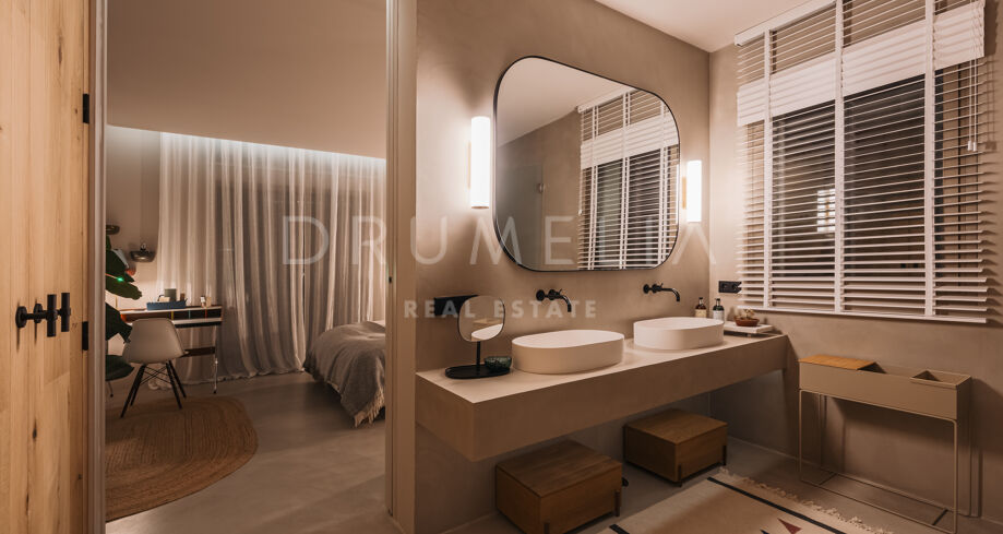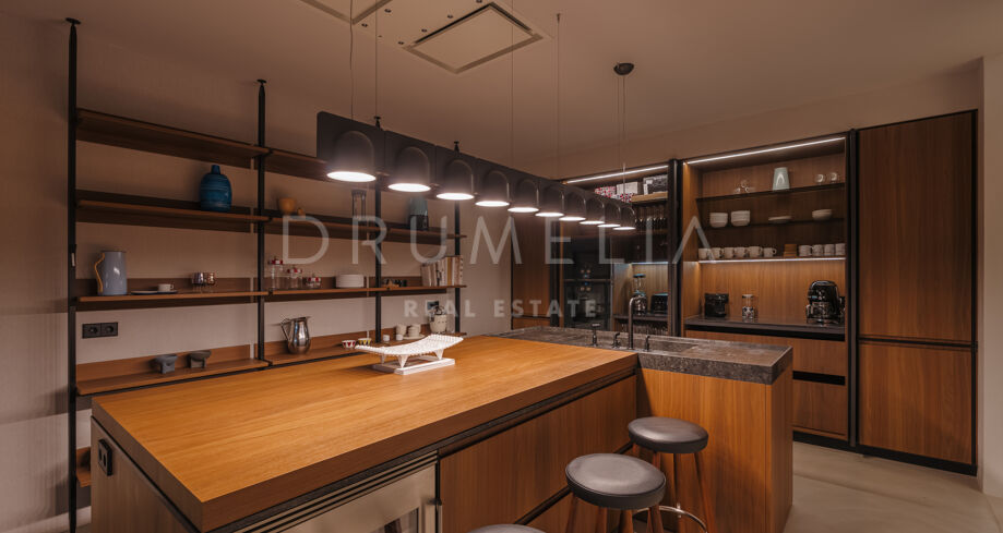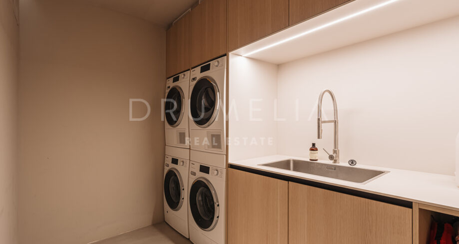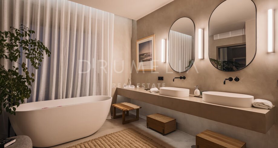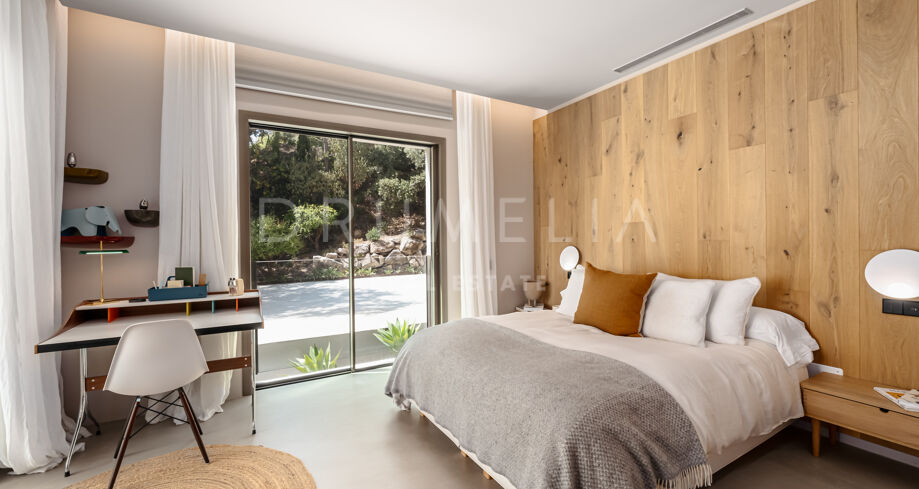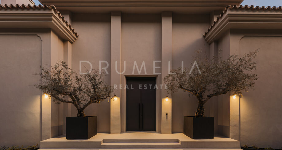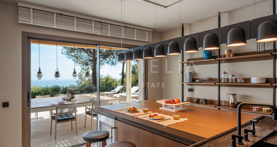 Wolnostojąca rezydencja o powierzchni 862 m², rozłożona na 3 poziomach, oferuje prestiżowe, zaprojektowane na zamówienie meble. Skierowana na południe, położona jest na dużej działce o powierzchni 4.017 m² ze wspaniałymi ogrodami krajobrazowymi i tarasami o powierzchni 120 m² z imponującymi widokami na wybrzeże i góry. Została zaprojektowana przy użyciu innowacyjnych metod, tradycyjnych i nowoczesnych materiałów wysokiej jakości, oferując inteligentny projekt zapewniający bardzo wygodne przestrzenie mieszkalne i prawdziwie wykwintny styl życia, łączący śródziemnomorskie uczucia ze skandynawskim akcentem. Do tej wspaniałej willi wchodzi się przez długi podjazd prowadzący do głównych drzwi otoczonych drzewami oliwnymi. Na parterze znajduje się wspaniały hol wejściowy, który prowadzi do eleganckiej części dziennej z jadalnią i wspaniałym salonem ze sklepionymi sufitami o podwójnej wysokości. W pełni wyposażona kuchnia Arrital z urządzeniami Gaggenau oraz jadalnią wewnątrz i na zewnątrz. Na zachodnim i wschodnim skrzydle znajdują się dwie sypialnie z łazienkami, obie z tarasami i widokiem na morze, a także toaleta dla gości. Duże zadaszone i odkryte tarasy prowadzą do basenu bez krawędzi (o długości ponad 13 m), z którego roztacza się widok na morze. Płaski subtropikalny ogród znajduje się tuż przed i wokół nieruchomości, z automatycznym systemem nawadniania i wspaniałymi widokami na wybrzeże i idylliczną okolicę.