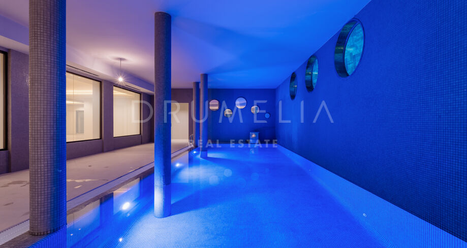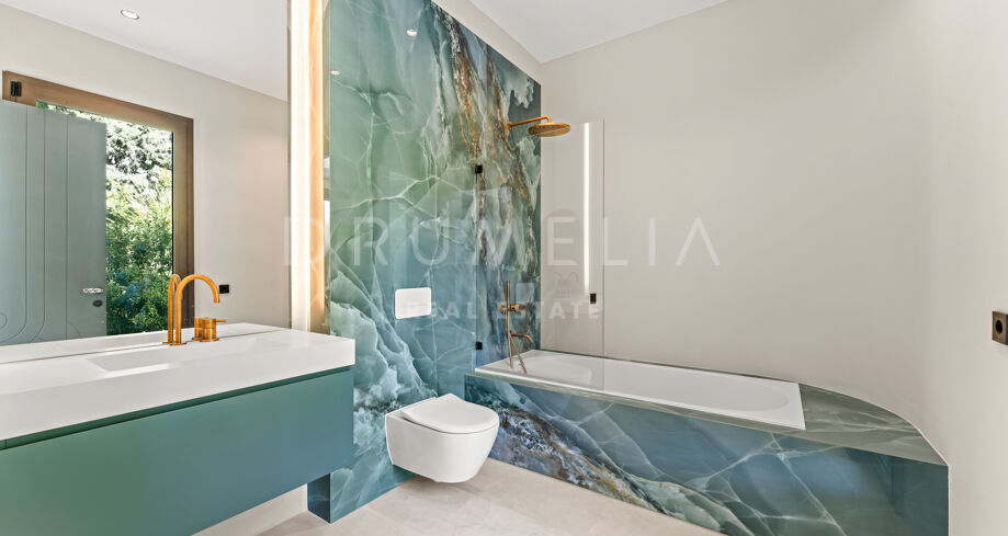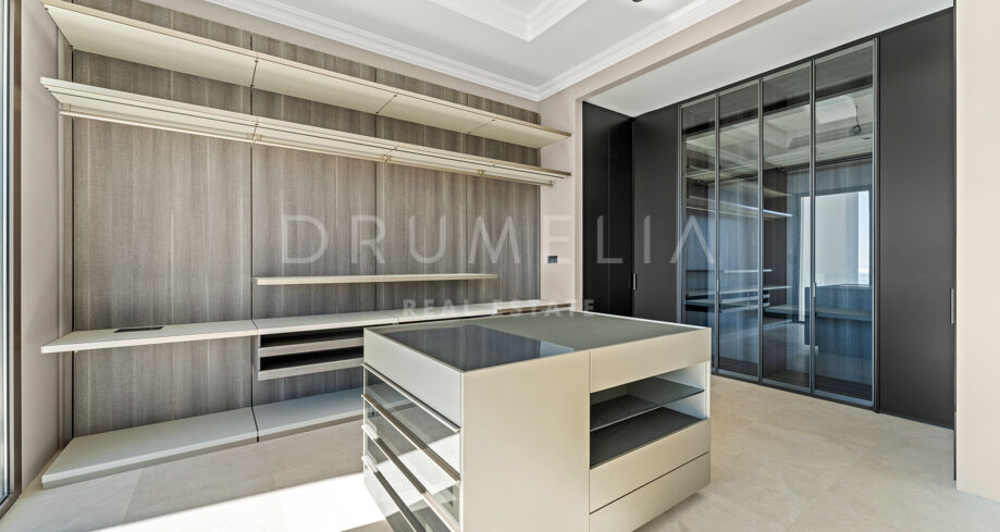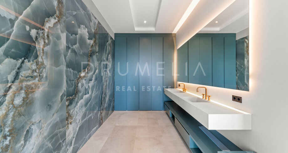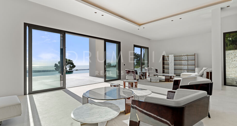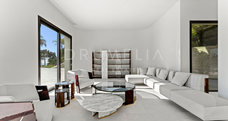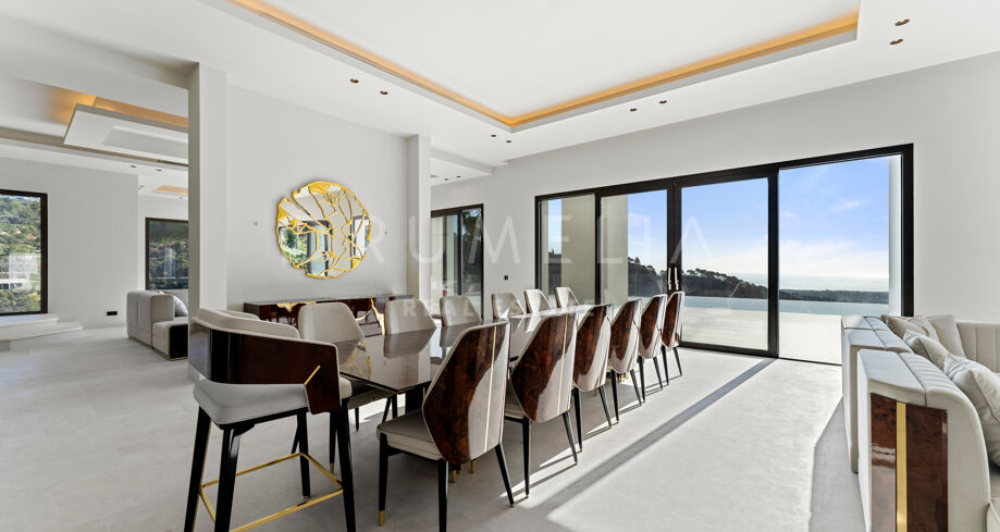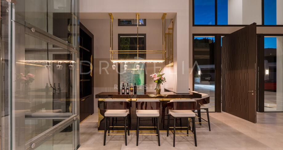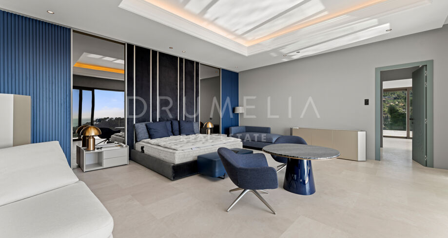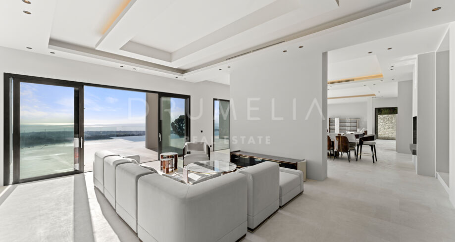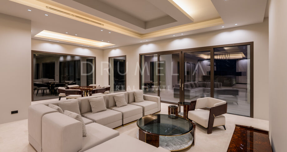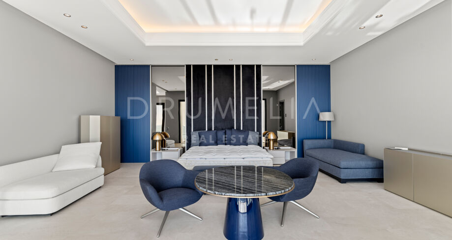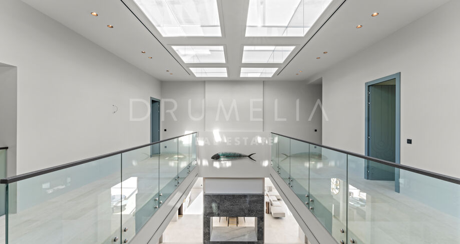 Zaprojektowana z myślą o najwyższym komforcie i wspaniałości, ta jedyna w swoim rodzaju rezydencja oferuje układ na otwartym planie, strzeliste sufity i mnóstwo naturalnego światła. Rozległe okna sięgające od podłogi do sufitu i szklane drzwi płynnie łączą wnętrze z oszałamiającym otoczeniem zewnętrznym, obejmując śródziemnomorski styl życia. Czyste linie, eleganckie geometryczne formy i neutralna paleta tworzą bez wysiłku nowoczesną estetykę, wzmocnioną wyrafinowanym oświetleniem, efektownymi ścianami i designerskimi meblami.