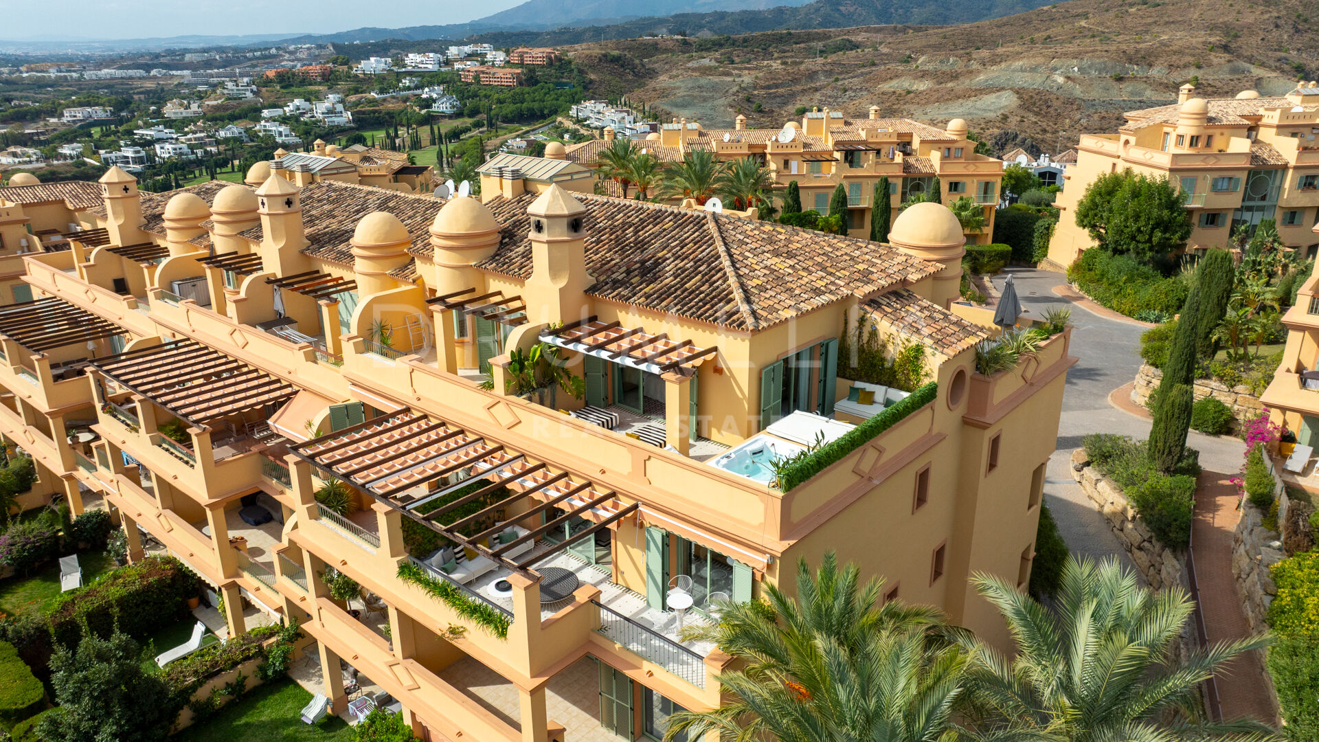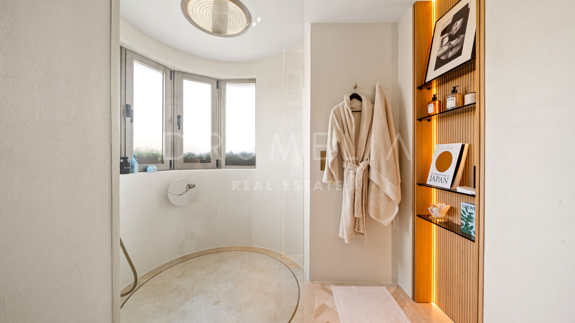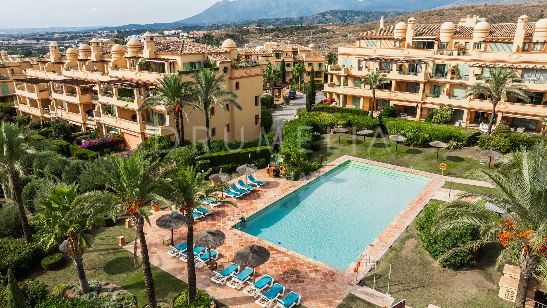 Ten odnowiony dwupoziomowy penthouse znajduje się w Four Seasons, Los Flamingos — prywatnym i bezpiecznym osiedlu znanym z zadbanych ogrodów i bliskości Villa Padierna Golf & Hotel Resort. Lokalizacja łączy spokój i wygodę, a do Puerto Banús i Estepony można dojechać w około 15 minut.