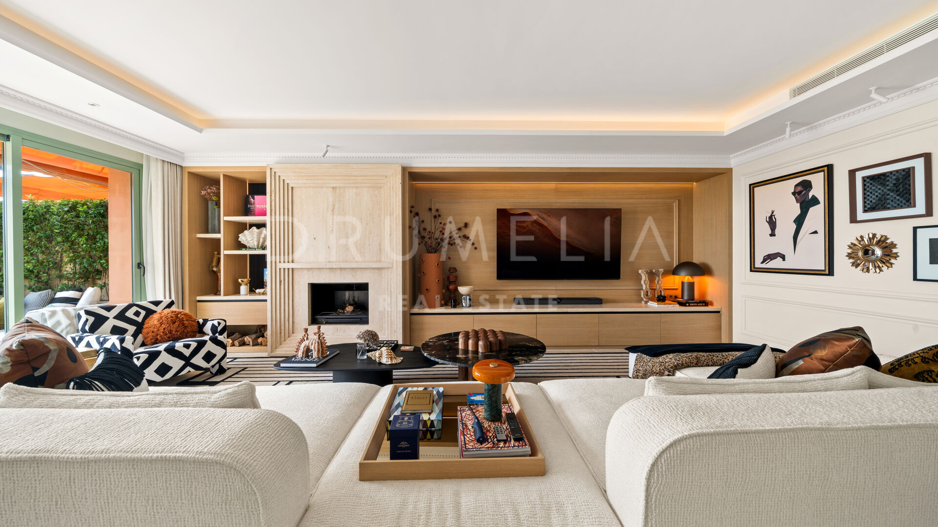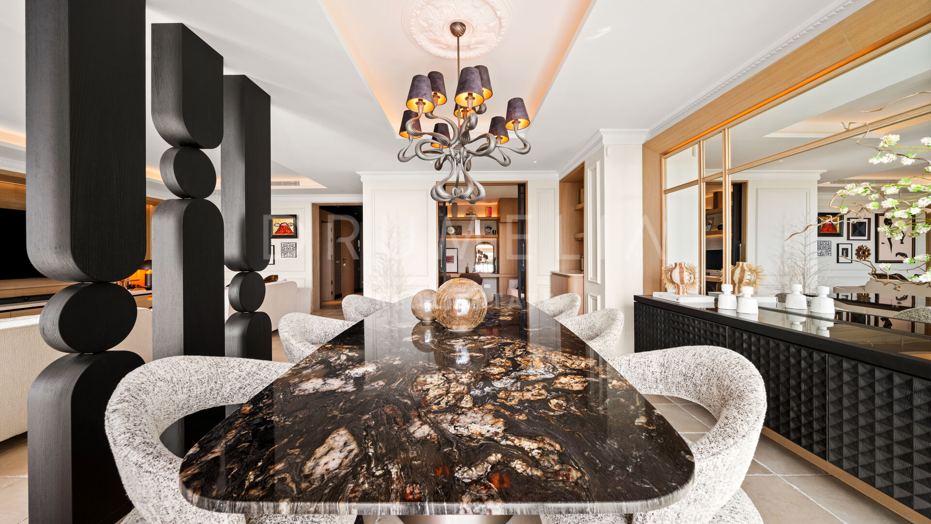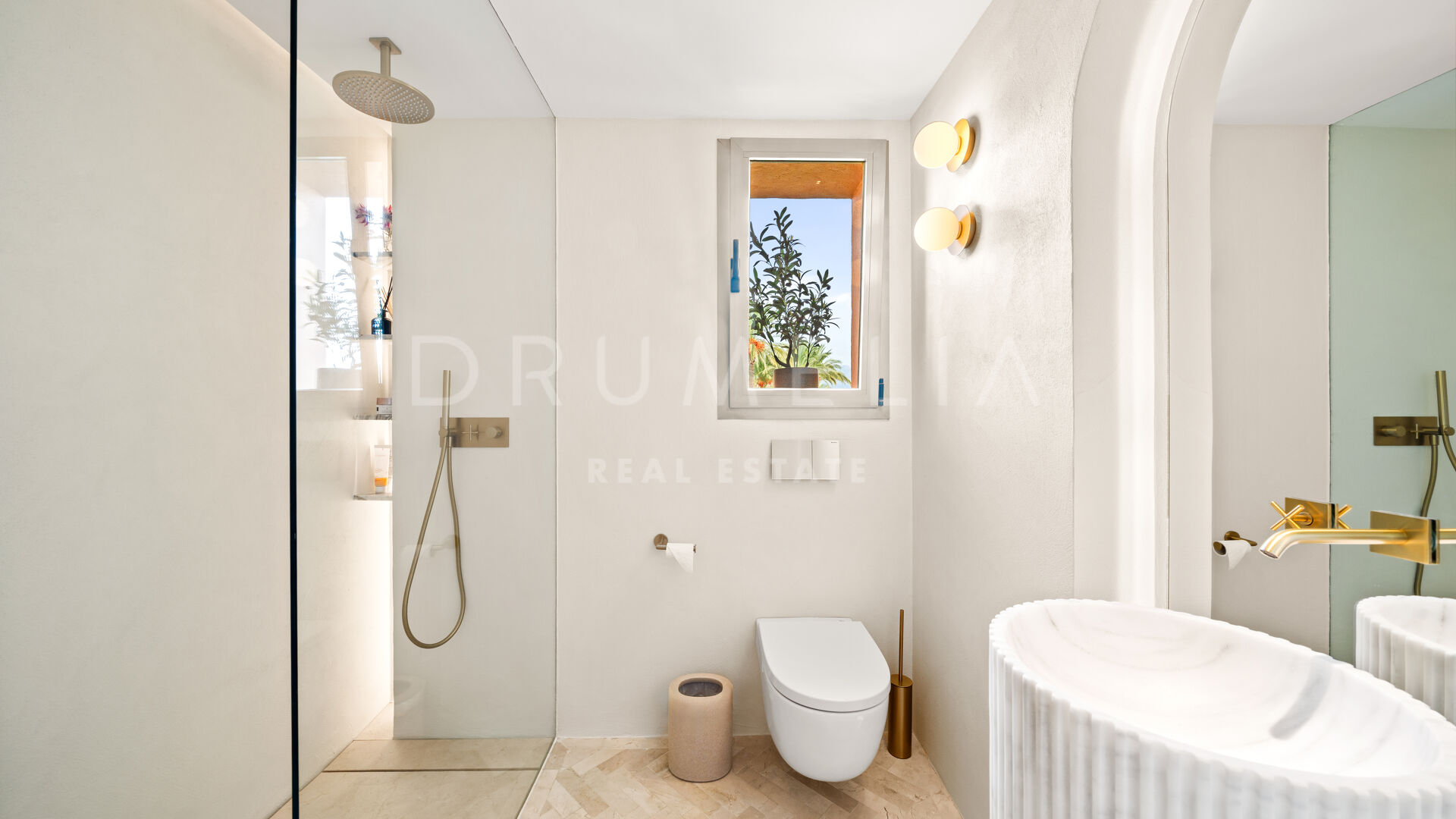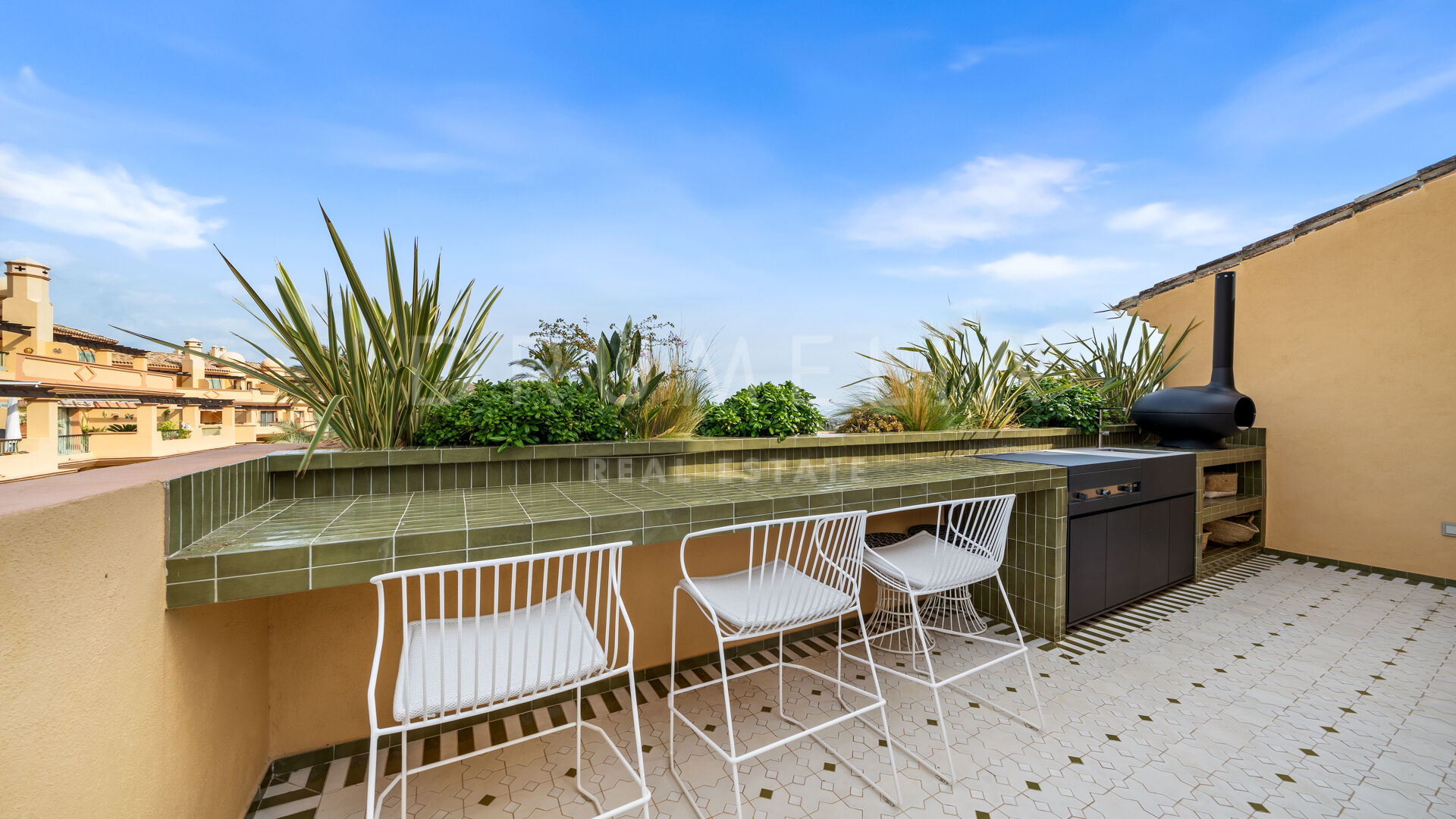 Ten odnowiony dwupoziomowy penthouse znajduje się w Four Seasons, Los Flamingos — prywatnym i bezpiecznym osiedlu znanym z zadbanych ogrodów i bliskości Villa Padierna Golf & Hotel Resort. Lokalizacja łączy spokój i wygodę, a do Puerto Banús i Estepony można dojechać w około 15 minut.