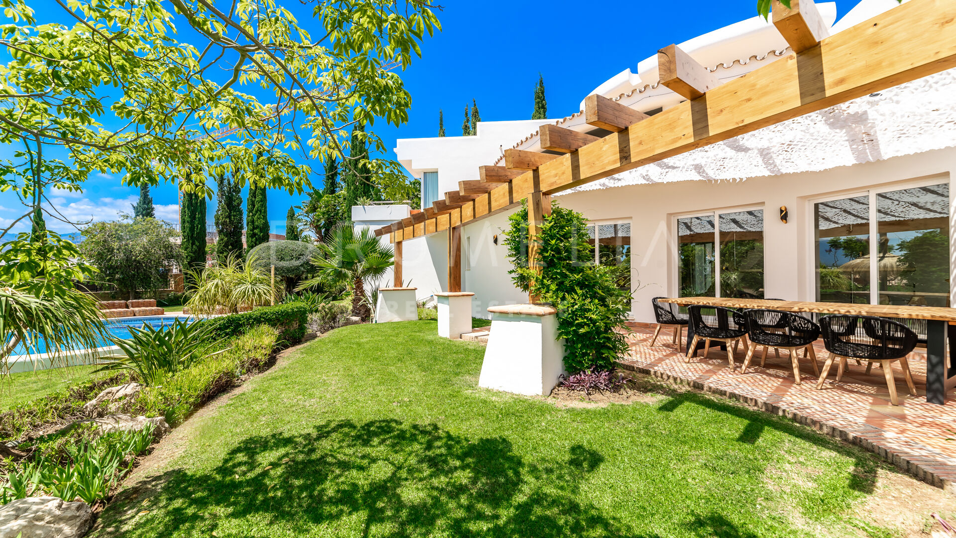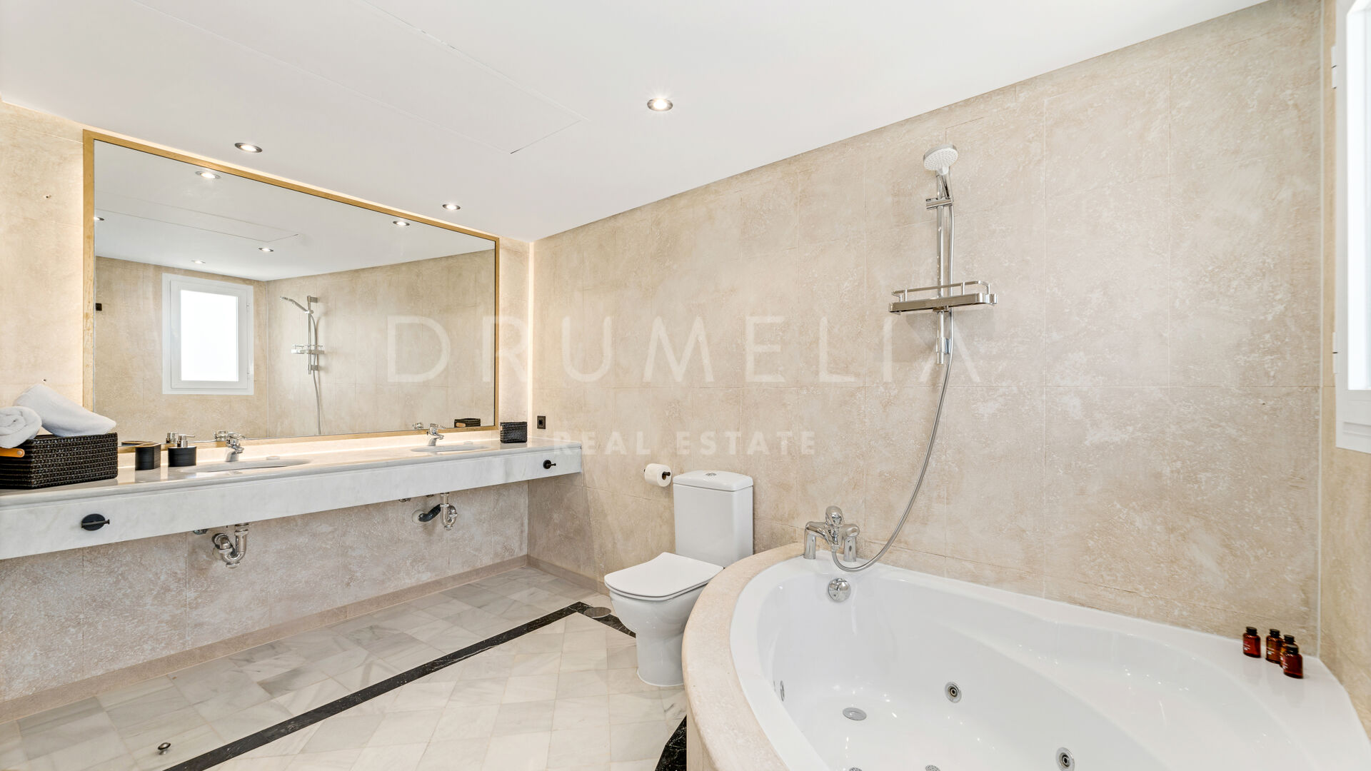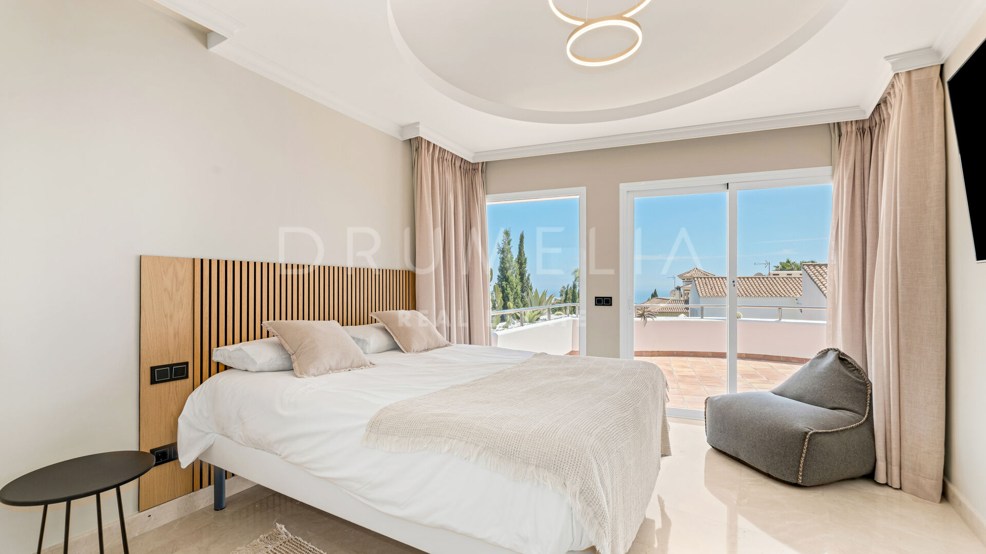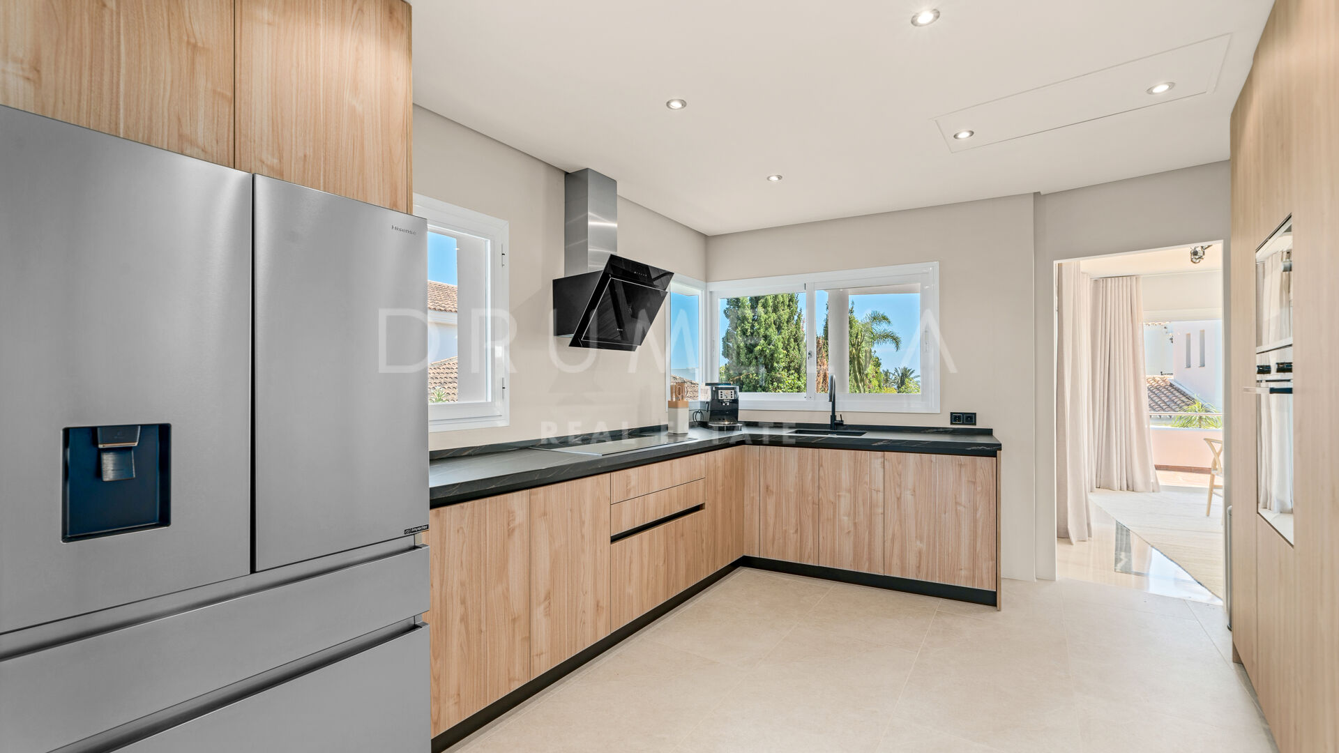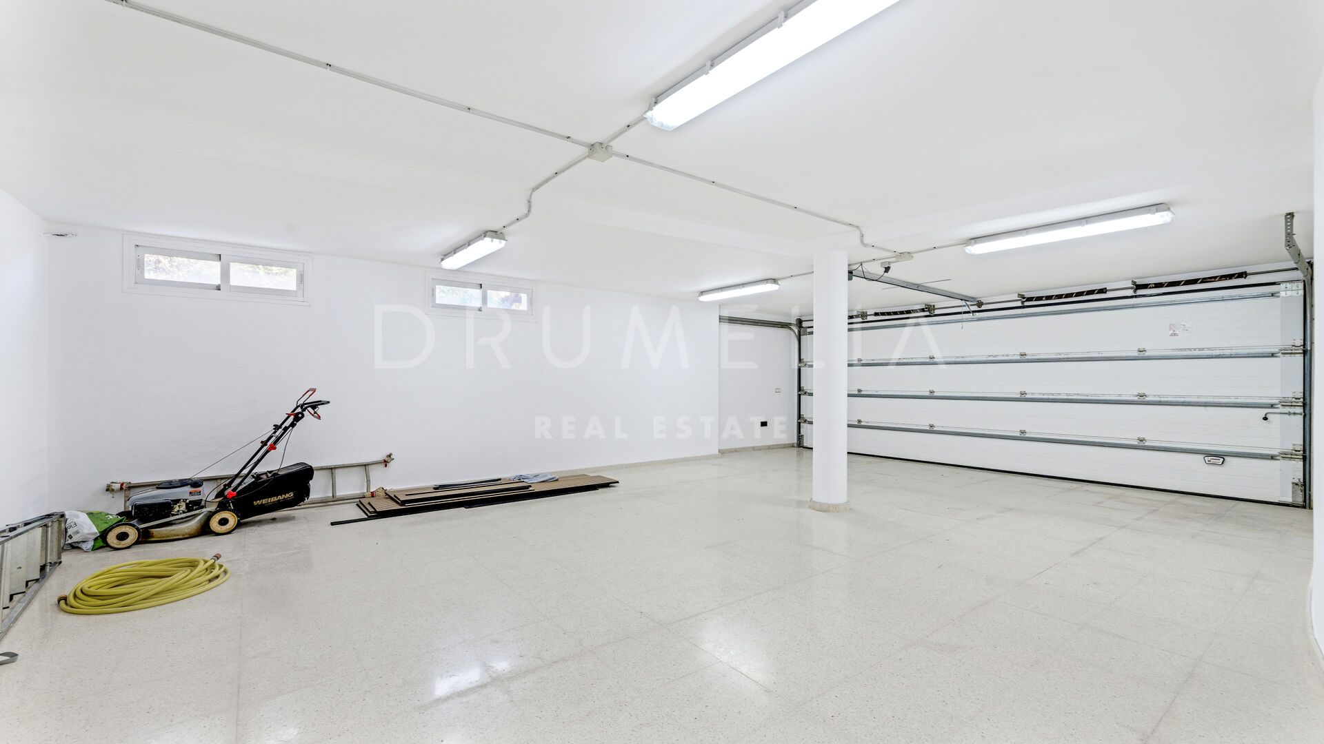 Otoczony piękną przyrodą i podobnymi luksusowymi nieruchomościami w prestiżowej okolicy, dom o powierzchni 613 m² ma działkę o powierzchni 1.383 m² i jest rozmieszczony na 2 poziomach plus piwnica połączona imponującymi schodami w kształcie litery L. Tarasy o powierzchni 112 m² zapewniają prywatność, dzięki czemu mogą Państwo wygodnie odpoczywać, czytać, ćwiczyć i podziwiać niesamowite zachody słońca nad Morzem Śródziemnym. Na parterze o powierzchni 181 m² znajduje się jasny i przestronny salon i jadalnia, 2 duże sypialnie z łazienkami, kuchnia z dostępem do tarasu i ogrodu. Salon został znakomicie urządzony, zapewniając najwyższy poziom komfortu i świetny styl, przy użyciu naturalnych materiałów i miękkich tekstur, aby stworzyć atmosferę spokoju i ciszy. Duże, przeszklone drzwi i okna przyciągają mnóstwo naturalnego światła słonecznego, a przed Państwem rozpościerają się niesamowite widoki. Pokochają Państwo kuchnię, w której można spędzać czas z rodziną, delektować się kawą, lekkimi i nieformalnymi posiłkami. Ma ona dostęp do prywatnego tarasu i ogrodu.