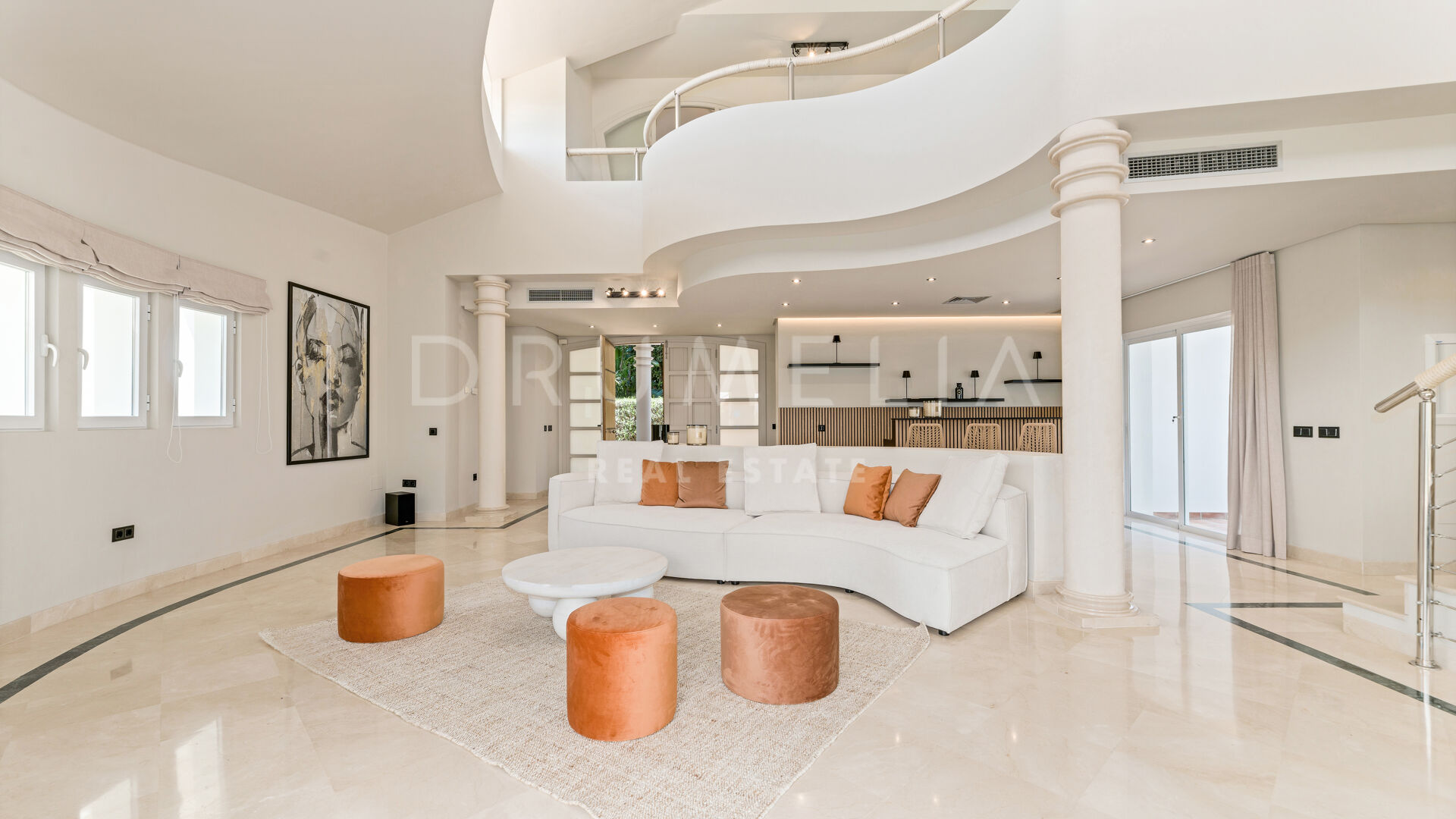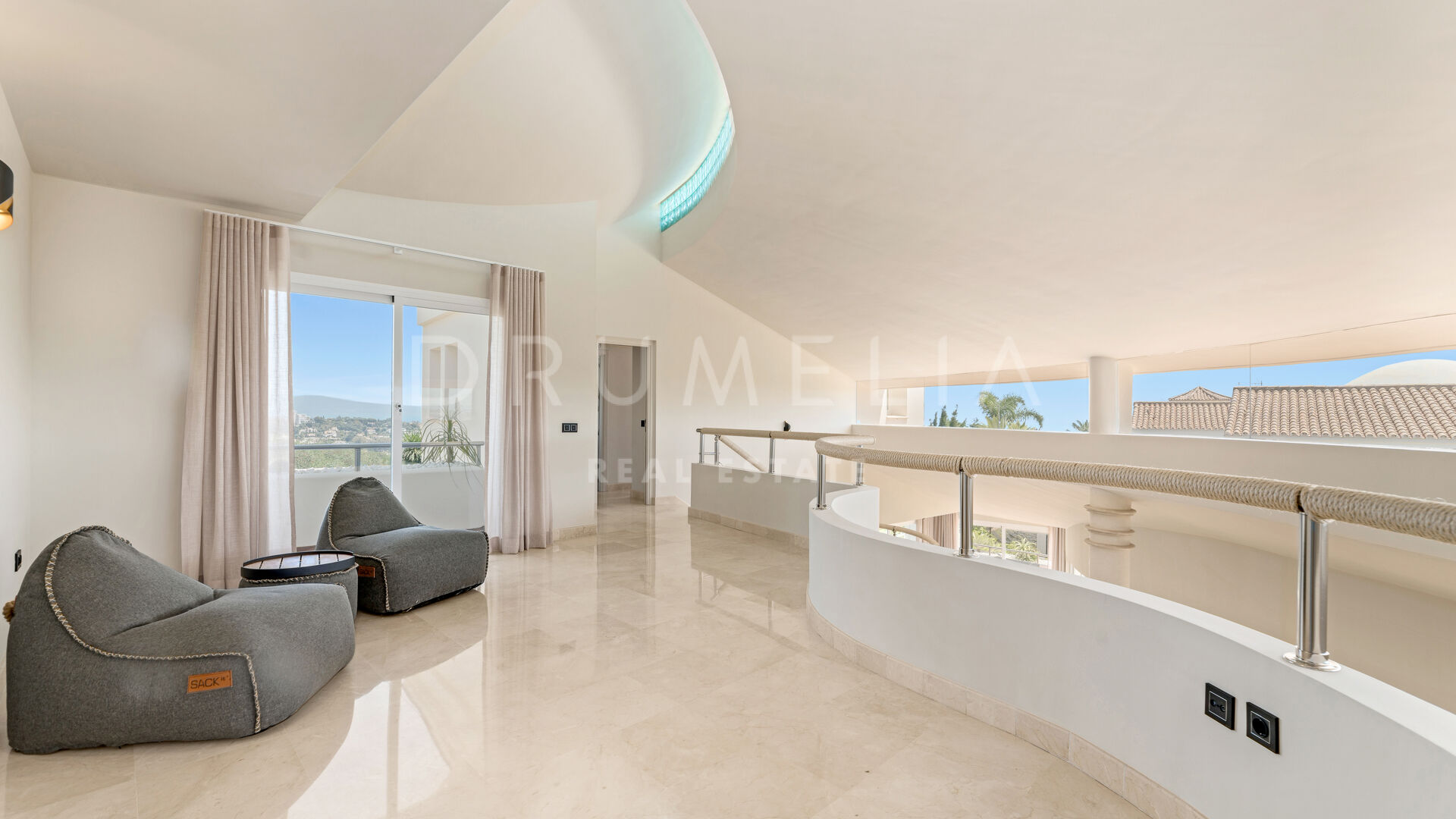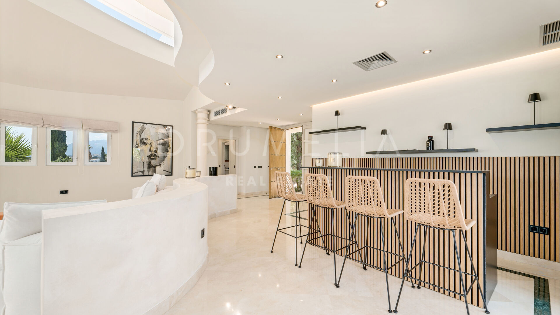 Ta wolnostojąca willa od strony południowo-zachodniej na sprzedaż w renomowanej dzielnicy mieszkalnej Los Flamingos Golf, Benahavis, została zaprojektowana z maksymalną dbałością o każdy szczegół, aby rozpieszczać Państwa zmysły. Cieszy się imponującymi widokami na Morze Śródziemne oraz atmosferą ciszy i spokoju, z łatwym dostępem do plaży, pól golfowych i najlepszych opcji rekreacyjnych i gastronomicznych Costa del Sol oraz 15 15 minut jazdy od centrów Marbelli i Estepony.
