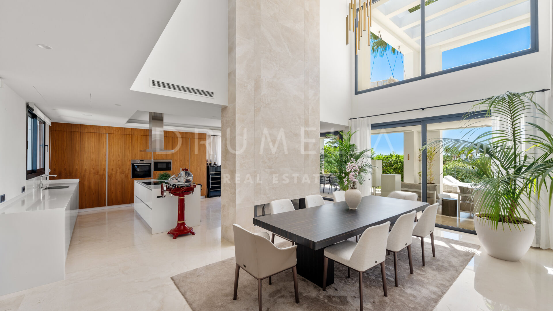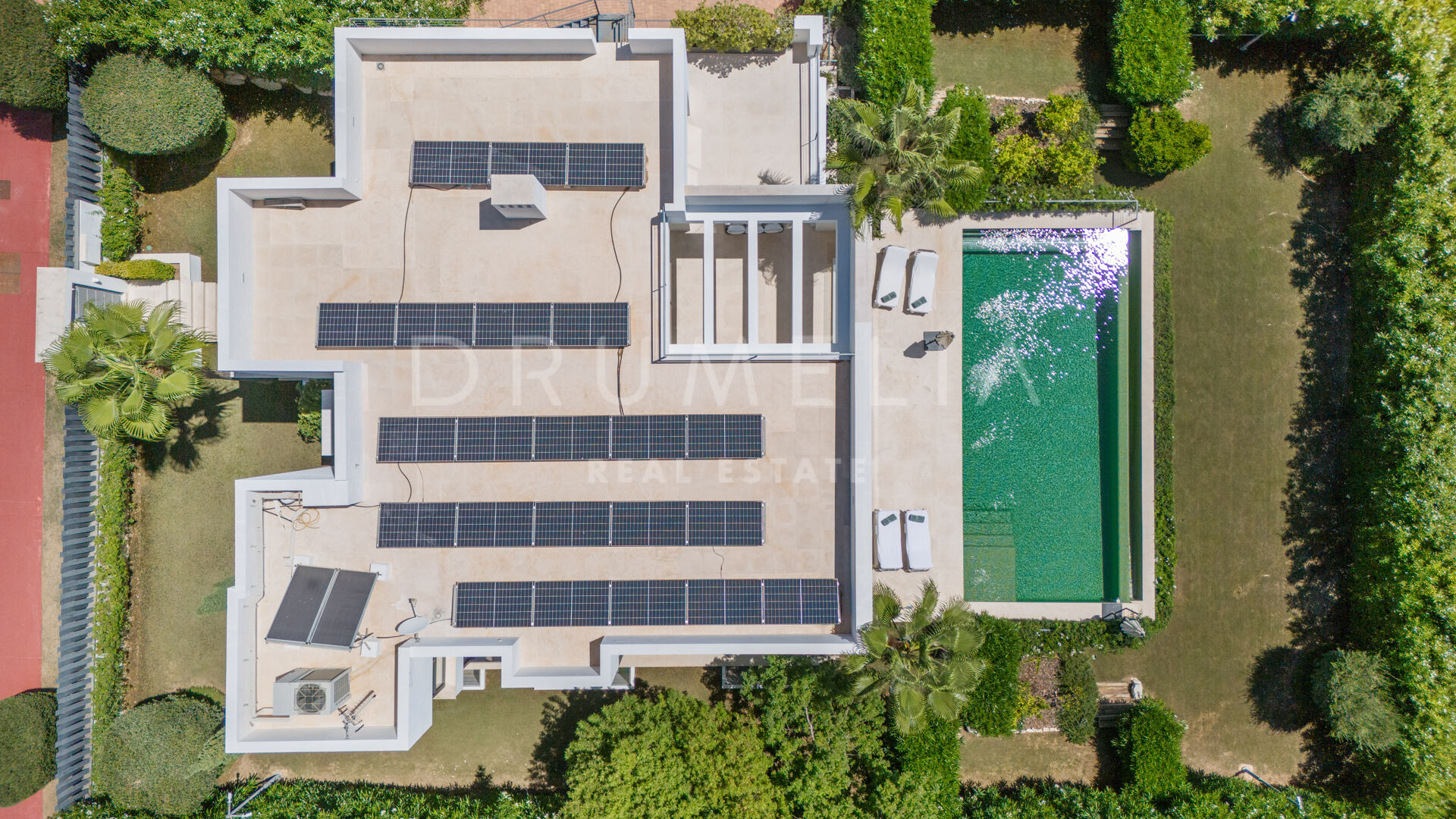 Ta willa o powierzchni 659 m² znajduje się na działce o powierzchni 1 438 m² i posiada około 163 m² rozległych tarasów. Wspaniałe wejście prezentuje sufit o podwójnej wysokości, tworząc przestronną i przestronną atmosferę. Część dzienna na otwartym planie została zaprojektowana tak, aby zmaksymalizować naturalne światło, z rozległymi i jasnymi przestrzeniami, w tym dużą, w pełni wyposażoną kuchnią i przestronną jadalnią idealną do przyjmowania gości. Każda z pięciu sypialni posiada własną łazienkę, zapewniając najwyższy komfort i prywatność.