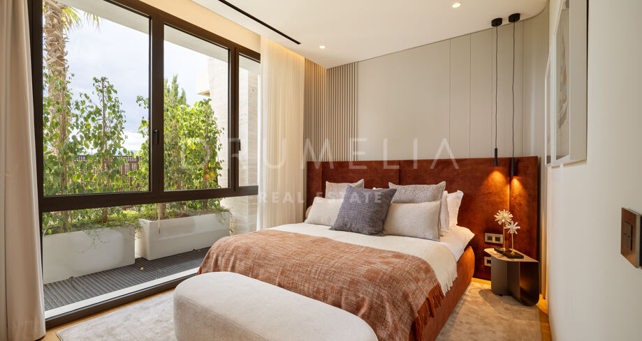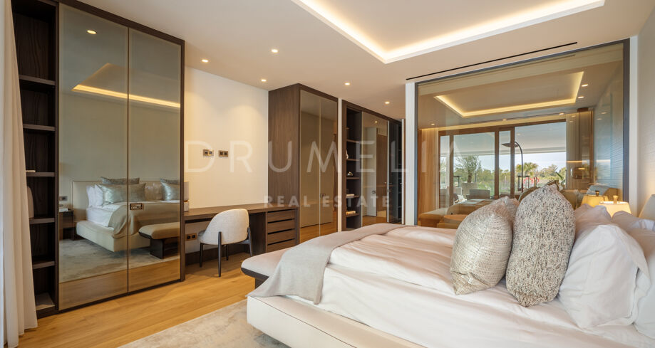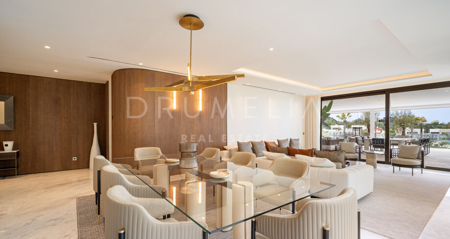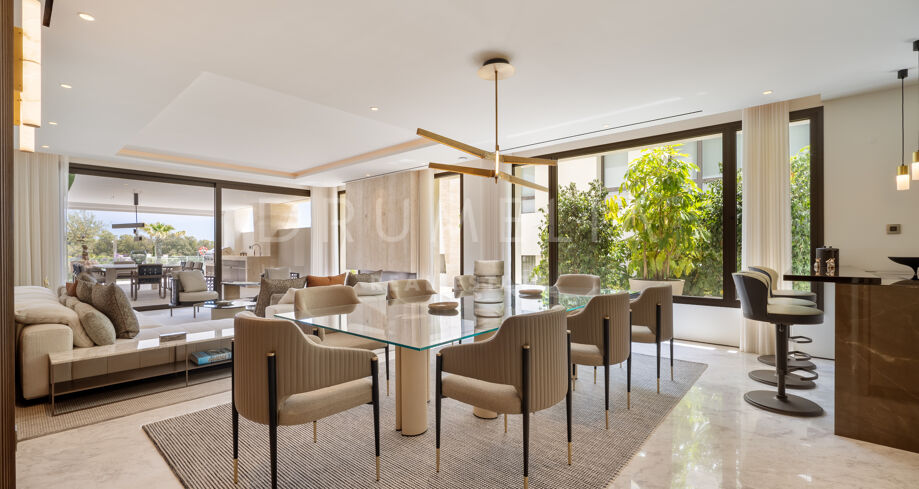 Apartament dwupoziomowy na parterze zaprojektowany przez FENDI CASA z prywatną strefą rozrywki na Złotej Mili w Marbelli