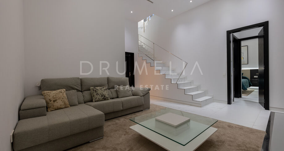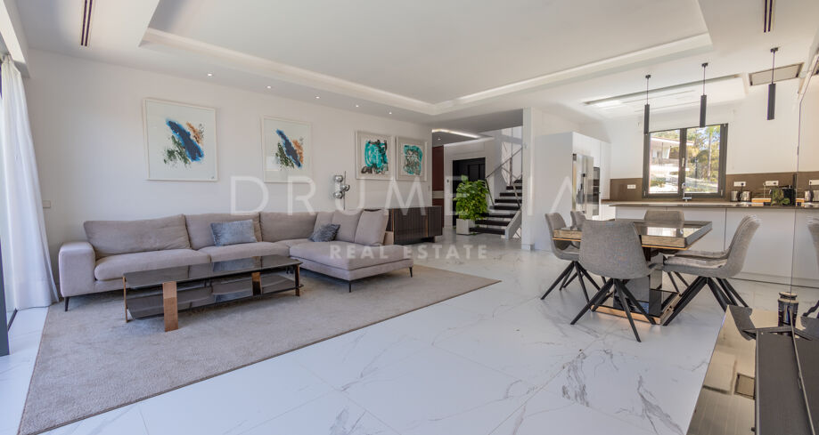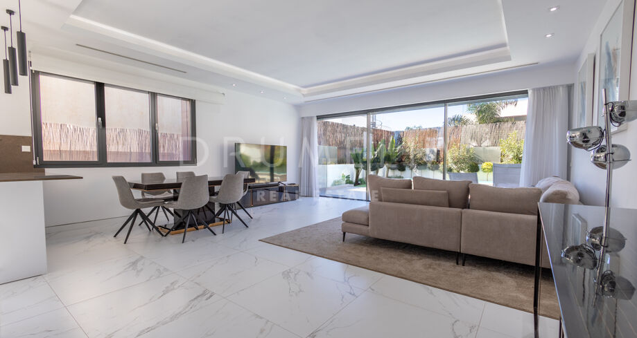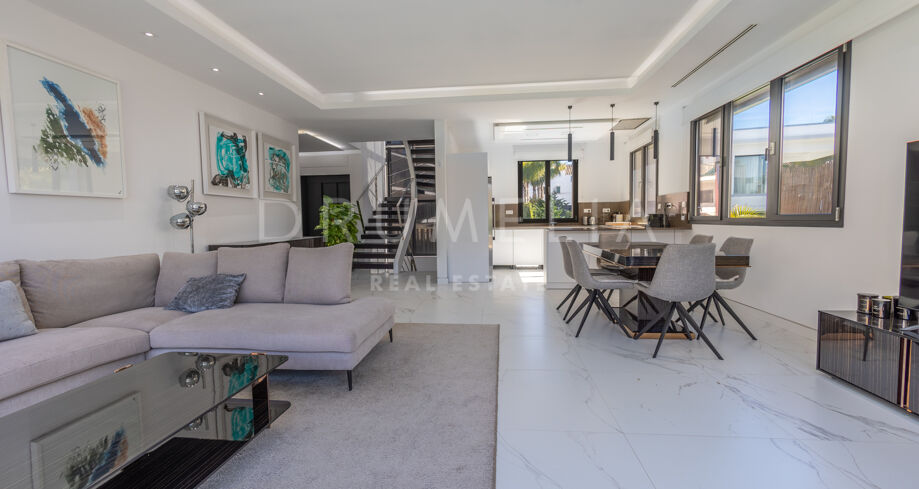 Ta urocza willa położona jest zaledwie 250 metrów od plaży Rio Verde, w prestiżowej dzielnicy Marbella Golden Mile i zaledwie 10 minut spacerem od tętniącego życiem Puerto Banús. Jego doskonała lokalizacja jest idealna, aby cieszyć się tętniącym życiem stylem życia Puerto Banús lub cieszyć się spokojnym rodzinnym wypoczynkiem. Plaża Río Verde jest jedną z najpopularniejszych plaż w Marbelli. Rozciąga się na około 1500 metrów linii brzegowej i ma około 40 metrów szerokości.