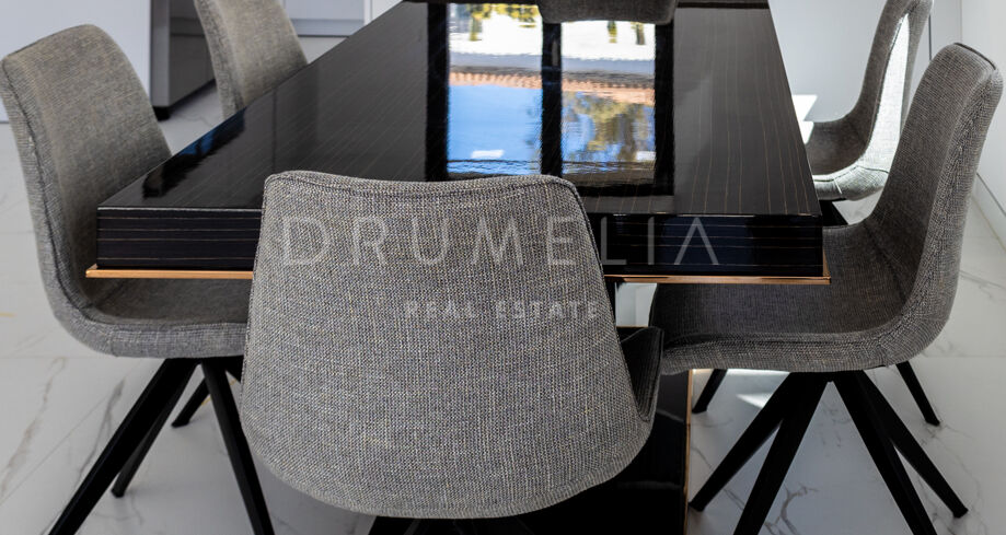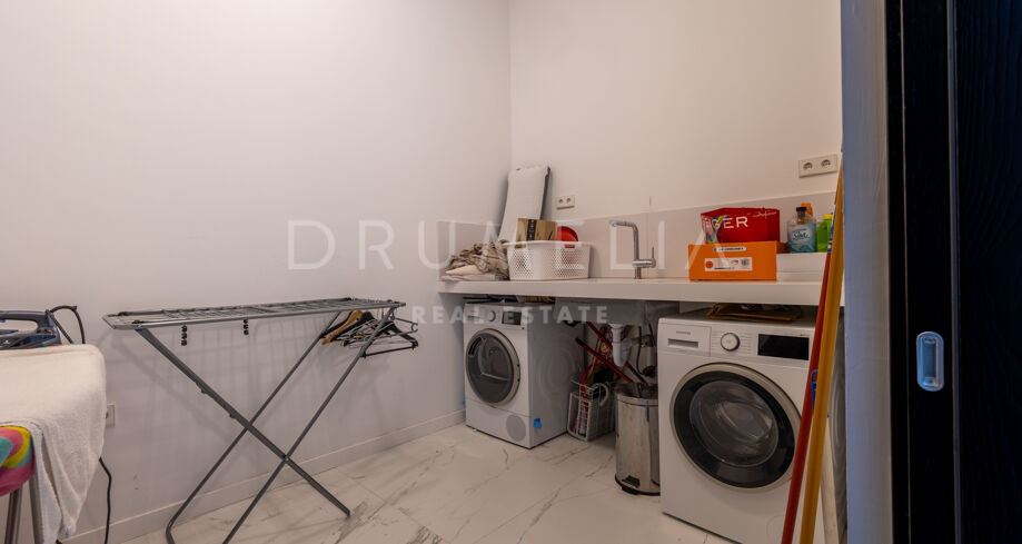 Wewnątrz willa jest nieskazitelnie urządzona zgodnie z najwyższymi standardami, oferując wszystko, czego potrzeba do luksusowego pobytu, w tym najwyższej jakości pościel, przybory kuchenne, suszarki do włosów, wiele telewizorów i dużą salę kinową. Wygodna winda łączy wszystkie piętra, od piwnicy z dostępem do prywatnego garażu na 2-3 samochody, przez pierwsze i drugie piętro, aż po taras na dachu, gdzie można zrelaksować się w jacuzzi lub skorzystać z miejsca do grillowania.