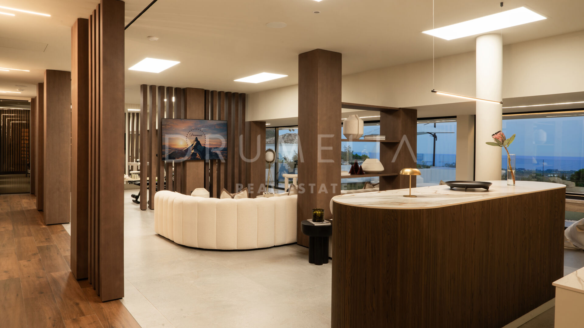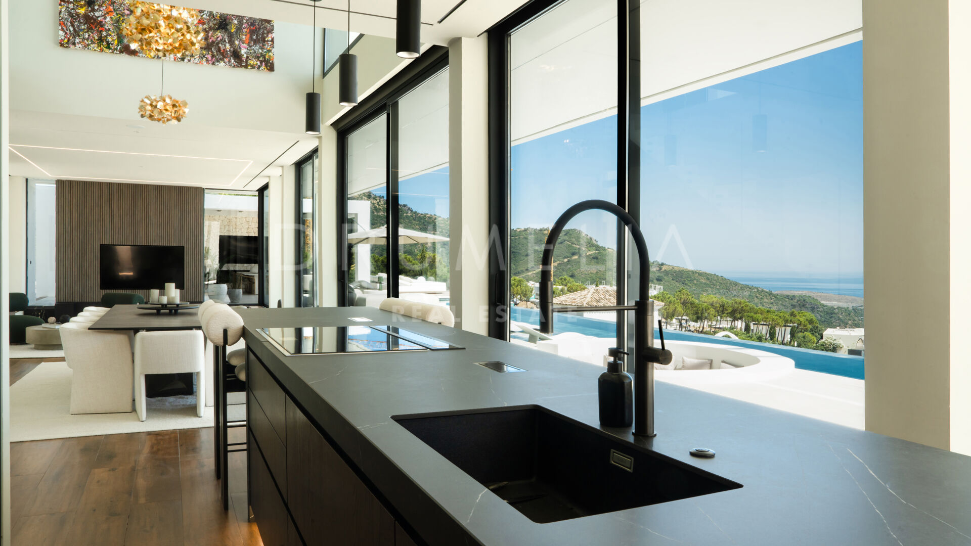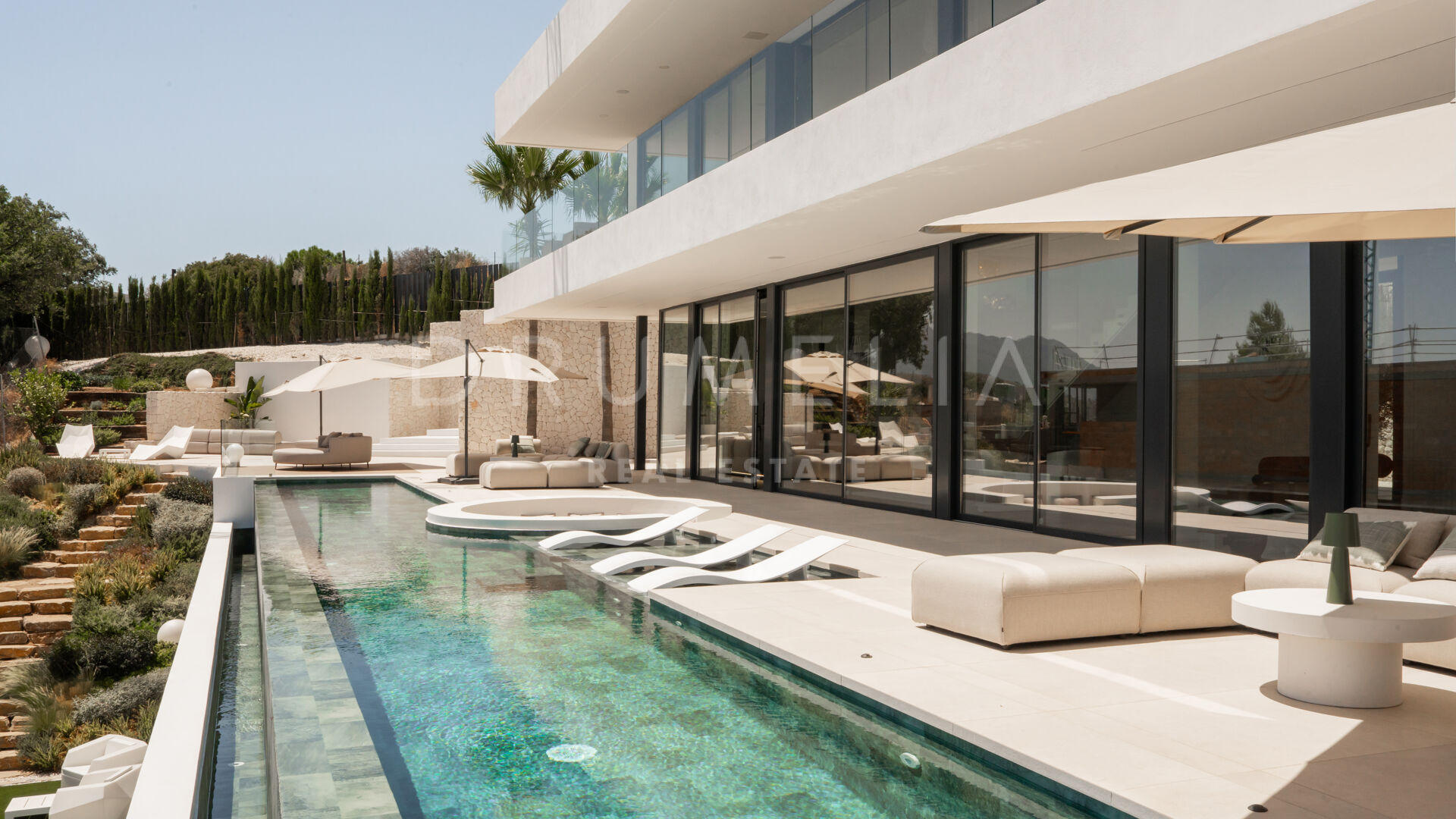 Na działce o powierzchni 2.068 m² znajduje się 872 m² powierzchni zabudowanej, zaprojektowanej z myślą o maksymalnym komforcie, świetle i prywatności. Główna kondygnacja obejmuje przestronne wnętrza typu open space z panoramicznymi oknami od podłogi do sufitu, które otwierają widok na Morze Śródziemne i okoliczne góry. Obniżony salon i jadalnia z podwójną wysokością podkreślają nowoczesny charakter willi, a inteligentny system sterowania zapewnia pełną kontrolę nad klimatem, oświetleniem i bezpieczeństwem.