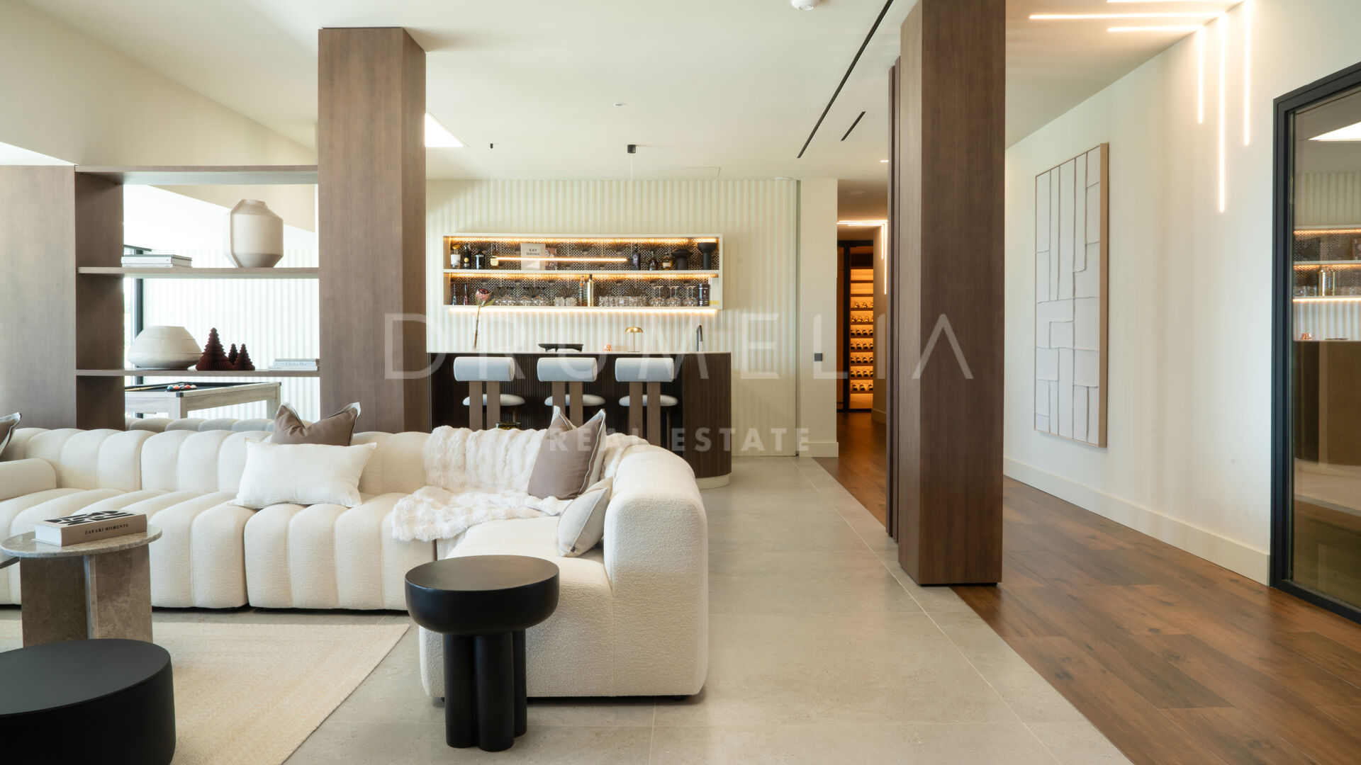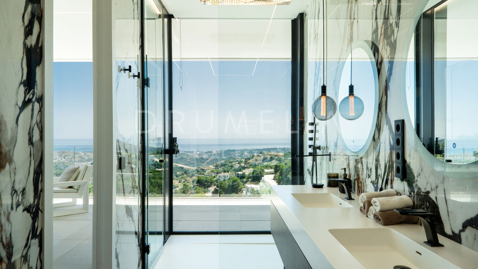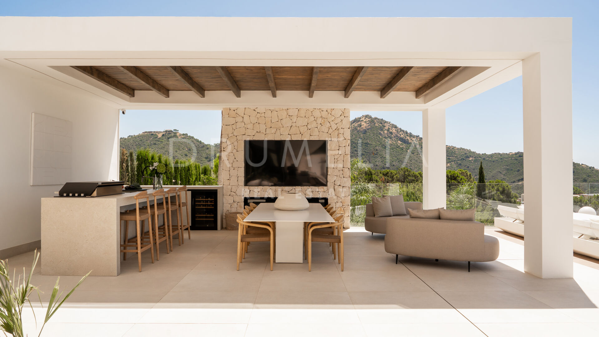 Na działce o powierzchni 2.068 m² znajduje się 872 m² powierzchni zabudowanej, zaprojektowanej z myślą o maksymalnym komforcie, świetle i prywatności. Główna kondygnacja obejmuje przestronne wnętrza typu open space z panoramicznymi oknami od podłogi do sufitu, które otwierają widok na Morze Śródziemne i okoliczne góry. Obniżony salon i jadalnia z podwójną wysokością podkreślają nowoczesny charakter willi, a inteligentny system sterowania zapewnia pełną kontrolę nad klimatem, oświetleniem i bezpieczeństwem.