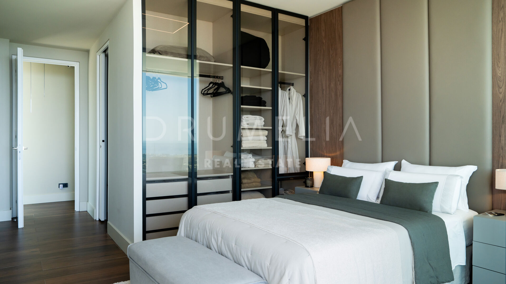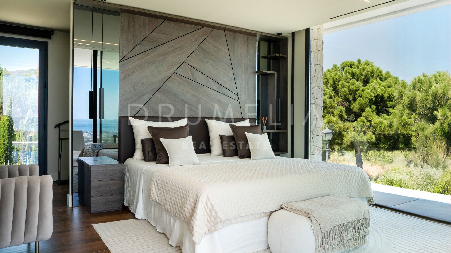 Rezydencja oferuje cztery przestronne sypialnie z łazienkami en-suite, każda z prywatnym tarasem, zabudowanymi szafami na wymiar i najwyższej jakości wykończeniami. Łącznie willa dysponuje pięcioma pełnymi łazienkami i trzema dodatkowymi toaletami gościnnymi.