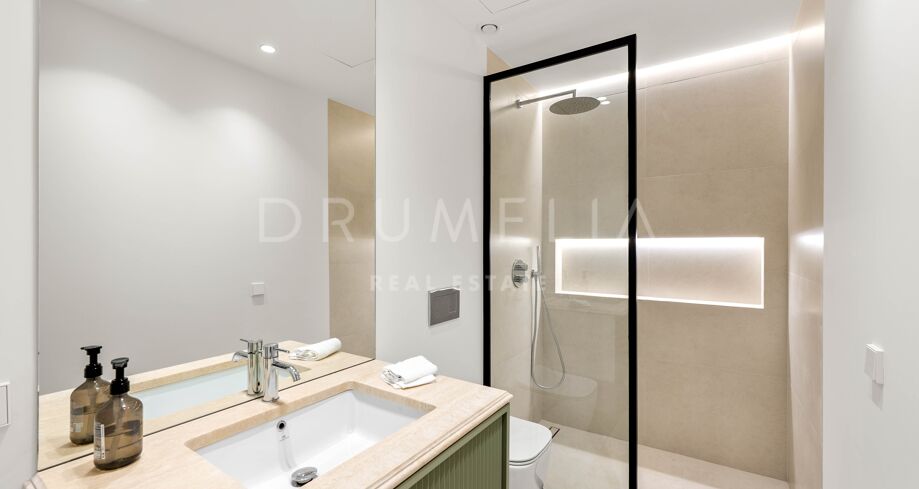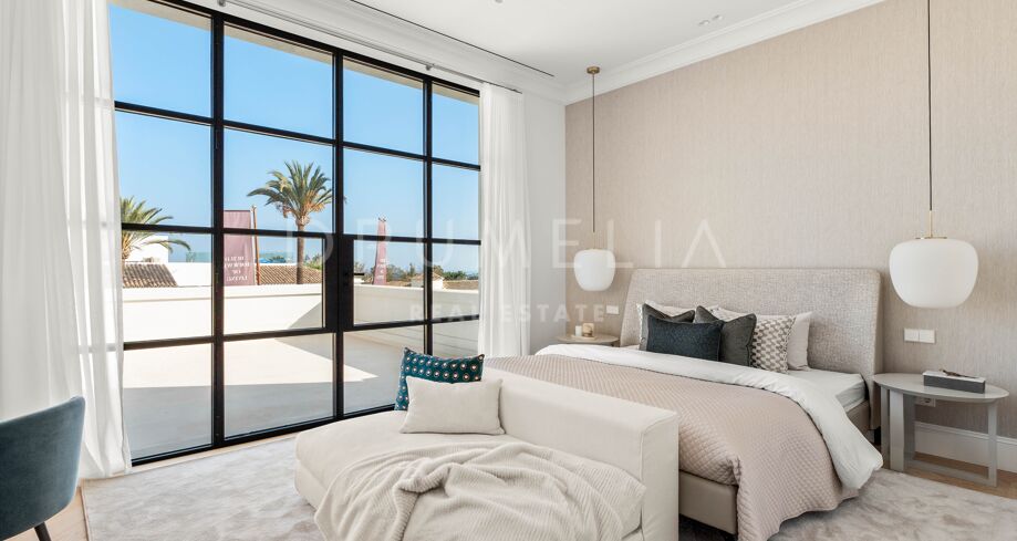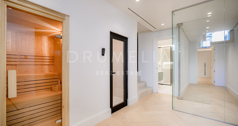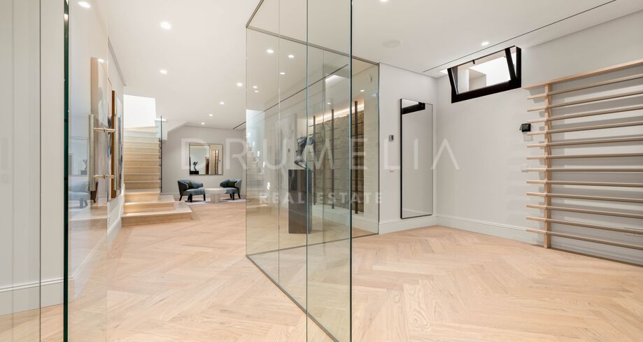 Wewnątrz willi znajdują się wysokie sufity i dobrze wyposażona kuchnia wyposażona w wysokiej jakości urządzenia i dużo miejsca do przechowywania, rozciągająca się na zewnętrzną część wypoczynkową i miejsce do grillowania dla wszechstronnych doznań kulinarnych. Wystrój wnętrz charakteryzuje się neutralnymi tonami i wysokiej jakości estetyką, z pięcioma sypialniami rozmieszczonymi na trzech poziomach. Główny apartament, klejnot na pierwszym piętrze, oferuje bogate meble, skomplikowany wystrój wnętrz i wysokiej jakości stolarkę, podczas gdy dodatkowe sypialnie zapewniają zapierające dech w piersiach widoki na ogród krajobrazowy.