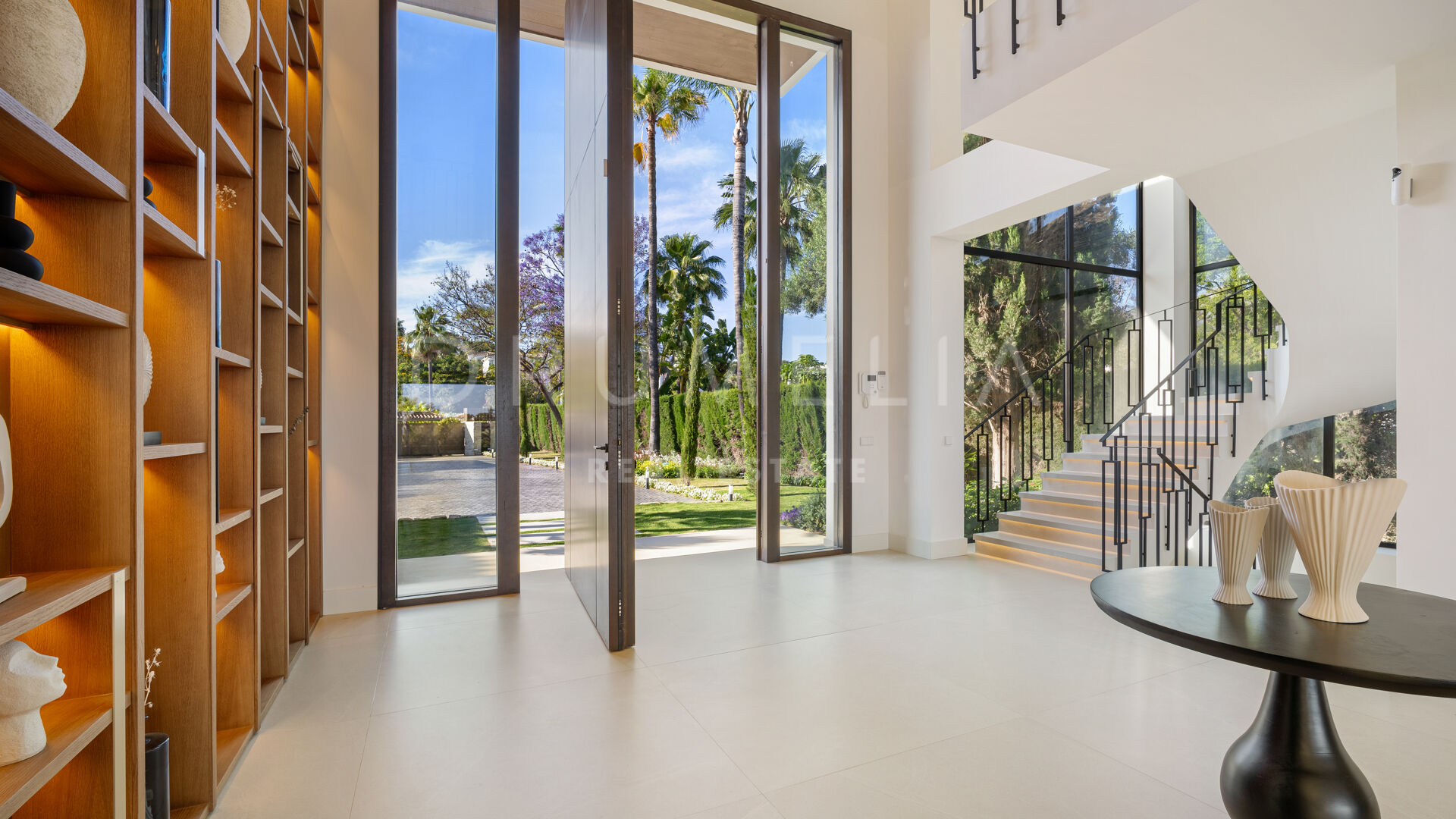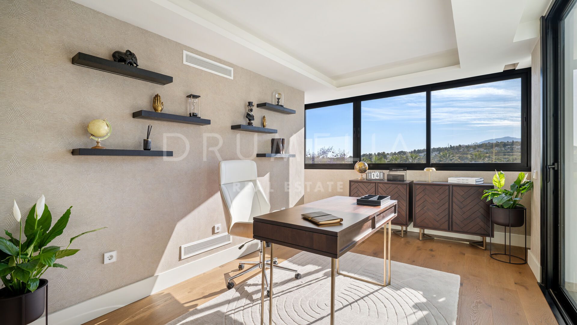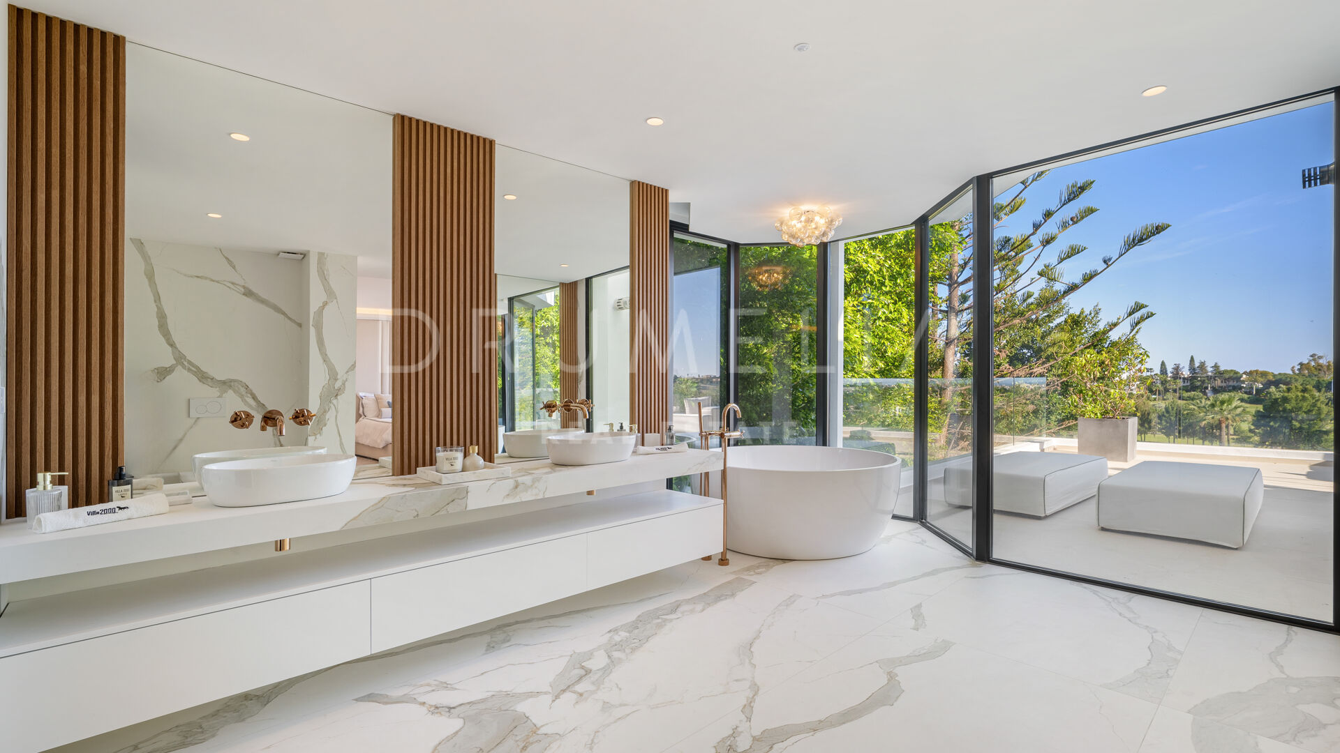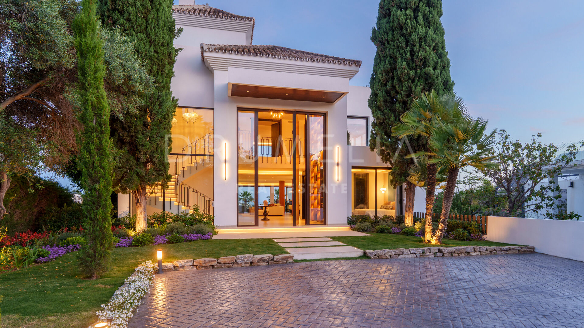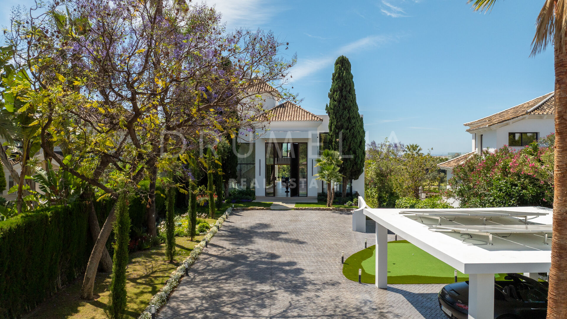 Ta wyjątkowa willa zachwyca unikalną architekturą i najwyższą jakością wykonania. Położona na prywatnej działce w strzeżonej urbanizacji, oferuje zapierające dech w piersiach widoki na pole golfowe Los Naranjos. Znajduje się zaledwie kilka minut od restauracji, centrów sportowych, plaży i Puerto Banús.