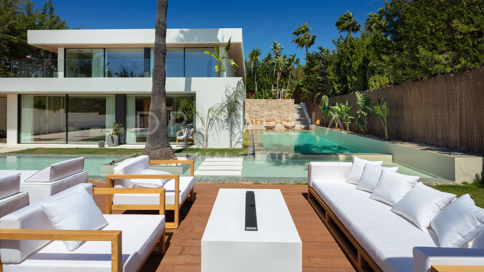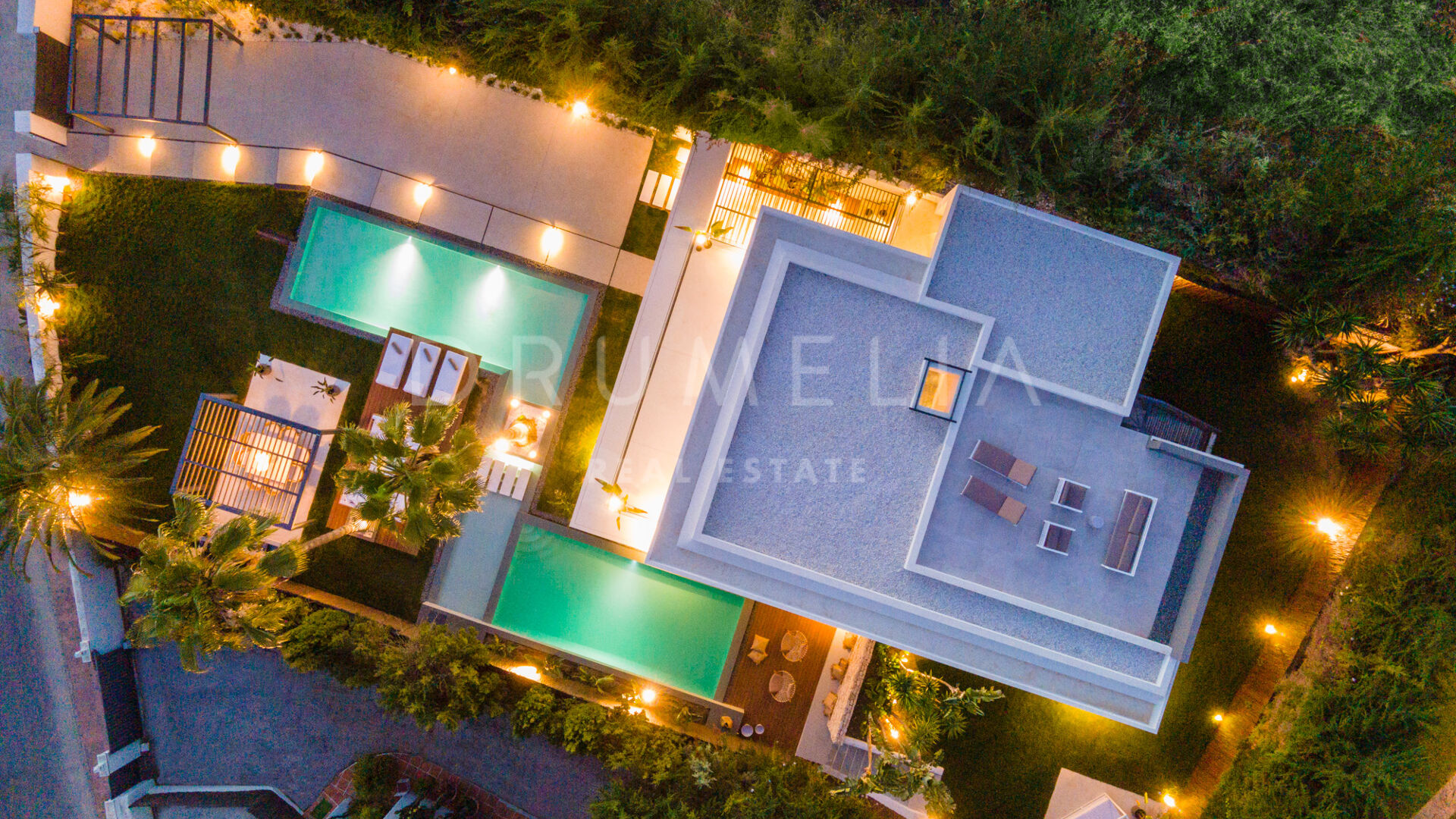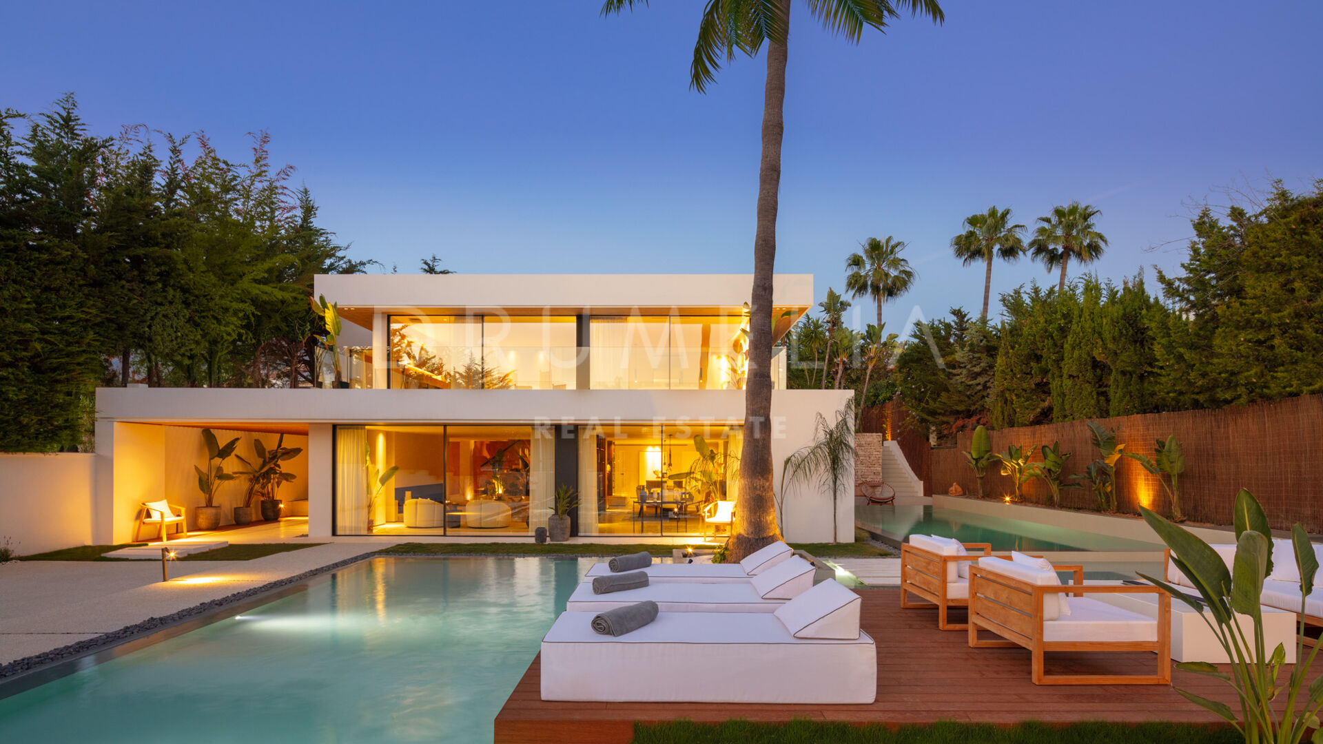 Poznaj wyjątkową, nowoczesną willę w samym sercu Nueva Andalucía, Marbella – gdzie nowoczesna architektura spotyka się z eleganckim komfortem w jednej z najbardziej prestiżowych lokalizacji na Costa del Sol. Na działce o powierzchni 1 038 m² znajduje się stylowa nieruchomość z czterema przestronnymi sypialniami i czterema eleganckimi łazienkami wykończonymi z najwyższą starannością.